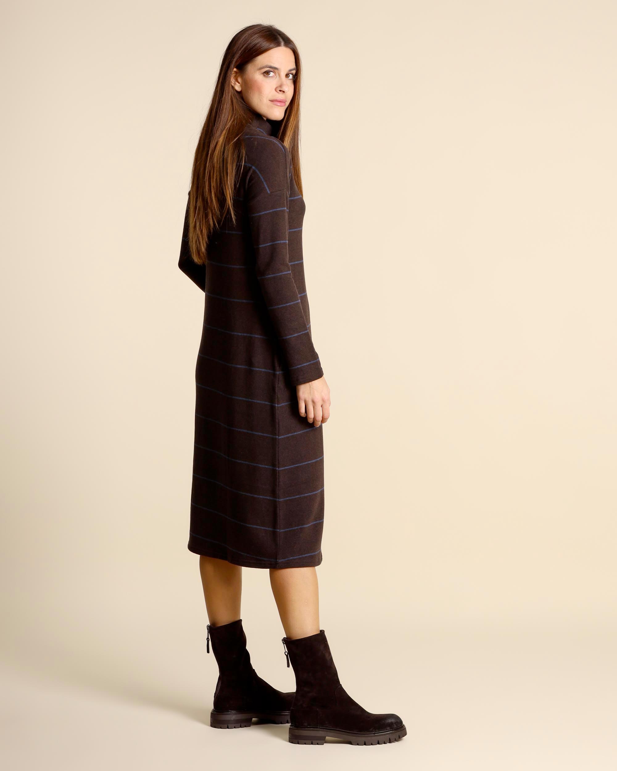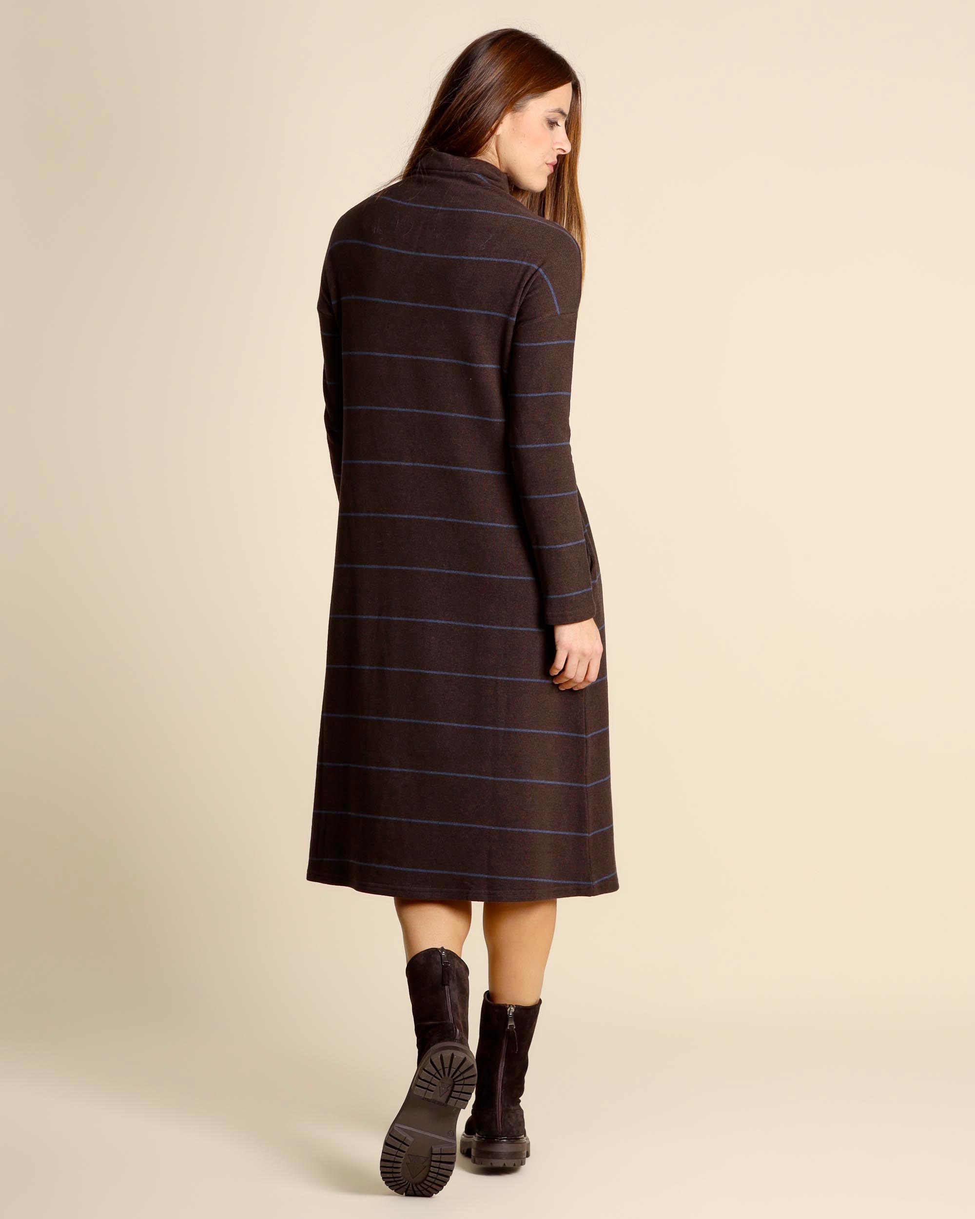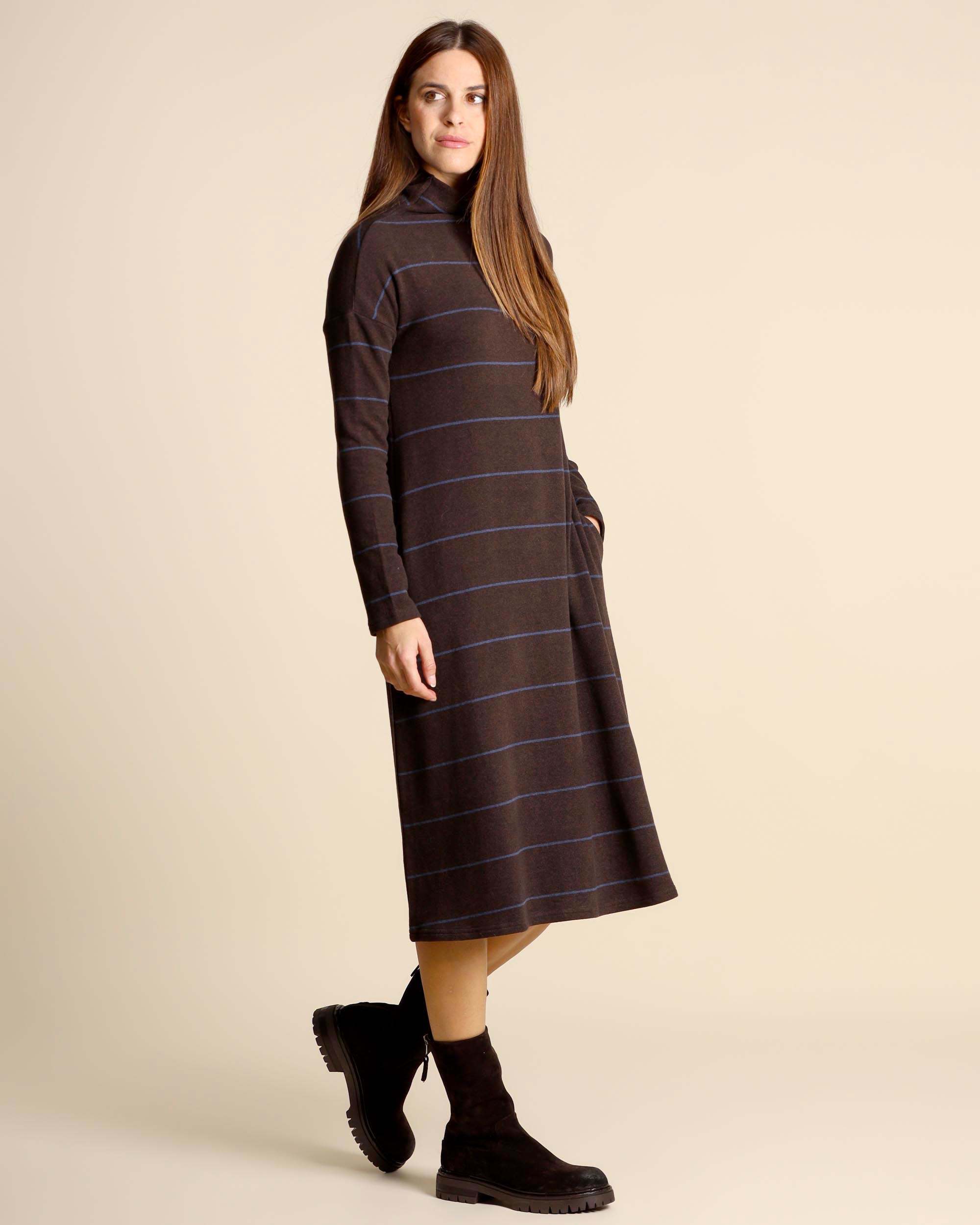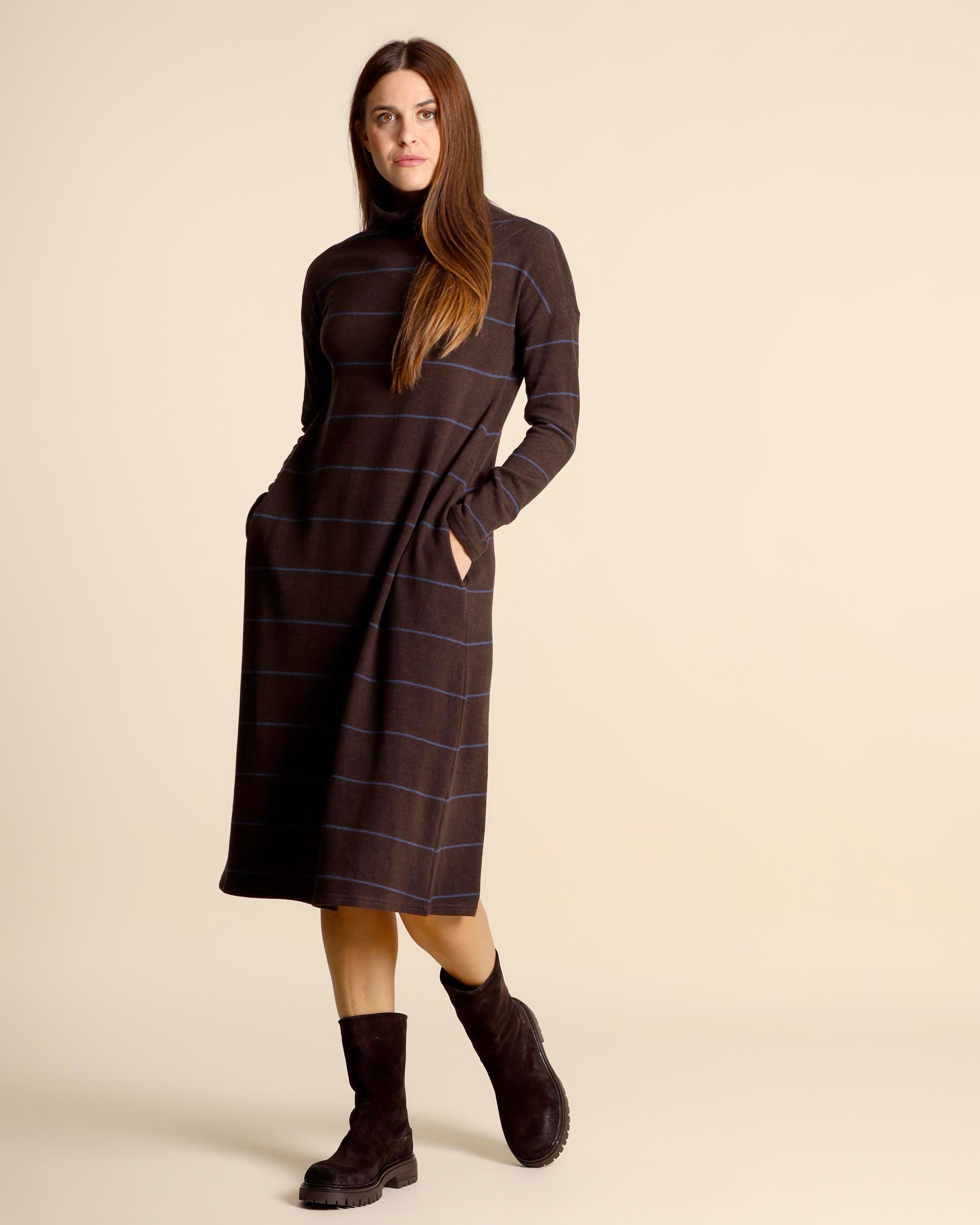 Abito lungo in maglia di misto cotone stretch marrone con riga bluette, collo a cratere, maniche lunghe, sfoderato, tasche inserite nei fianchi, linea leggermente svasata, made in Italy, la modella indossa una tg.S, la modella ha le seguenti misure: altezza 177, seno 87,vita 65, fianchi 93, collezione donna Neirami Autunno Inverno 2025/26