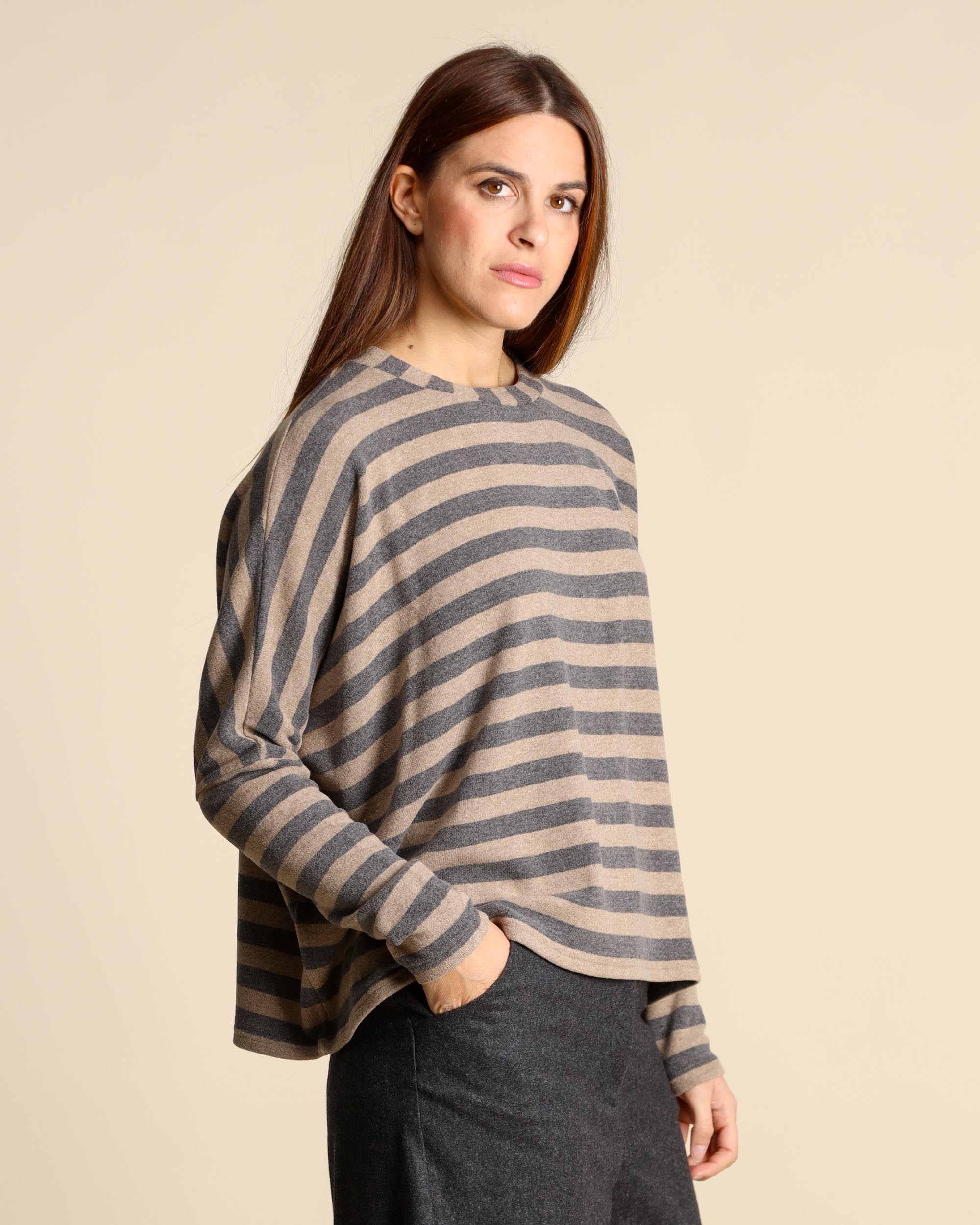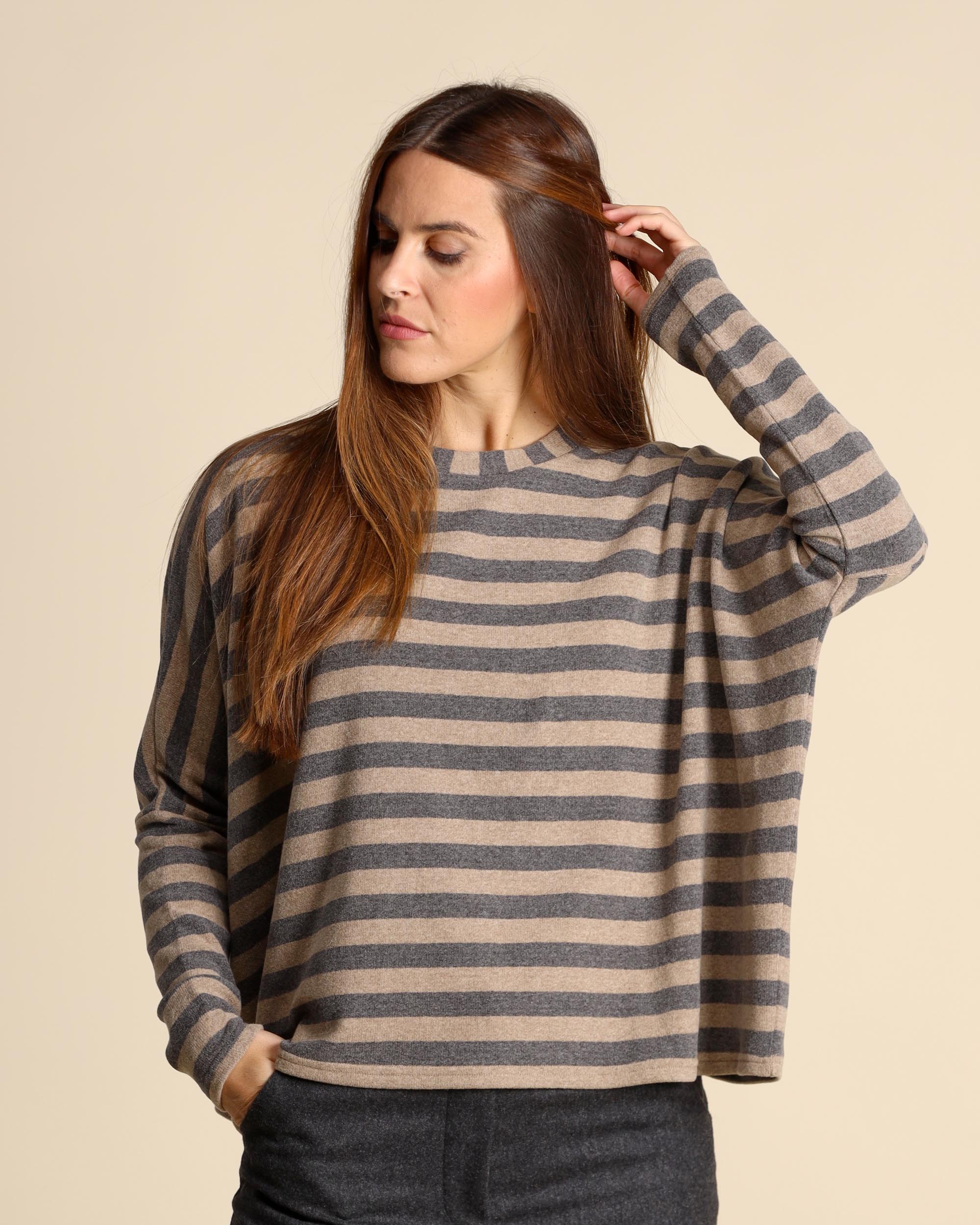 Maglia in jersey di misto cotone stretch grigio e beige a righe, scollo tondo, maniche lunghe, linea ampia, made in Italy, la modella indossa una tg.S, la modella ha le seguenti misure: altezza 177, seno 87,vita 65, fianchi 93, collezione donna Neirami Autunno Inverno 2025/26