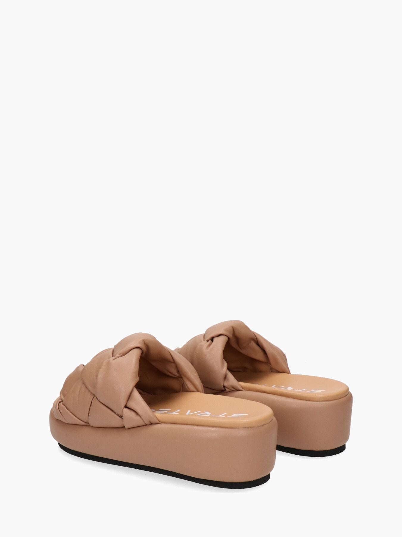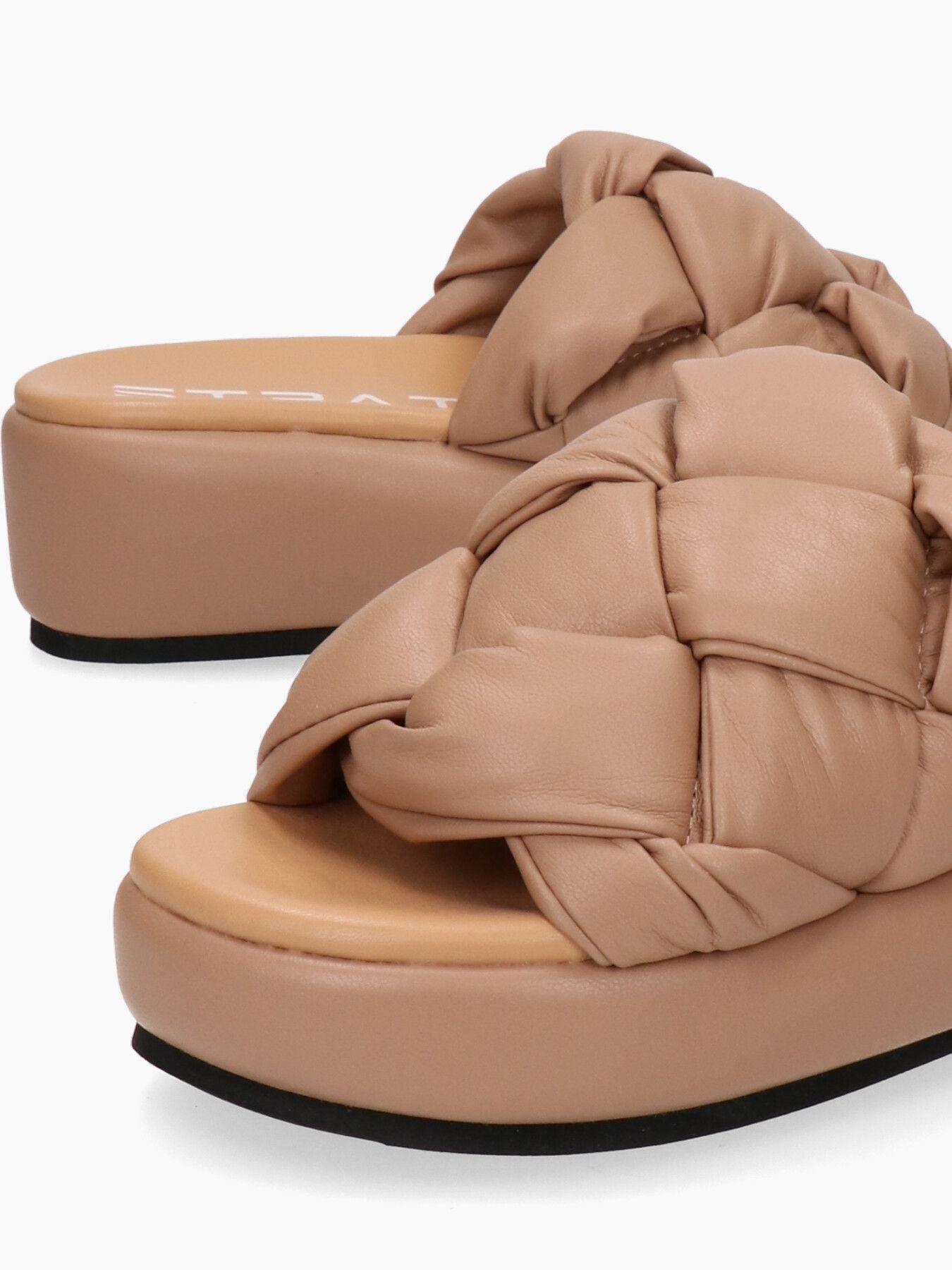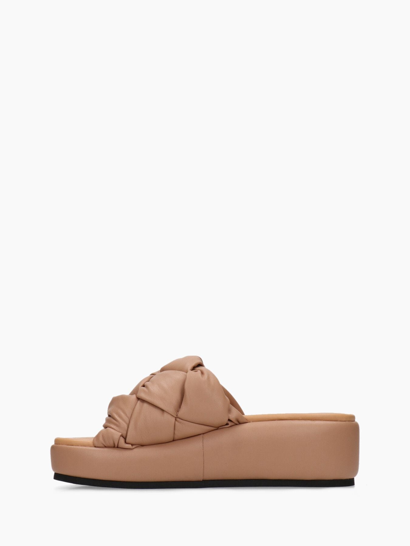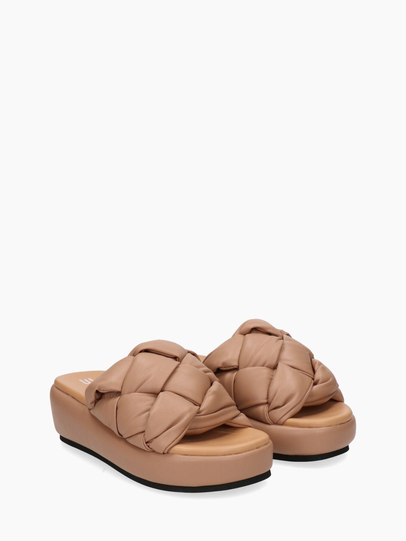 Sandali imbottiti in pelle beige ed ecopelle, fascia intrecciata, suola in gomma, zeppa imbottita 50mm, sottopiede in pelle, punta tonda, comodo e super imbottito, lavorazione artigianale, collezione donna Strategia Primavera Estate 2021