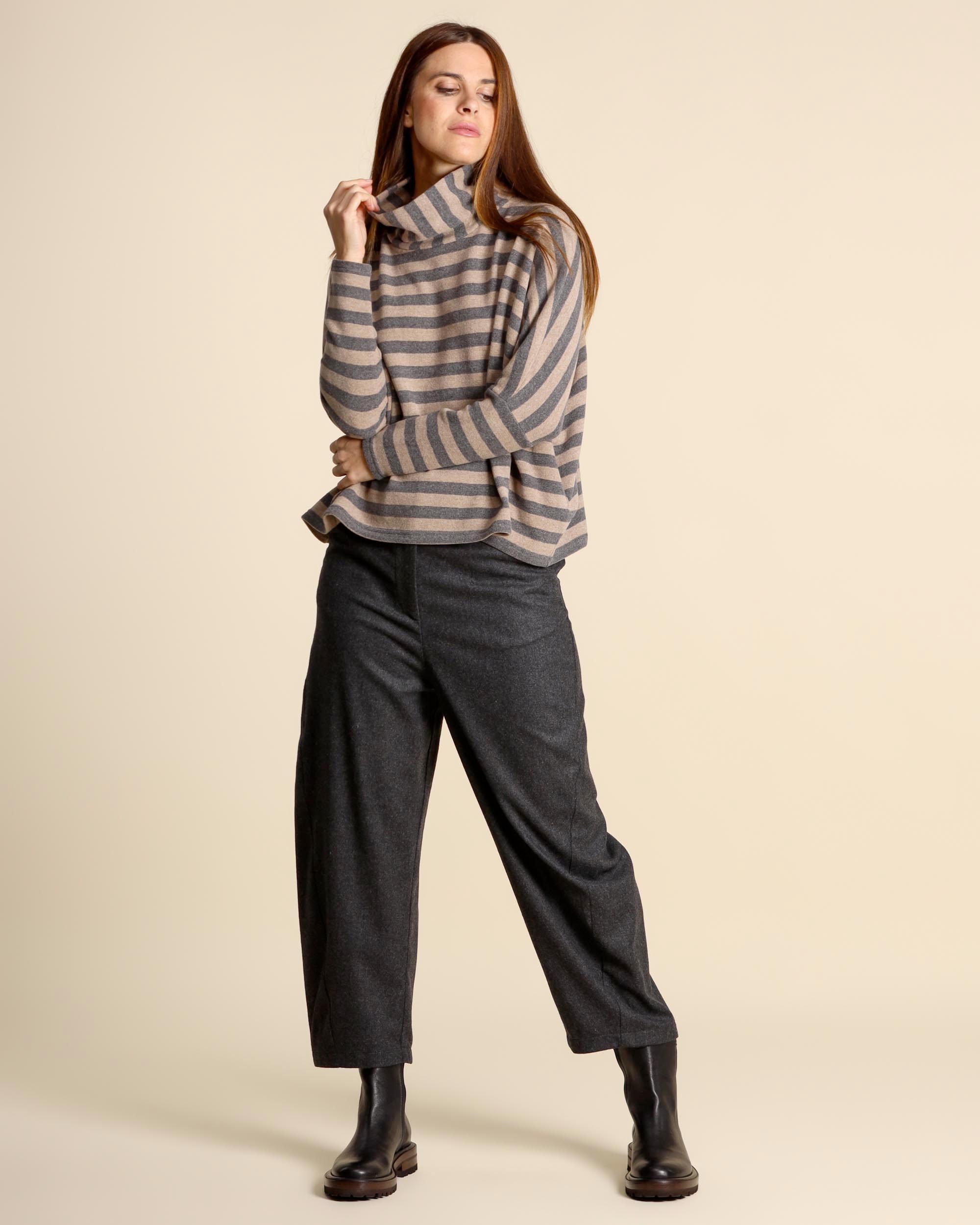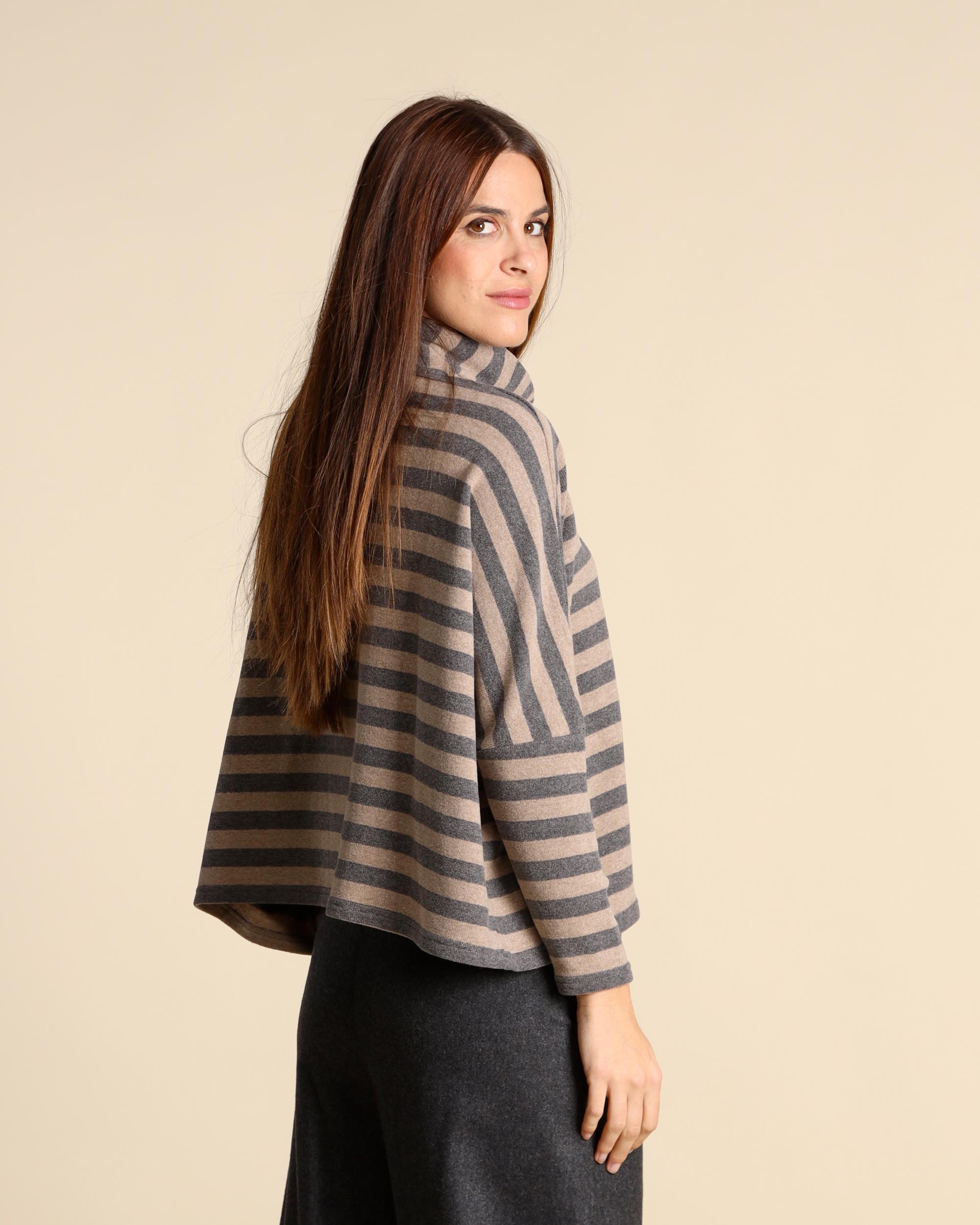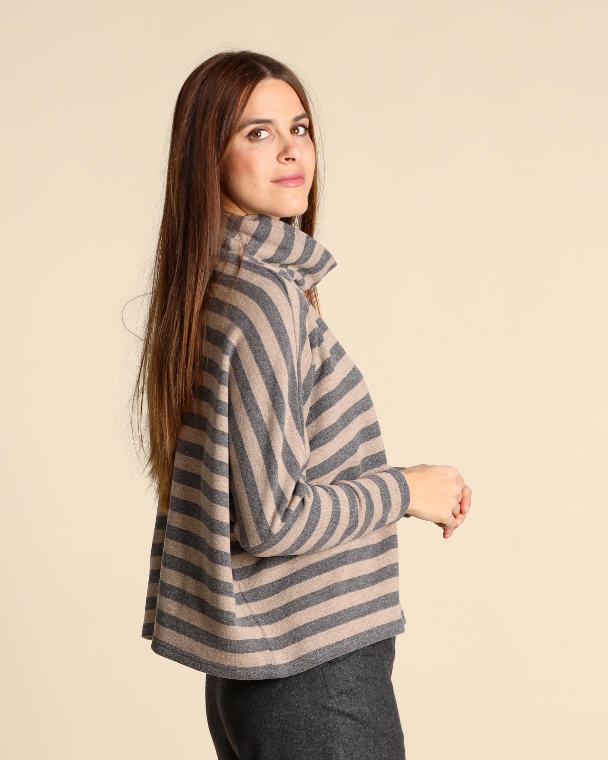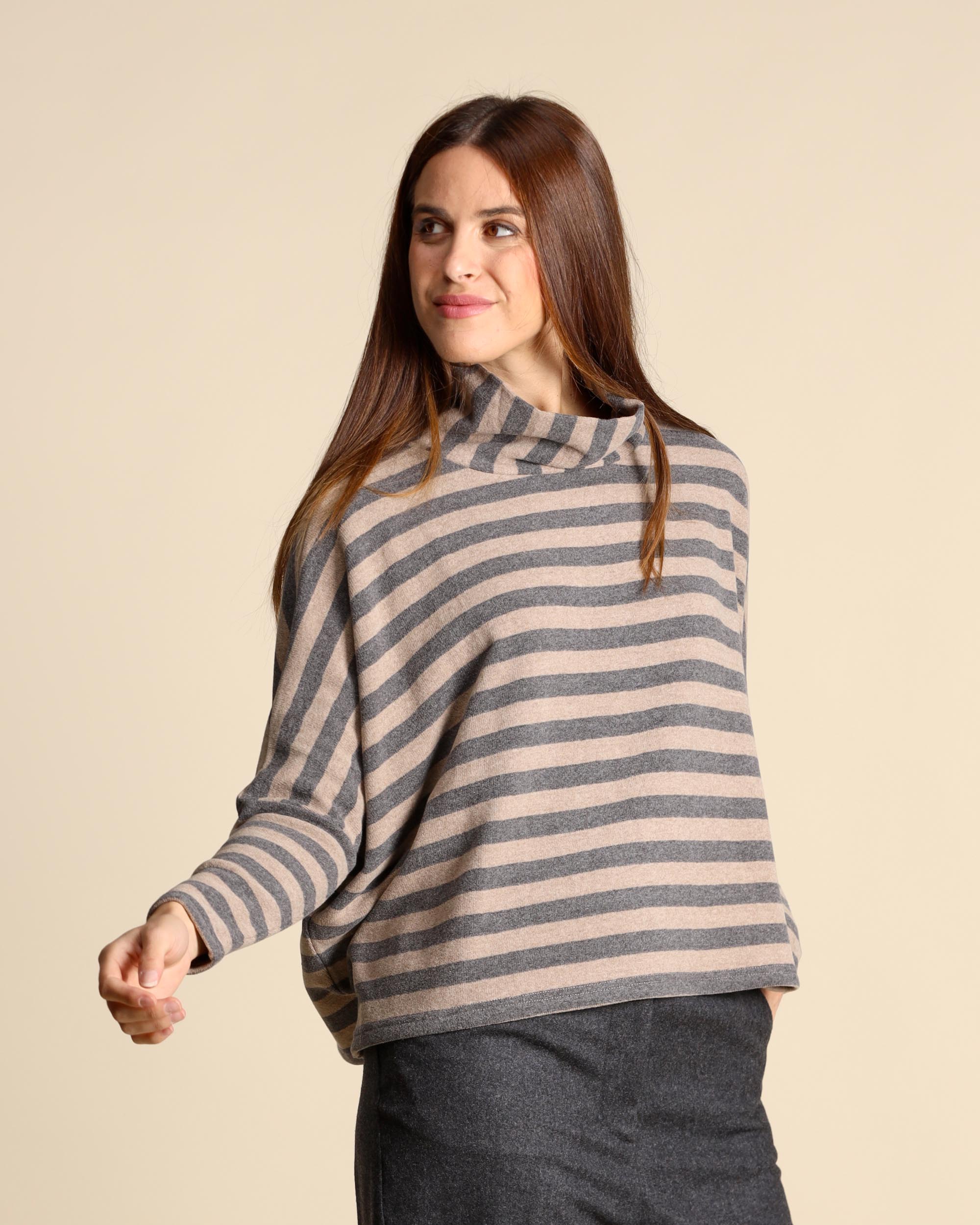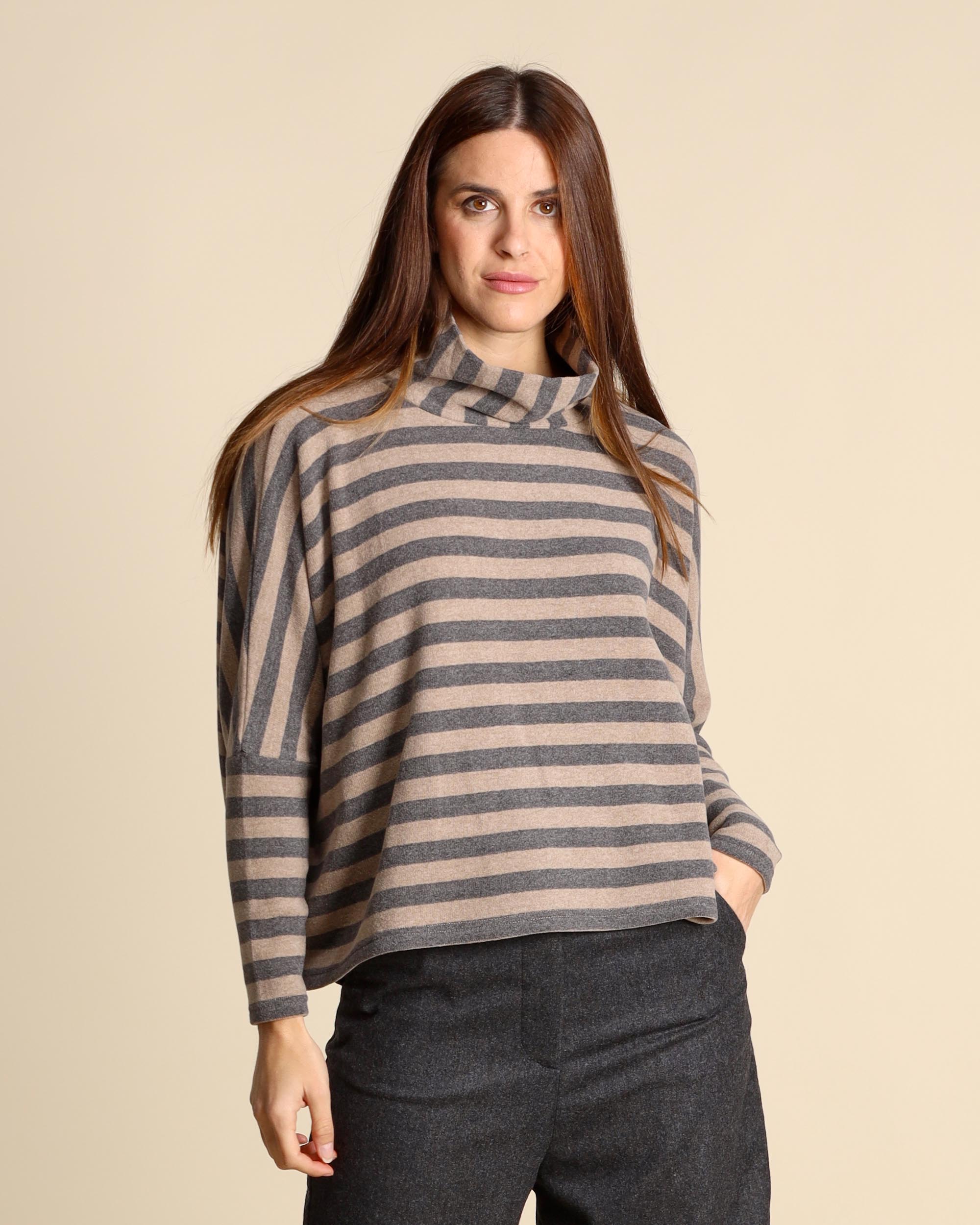 Maglia in jersey di misto cotone stretch grigio e beige a righe, collo a cratere, maniche lunghe, linea boxy, made in Italy, la modella indossa una tg.S, la modella ha le seguenti misure: altezza 177, seno 87,vita 65, fianchi 93, collezione donna Neirami Autunno Inverno 2025/26