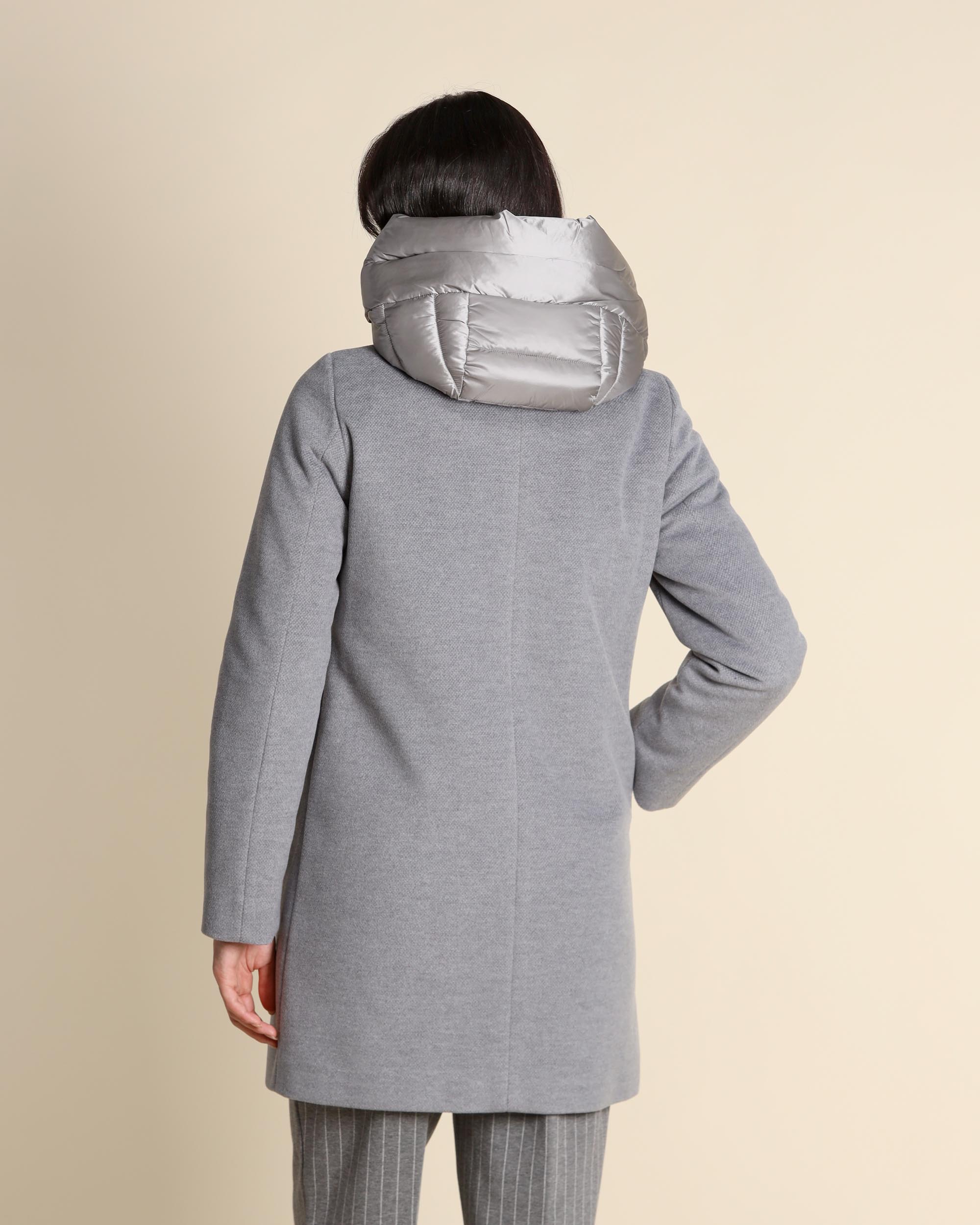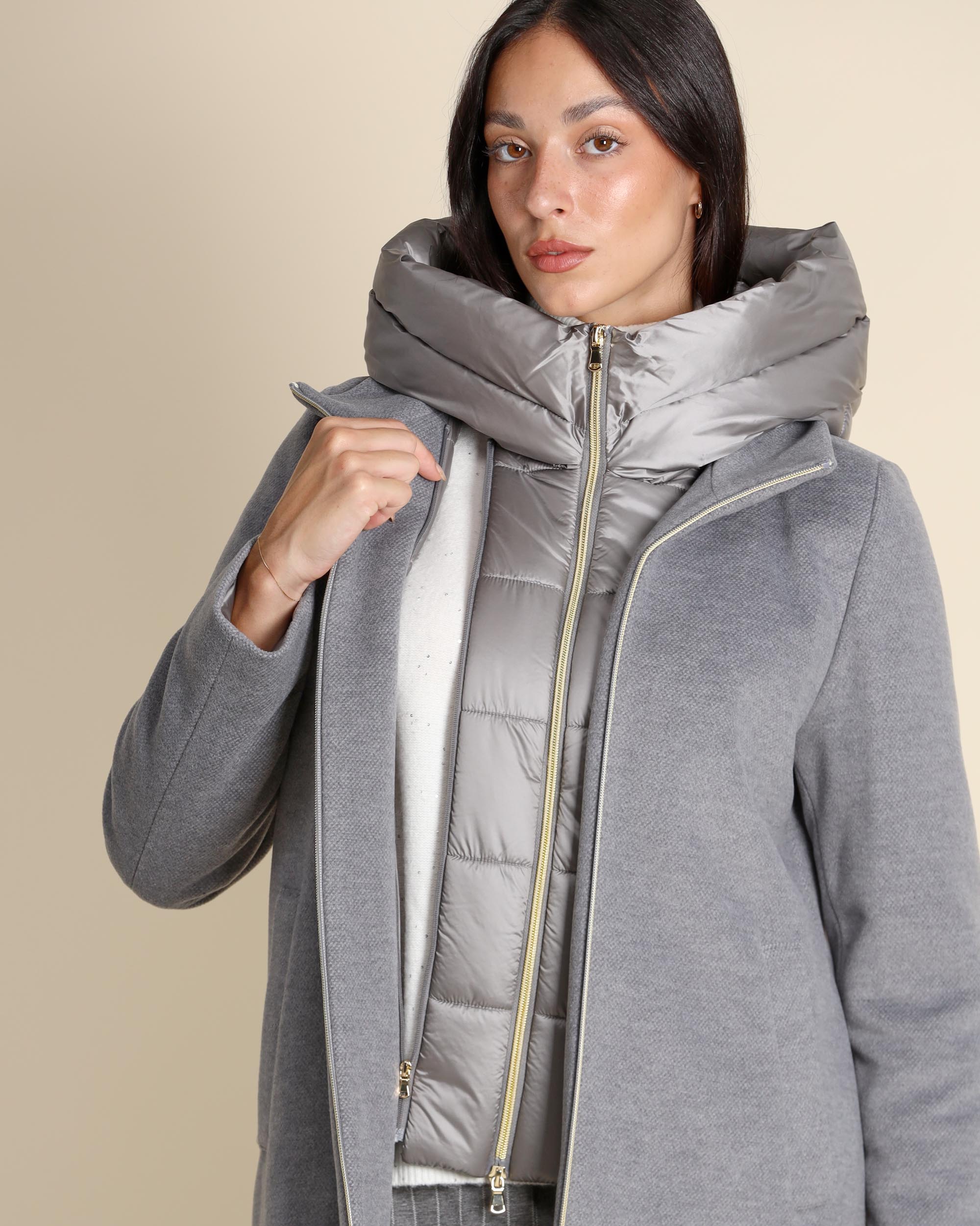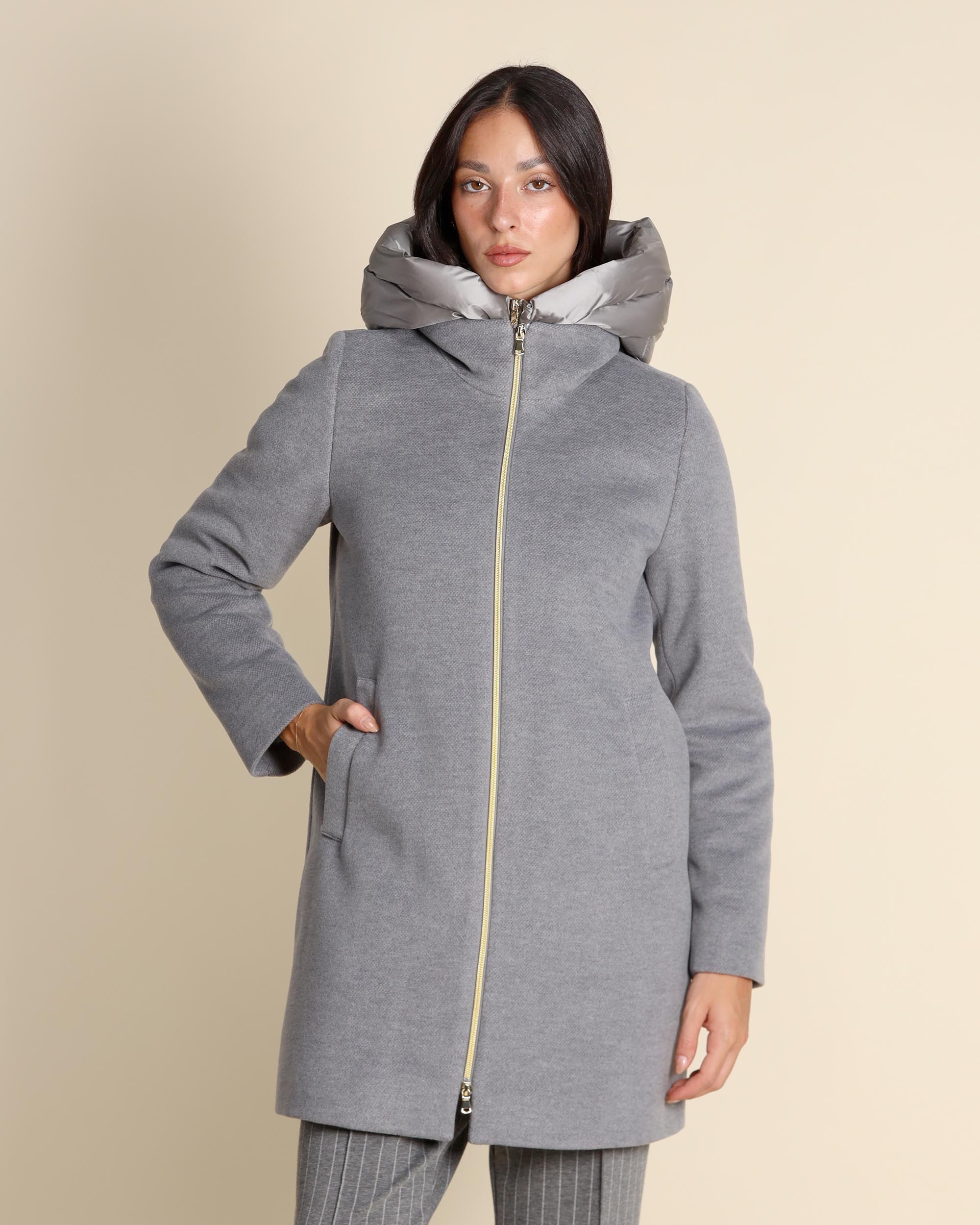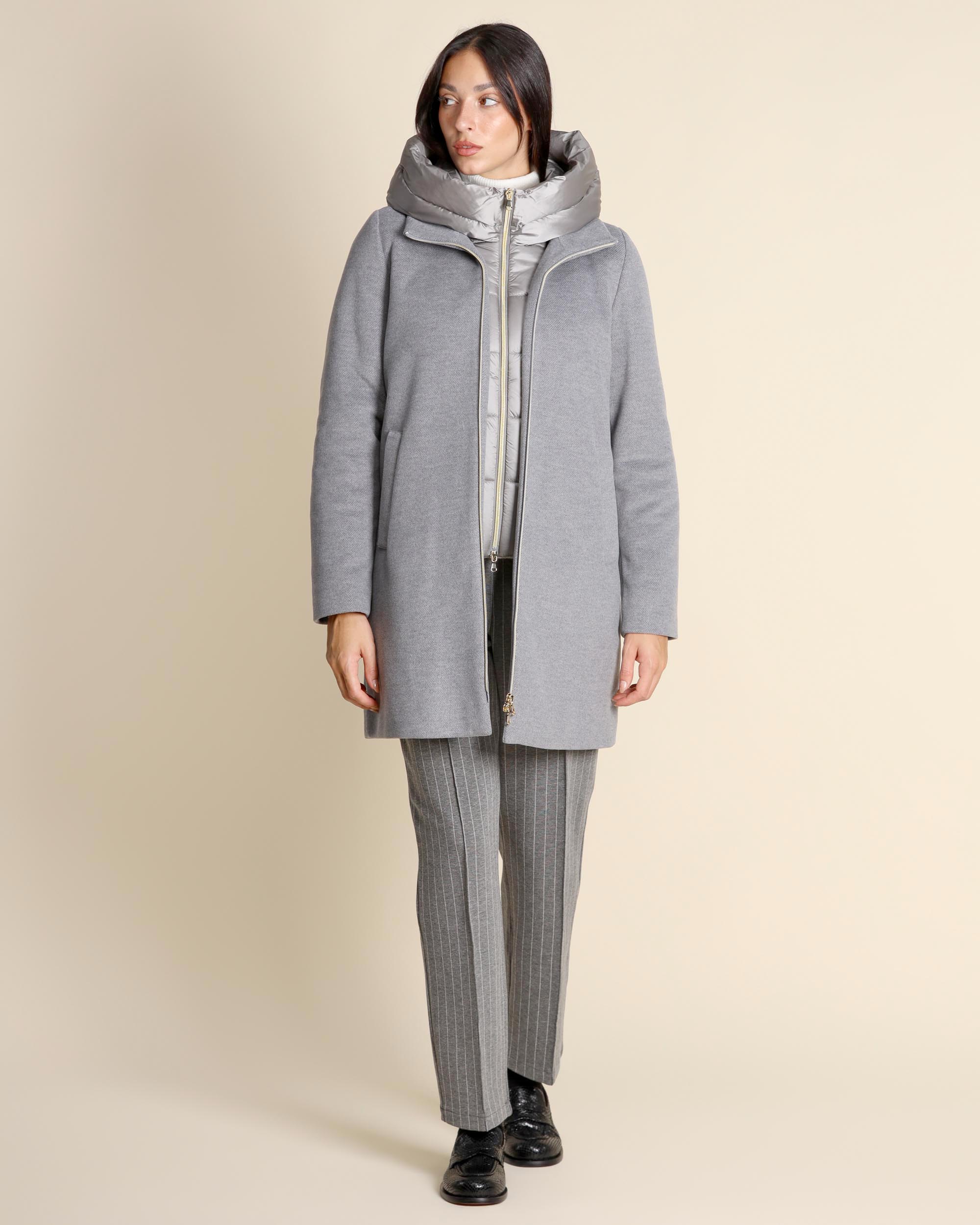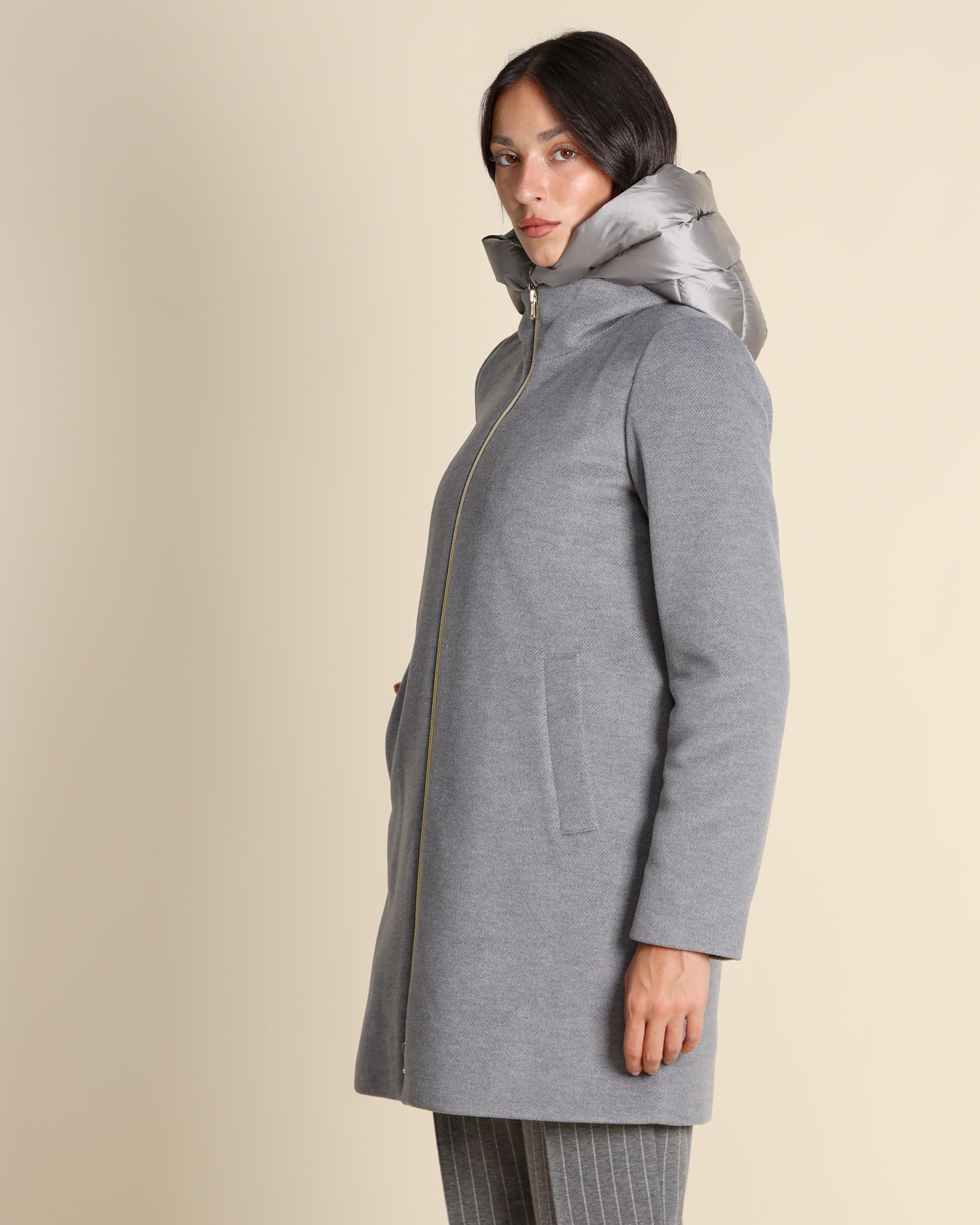Imbottito grigio melange in panno soft, collo alto con cappuccio e pettorina removibili, maniche lunghe, chiusura con zip a doppio cursore, linea dritta, tasche a filetto, imbottitura in poliestere, la modella indossa una tg.40, la modella ha le seguenti misure: altezza 173, seno 86,vita 65, fianchi 93, collezione donna Emme by Marella Autunno Inverno 2025/26