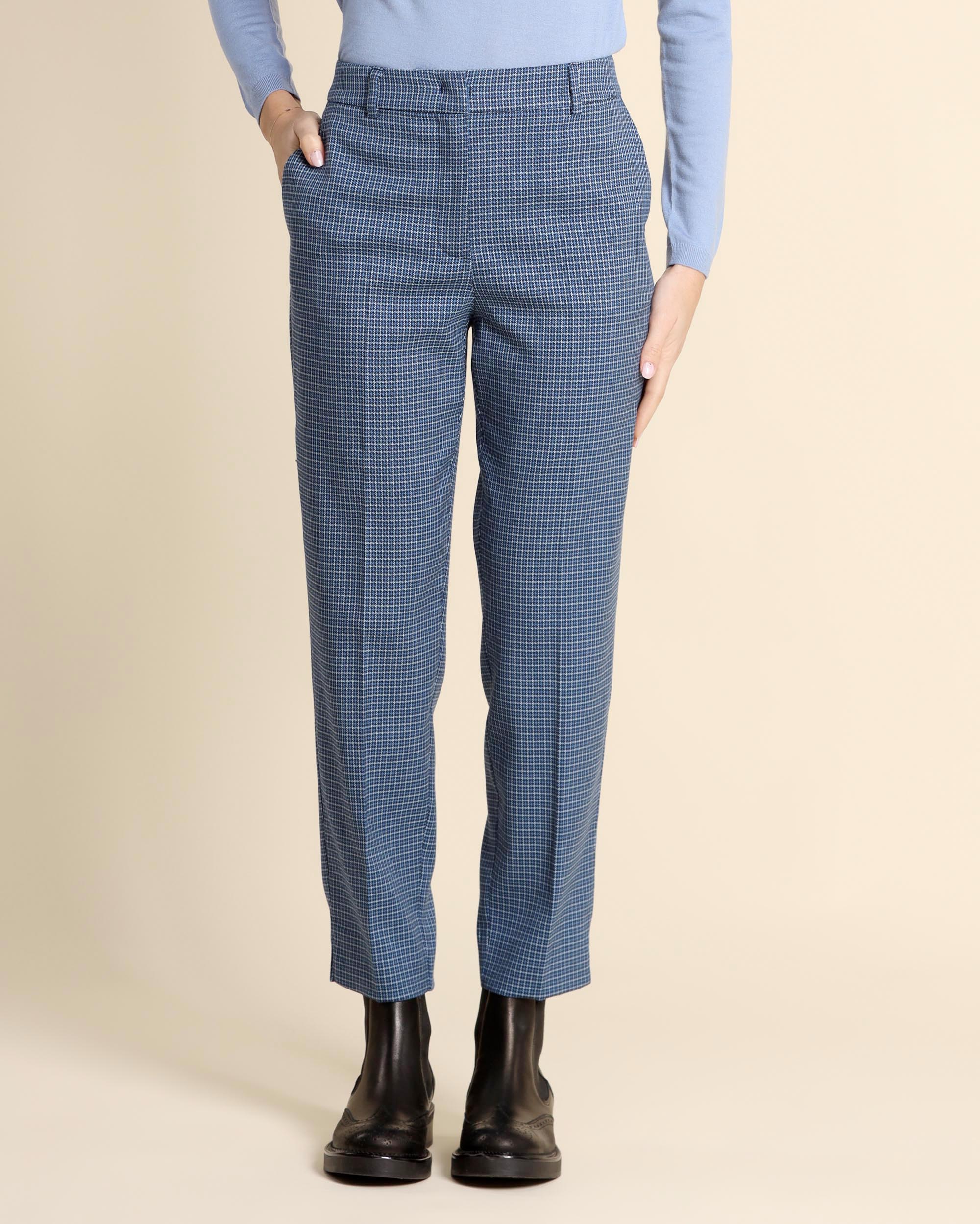 Pantaloni a fantasia blu in misto viscosa stretch, linea a sigaretta, tasche alla francese sul davanti e tasche a filetto sul dietro, chiusura con gancio e zip nascosti, piega stirata, la modella indossa una tg.42, la modella ha le seguenti misure: altezza 175, seno 86,vita 65, fianchi 93, collezione donna Pennyblack Autunno Inverno 2025/26