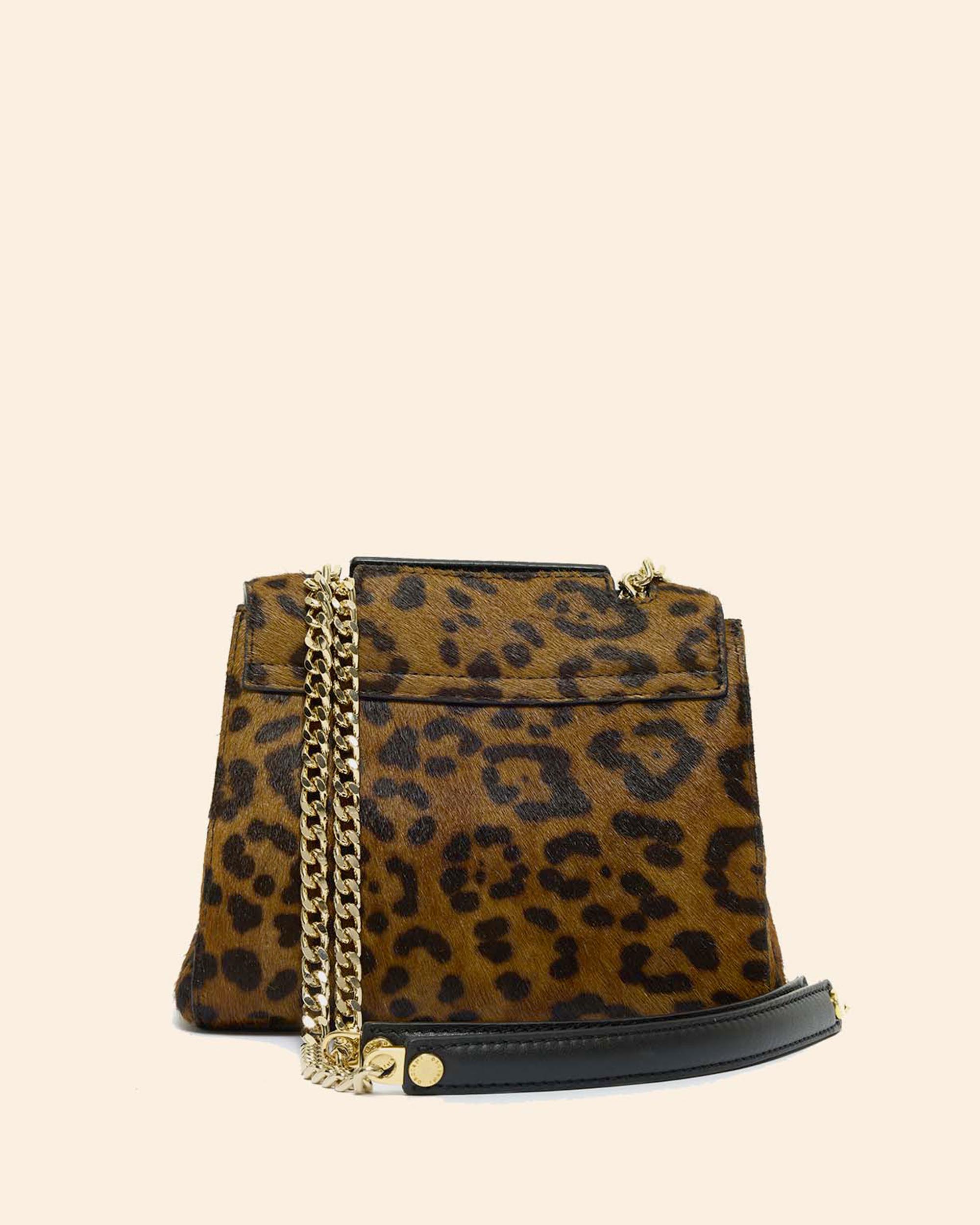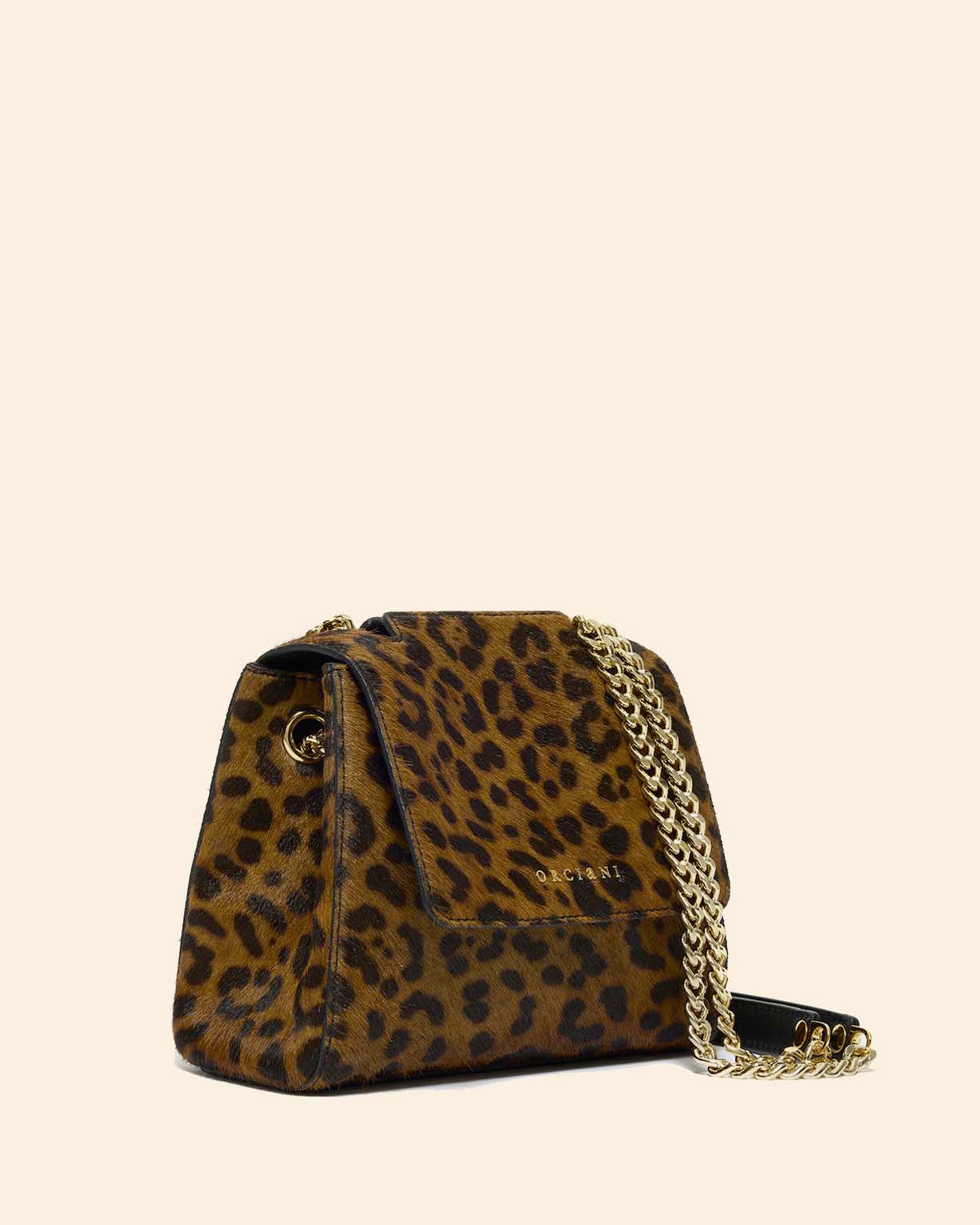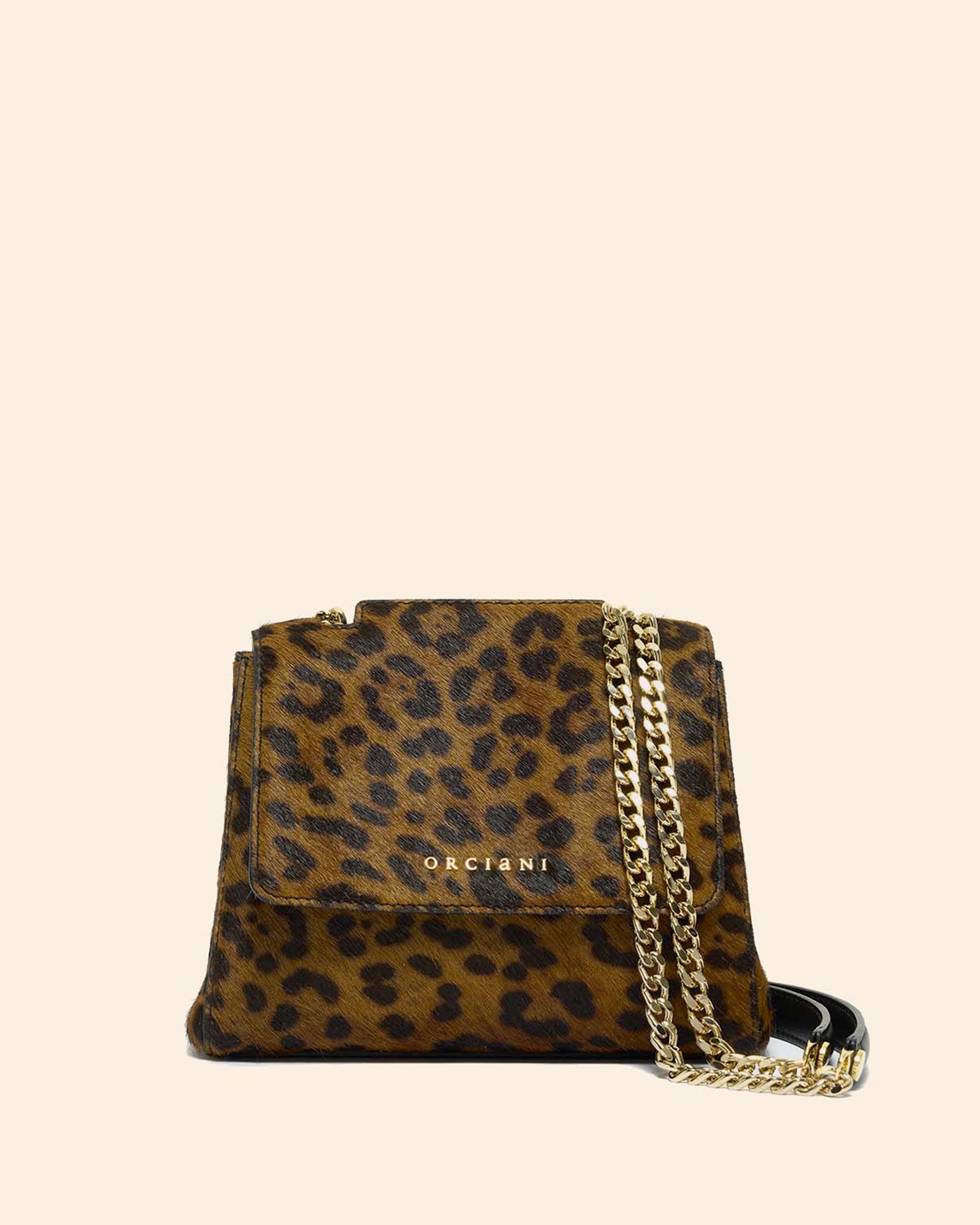 Borsa Sveva piccola in cavallino stampa leopard, manici a spalla in catena con spallaccio in pelle, chiusura con patta e bottone magnetico, apertura a scomparsa sulla parte alta della patta, tasca interna aperta, tasca interna con zip, finiture oro lucido, larghezza 20cm, altezza 15cm, profondità 8cm, made in Italy, collezione donna Orciani