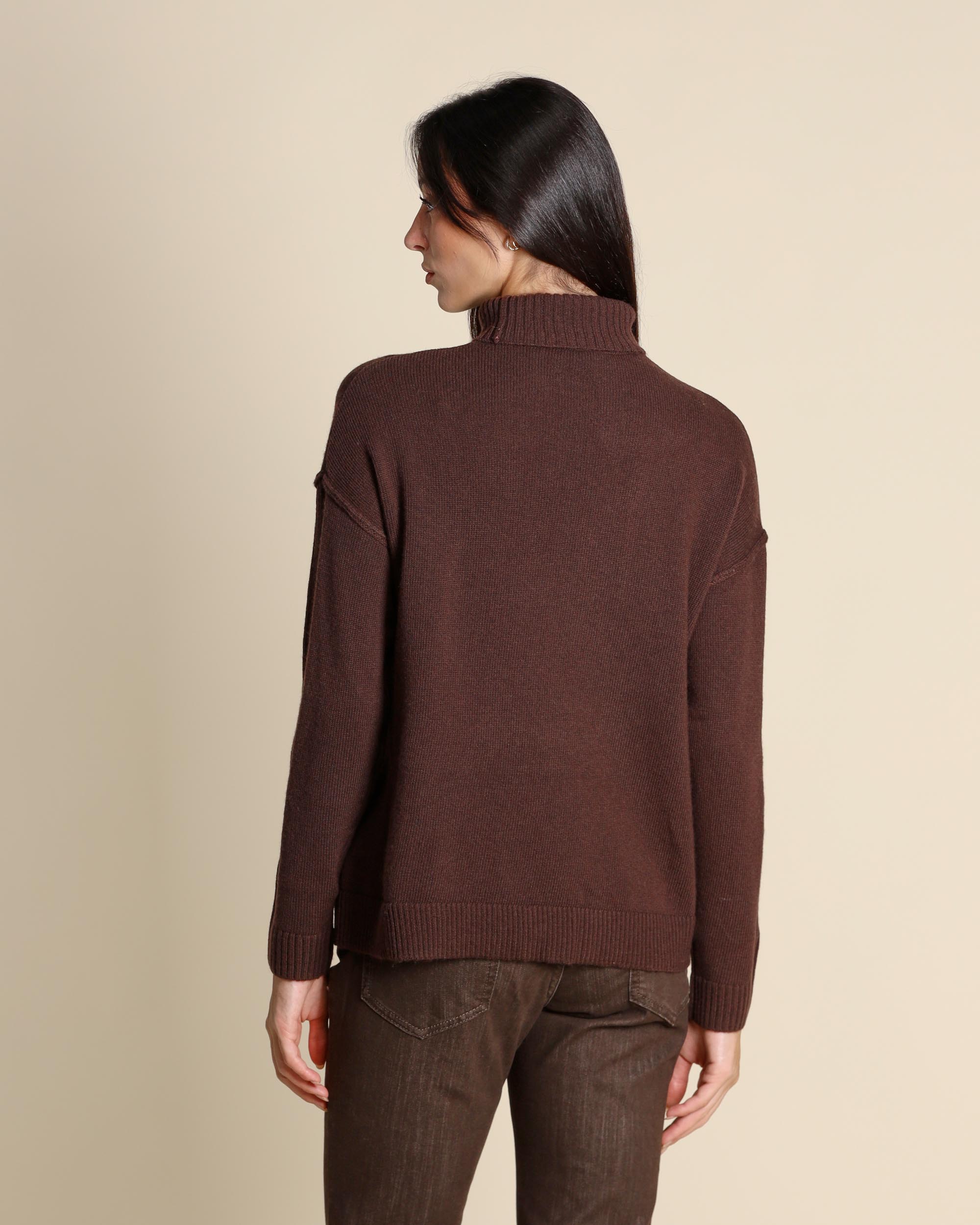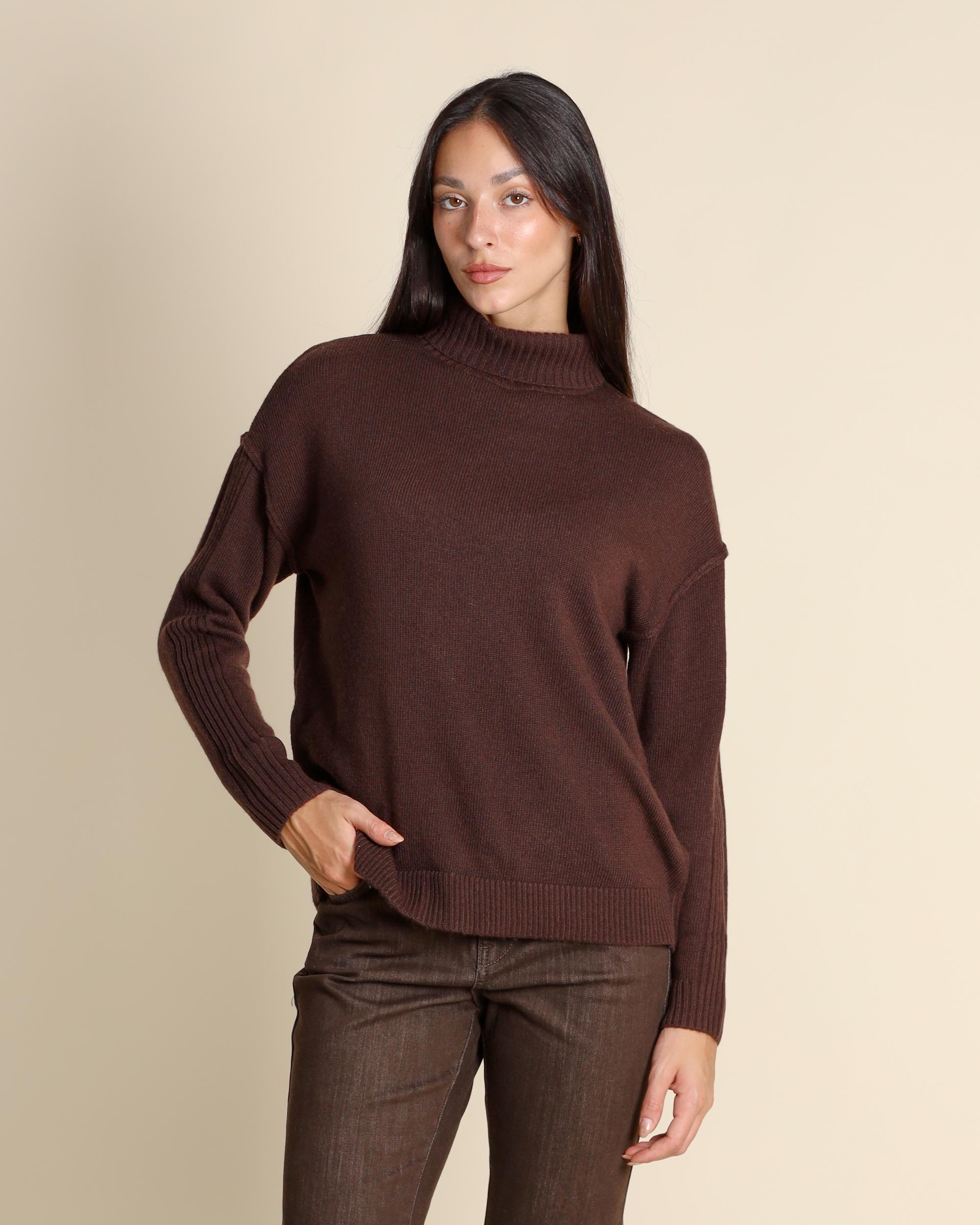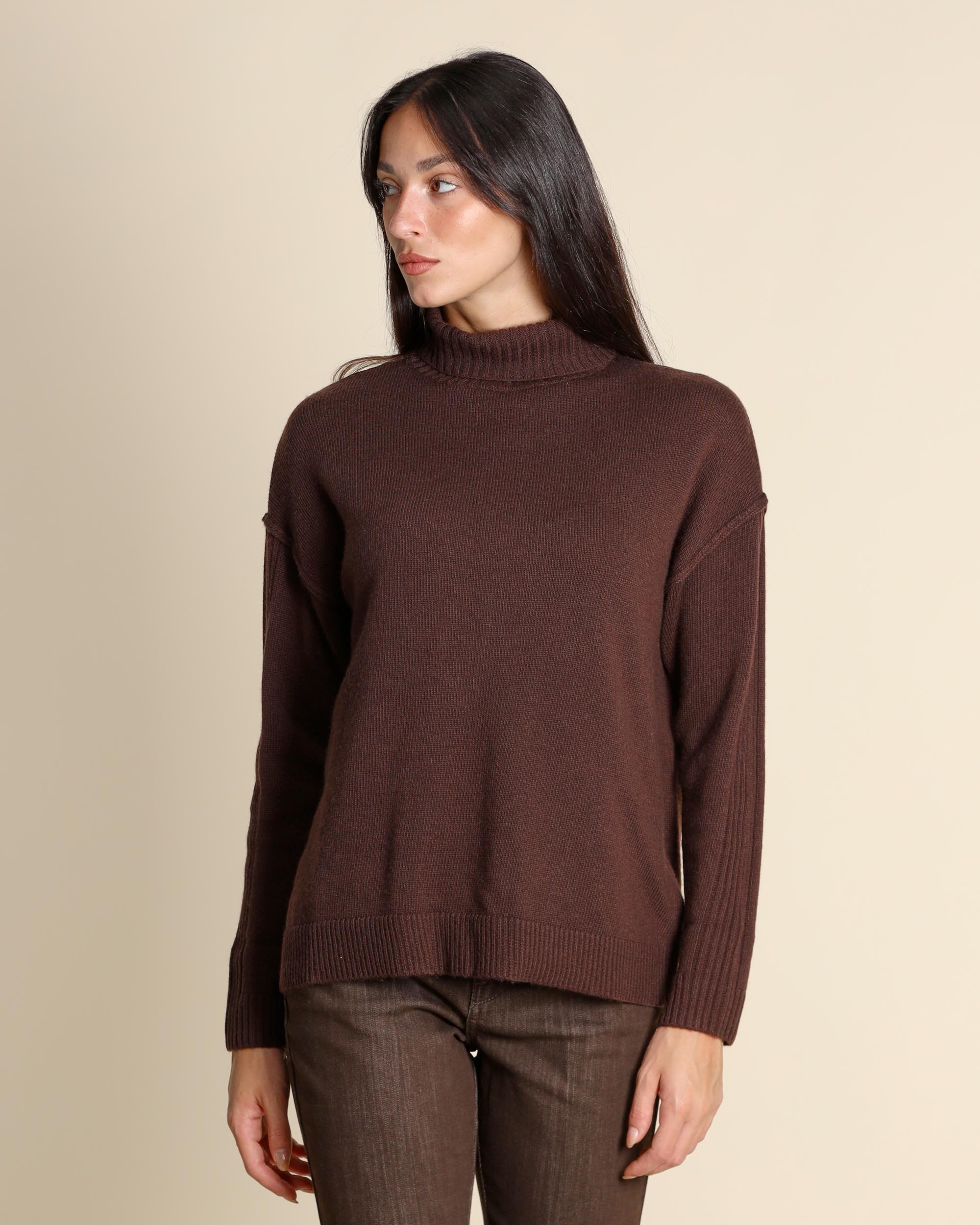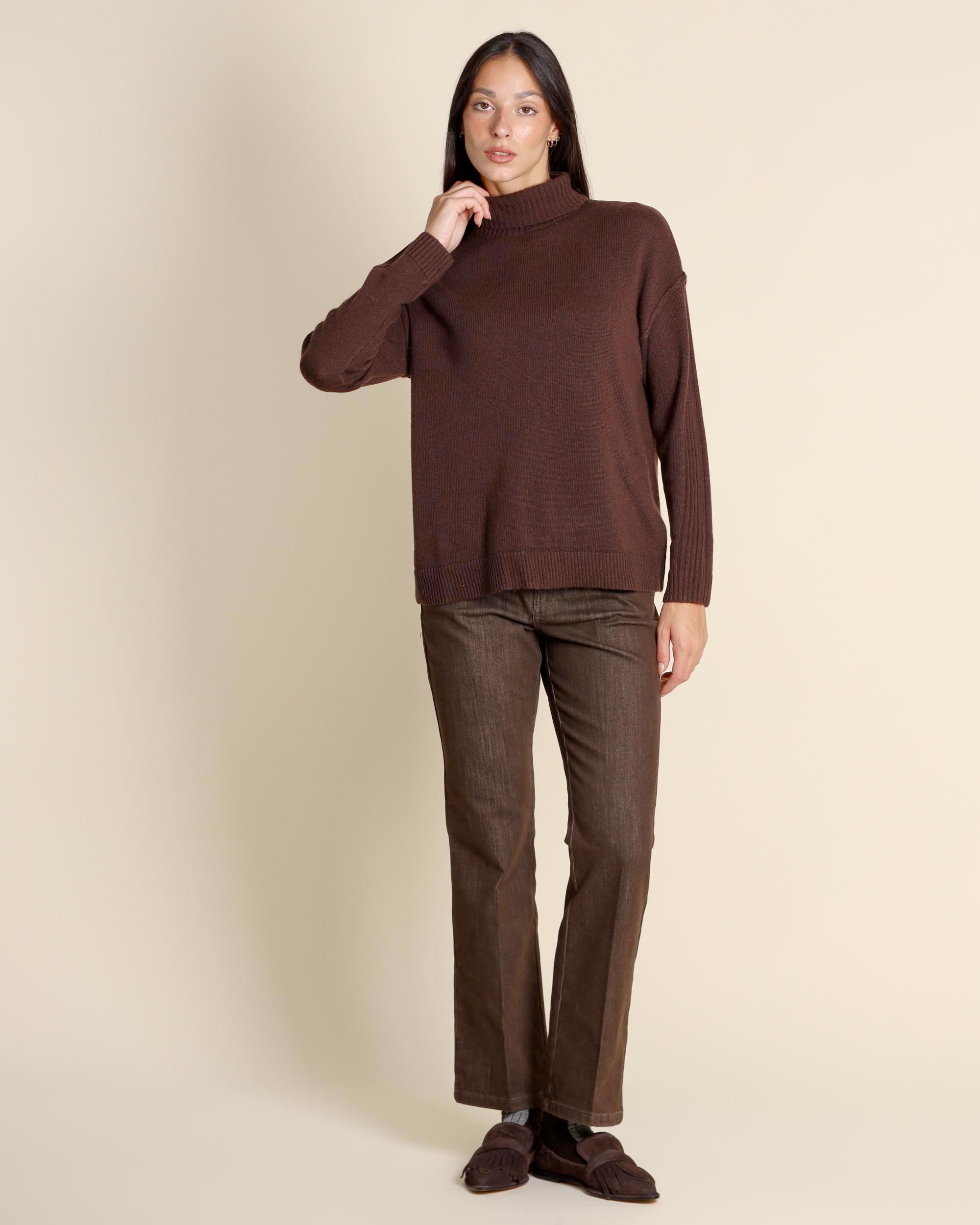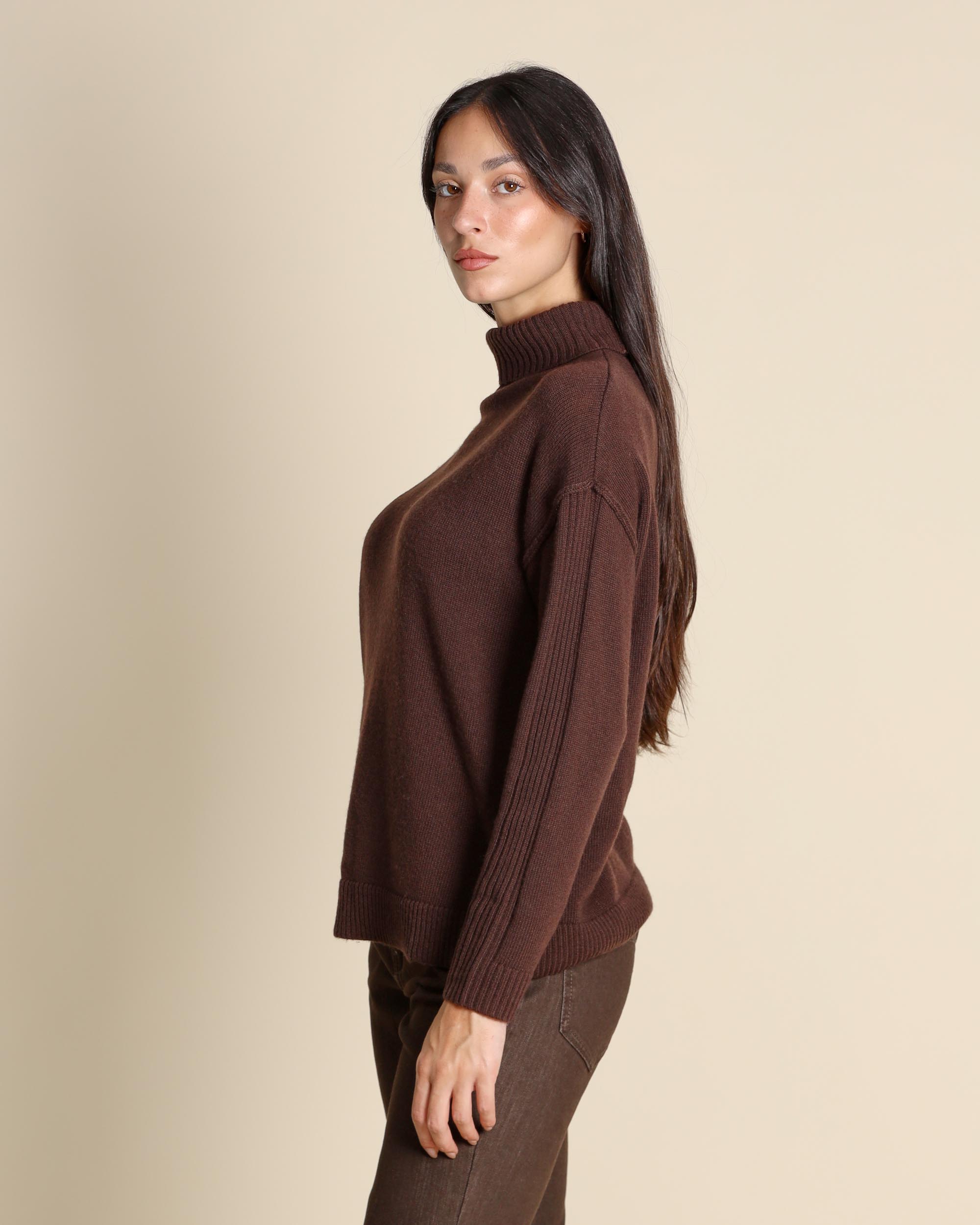 Maglia dolcevita testa moto in misto lana vergine, collo alto, maniche lunghe, giro sceso, linea dritta morbida, la modella indossa una tg.S, la modella ha le seguenti misure: altezza 173, seno 84, vita 63, fianchi 94, collezione donna Emme by Marella Autunno Inverno 2025/26