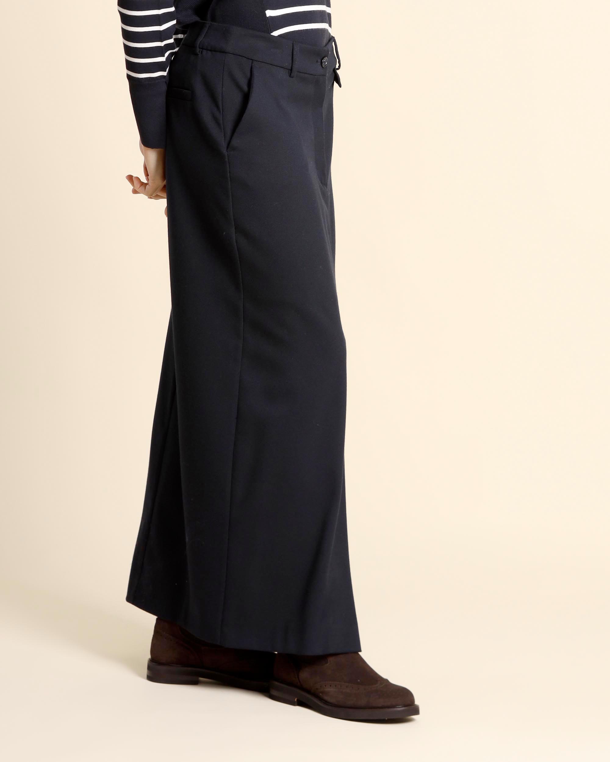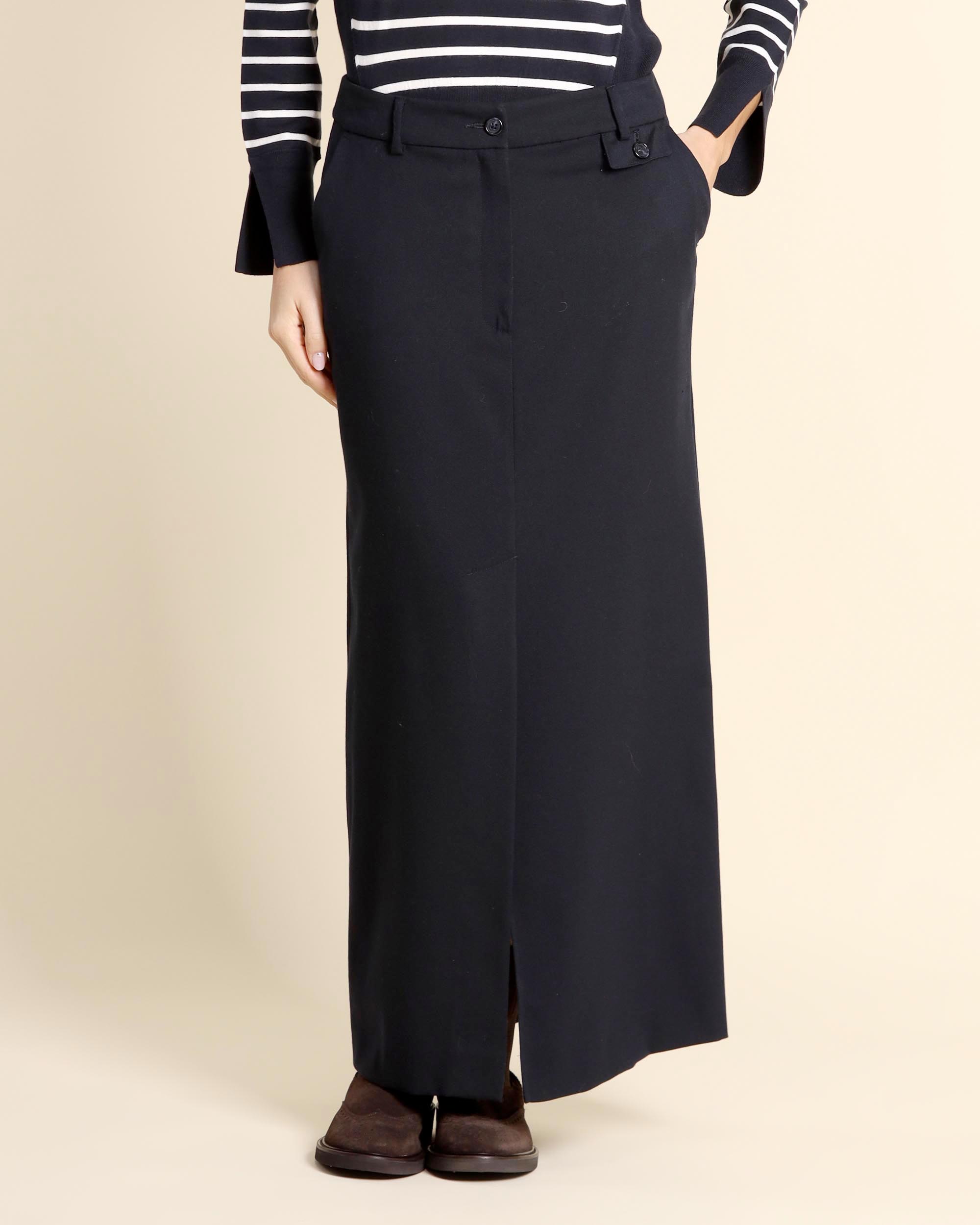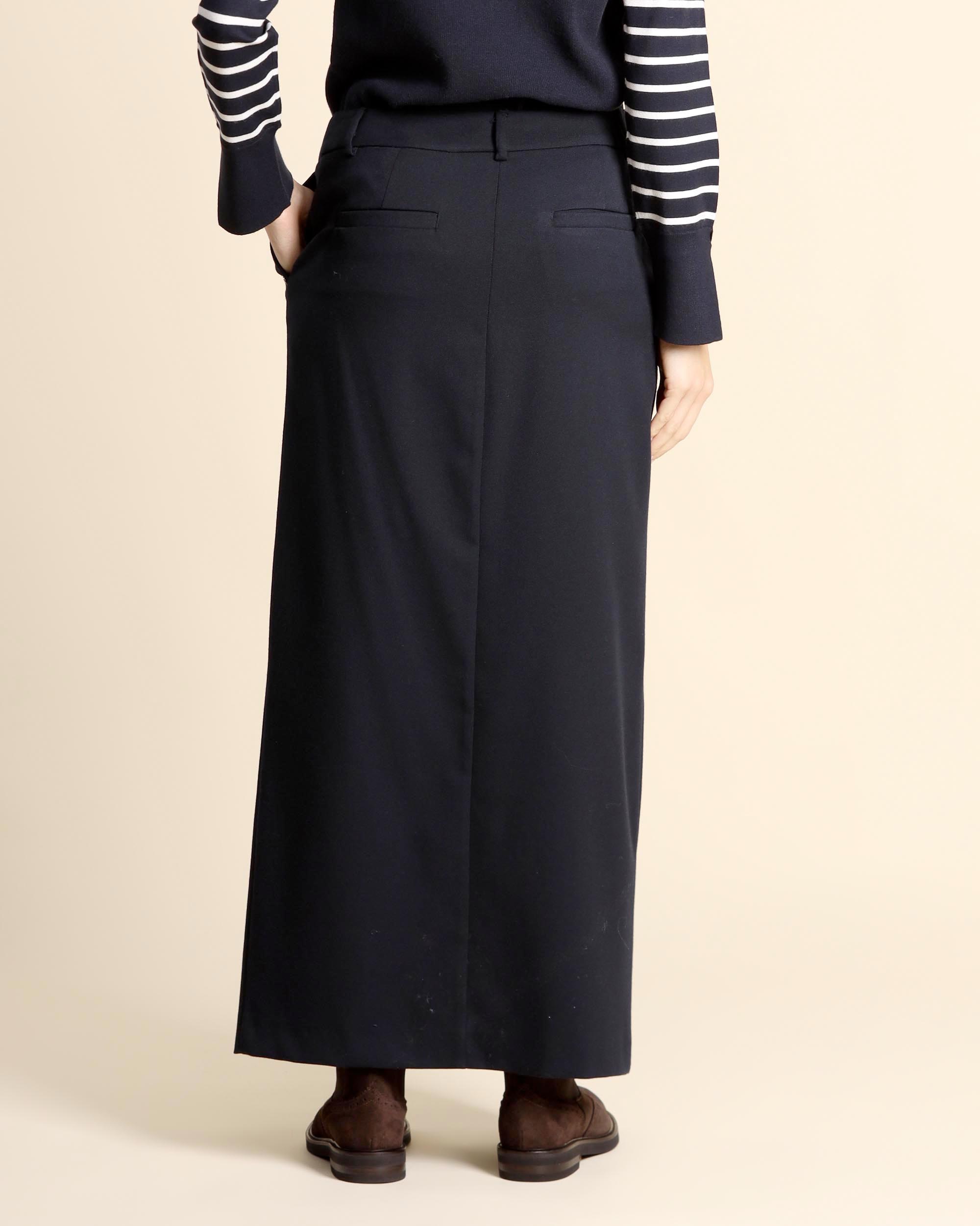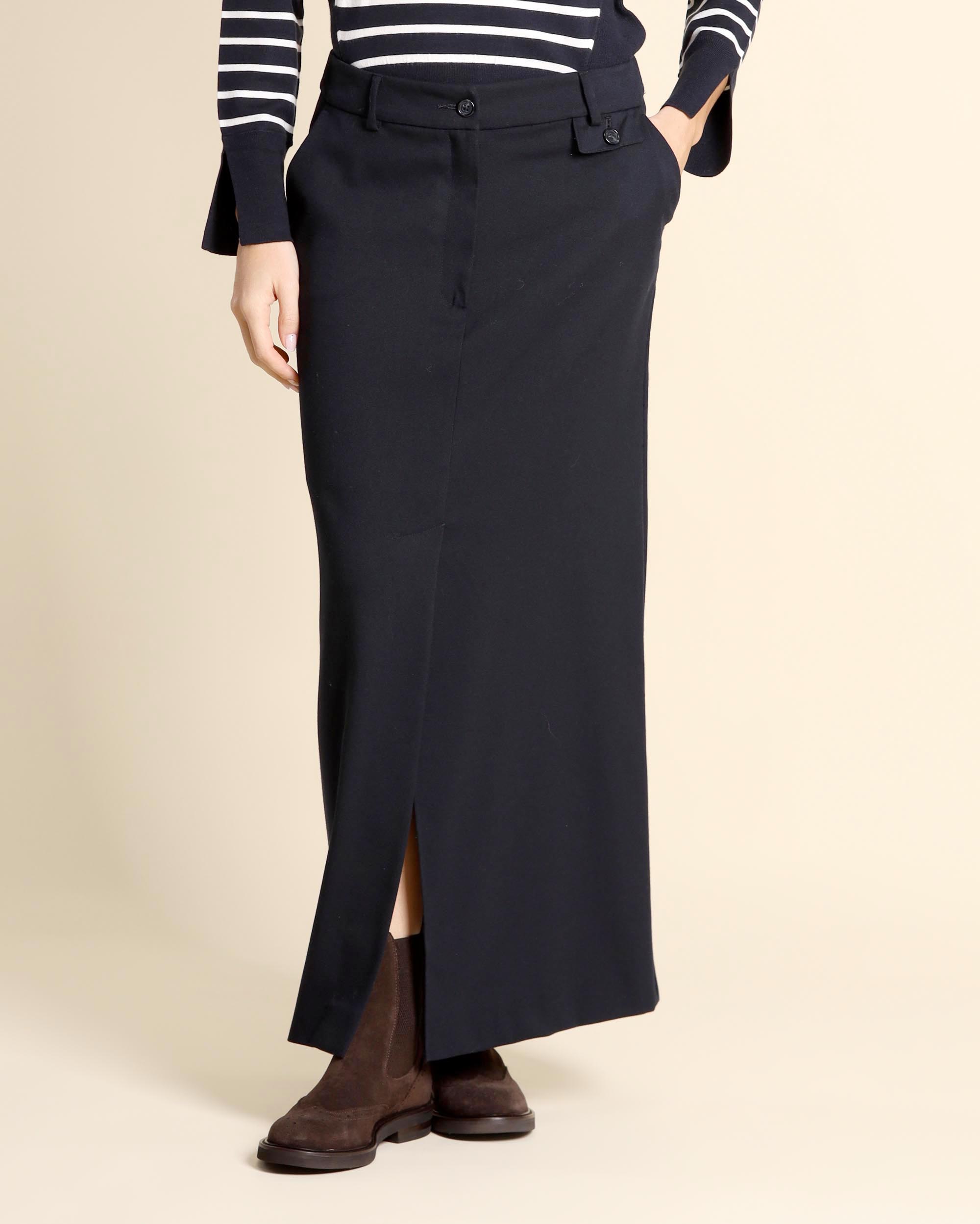 Gonna lunga blu in misto viscosa, linea a matita, sfoderata, chiusura con bottone e zip nascosta, tasche alla francese sul davanti e tasche a filetto sul dietro, spacco centrale sul davanti, la modella indossa una tg.42, la modella ha le seguenti misure: altezza 175, seno 86,vita 65, fianchi 93, collezione donna Pennyblack Autunno Inverno 2025/26