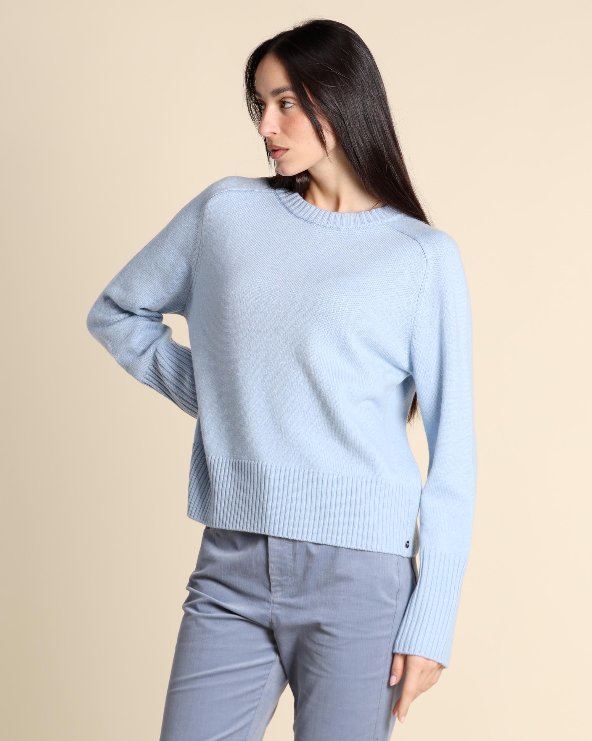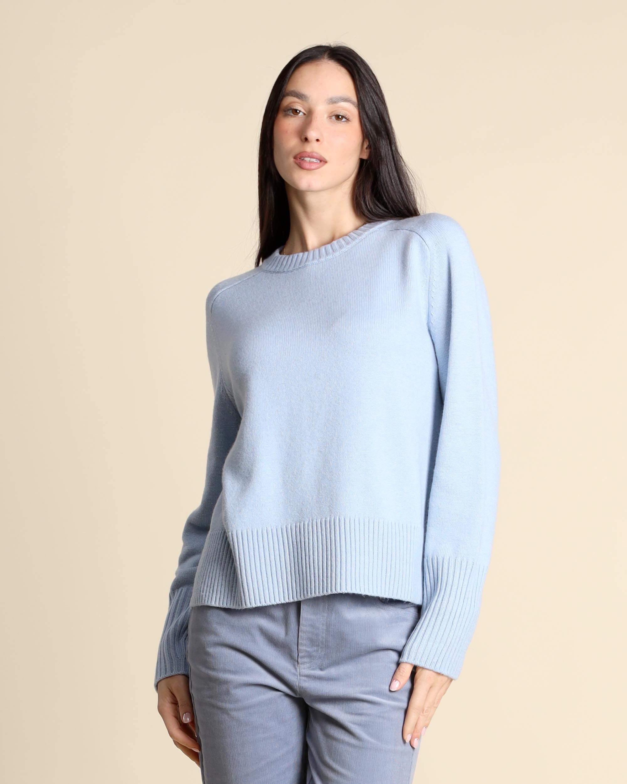 Maglia azzurra in misto viscosa, lana e cashmere, scollo tondo, maniche lunghe raglan, linea dritta, la modella indossa una tg.S, la modella ha le seguenti misure: altezza 177, seno 84, vita 63, fianchi 94, collezione donna Pennyblack Autunno Inverno 2025/26