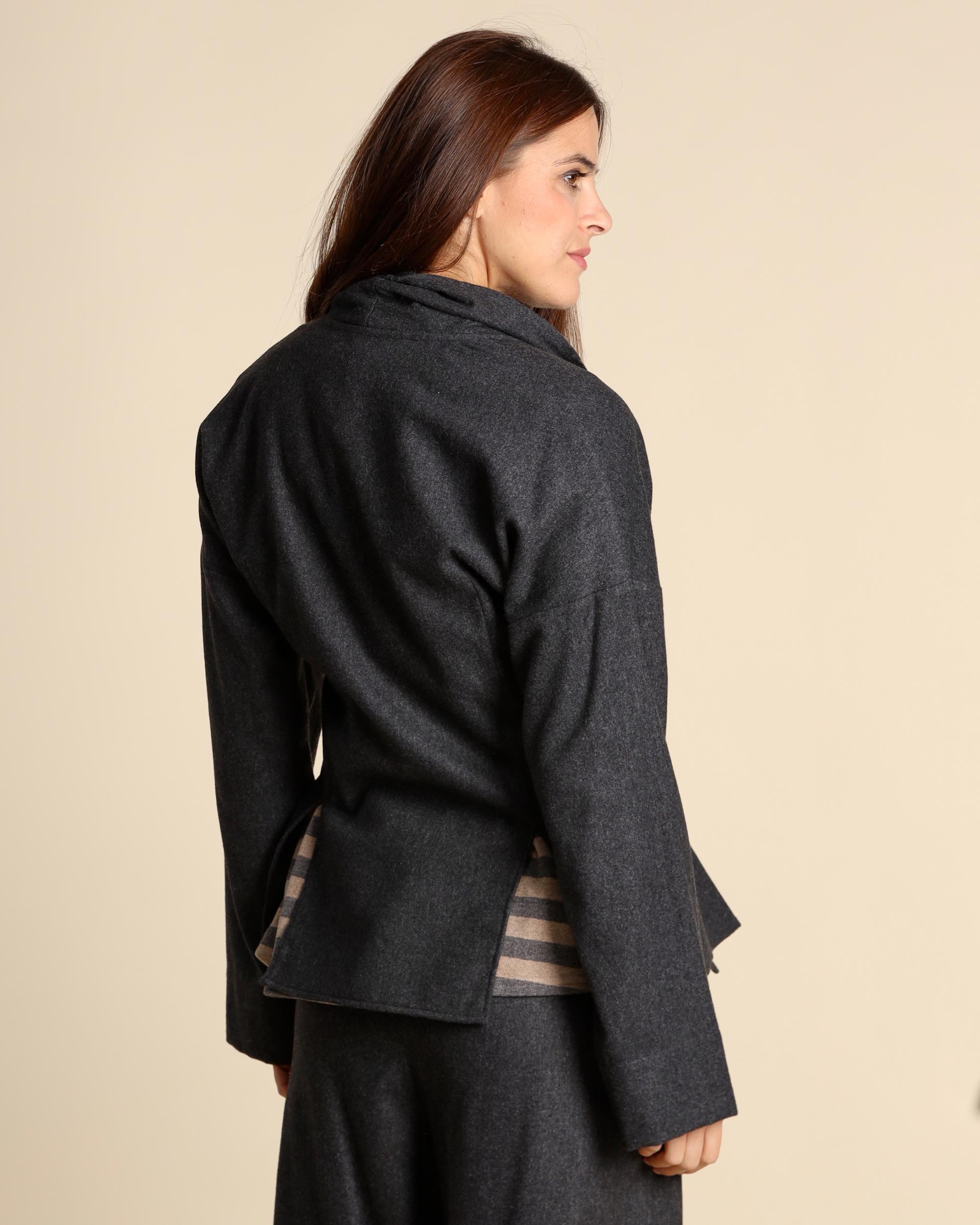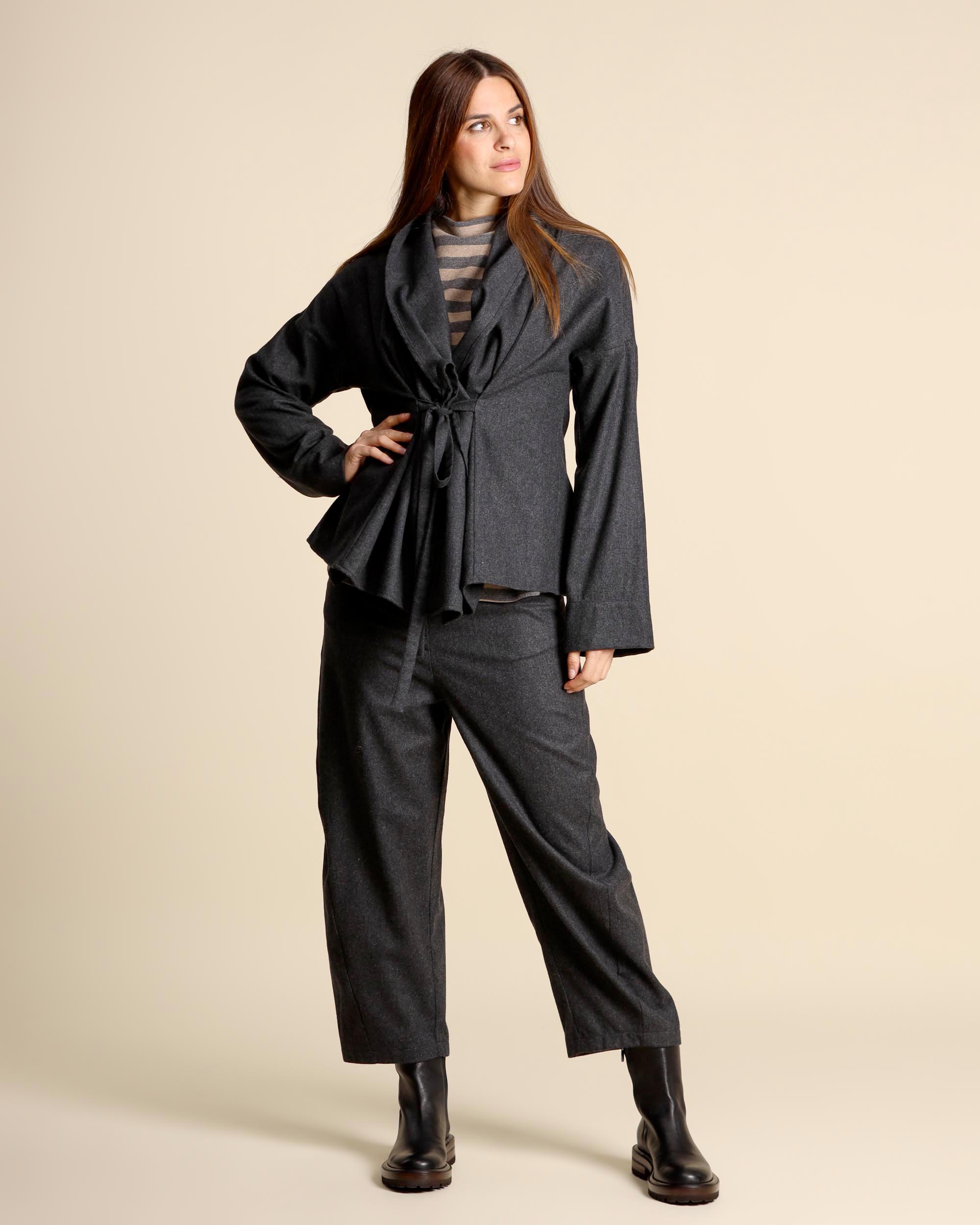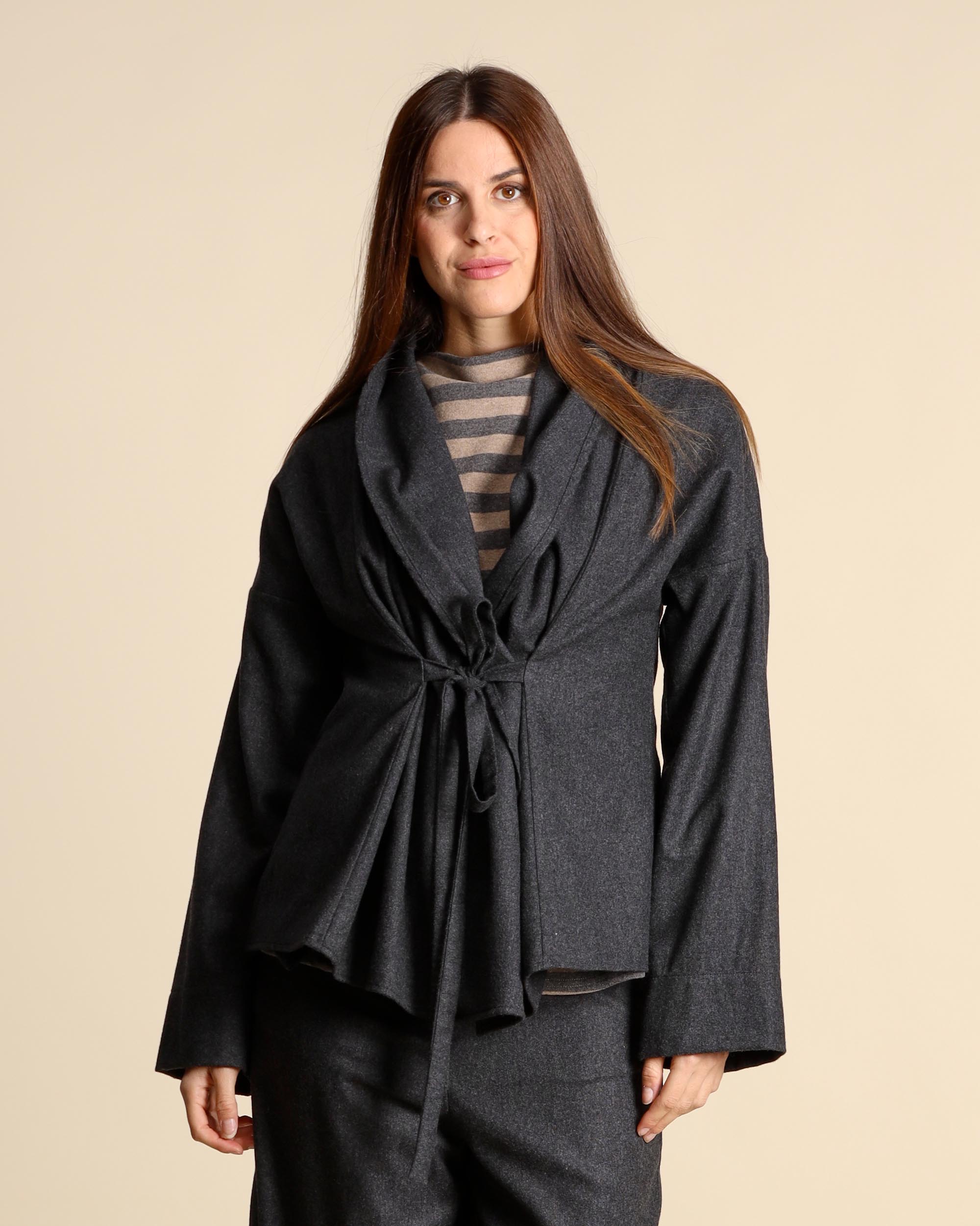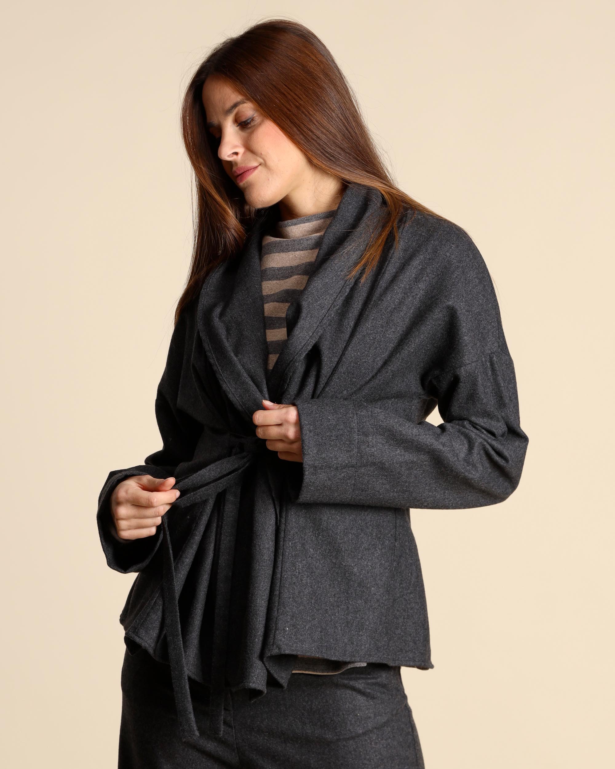 Giacca grigio antracite in flanella di misto lana, maniche lunghe, chiusura con lacci, linea morbida, sfoderata, spacchi laterali, made in Italy, la modella indossa una tg.S, la modella ha le seguenti misure: altezza 177, seno 87,vita 65, fianchi 93, collezione donna Neirami Autunno Inverno 2025/26