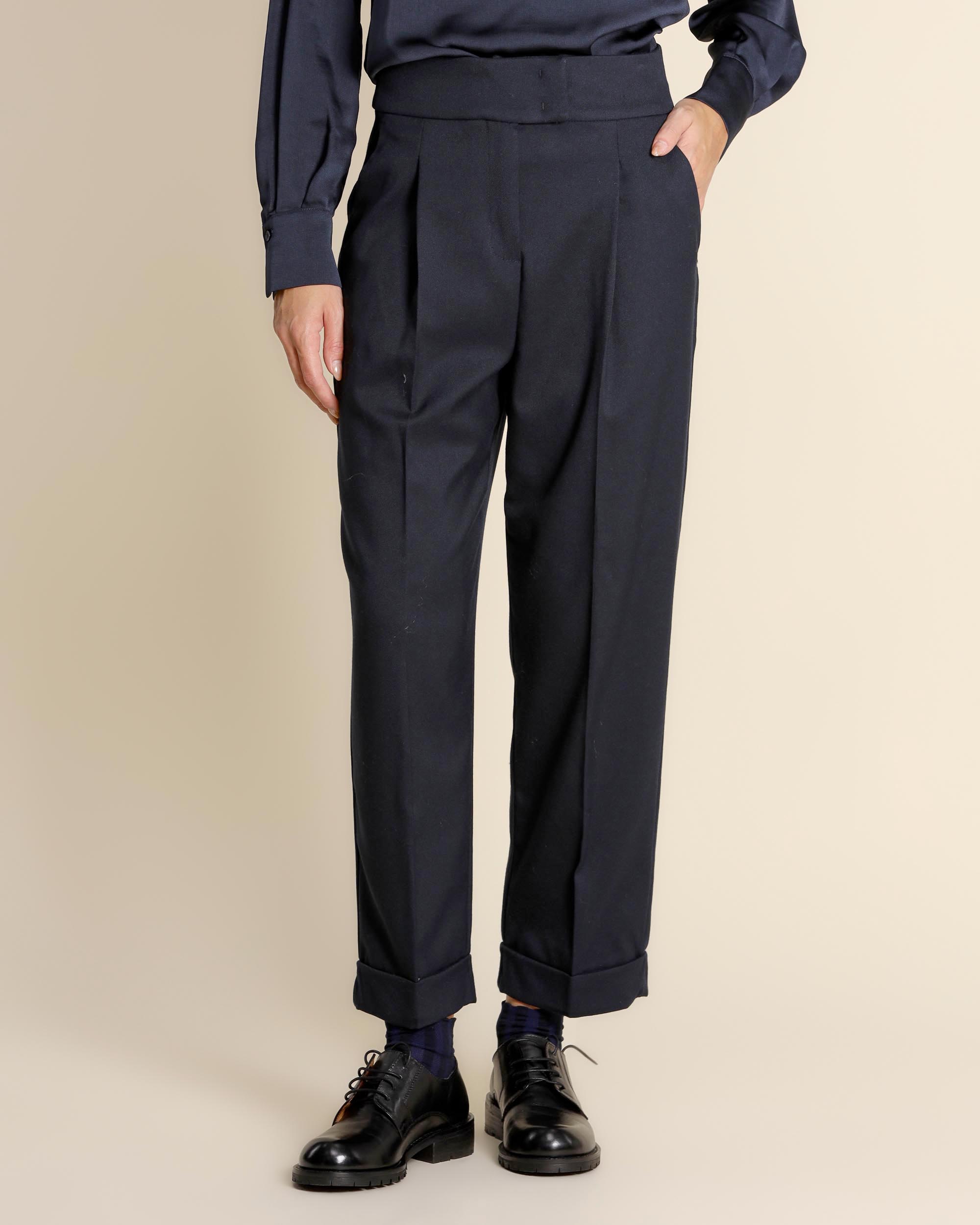 Pantaloni blu carrot fit in misto viscosa stretch, chiusura con ganci e zip nascosti, tasche alla francese sul davanti e tasche a filetto sul dietro, linea morbida con pince in vita, piega stirata, risvolto sul fondo, la modella indossa una tg.40, la modella ha le seguenti misure: altezza 173, seno 86,vita 65, fianchi 93, collezione donna Pennyblack Autunno Inverno 2025/26