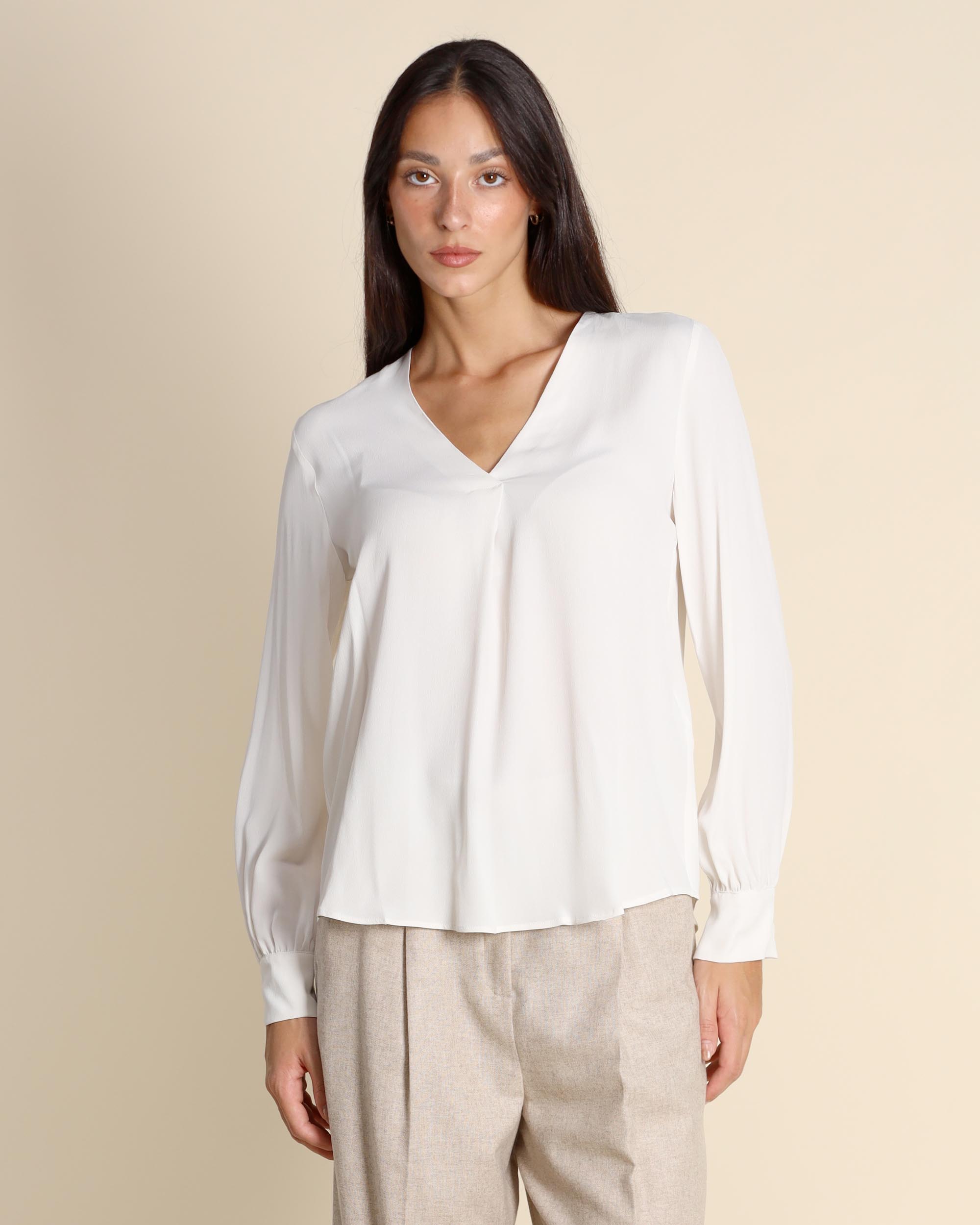 Blusa color burro in crepe di misto seta, maniche lunghe con polsino, scollo a V, linea dritta, la modella indossa una tg.42, la modella ha le seguenti misure: altezza 173, seno 86,vita 65, fianchi 93, collezione donna Emme by Marella Autunno Inverno 2025/26