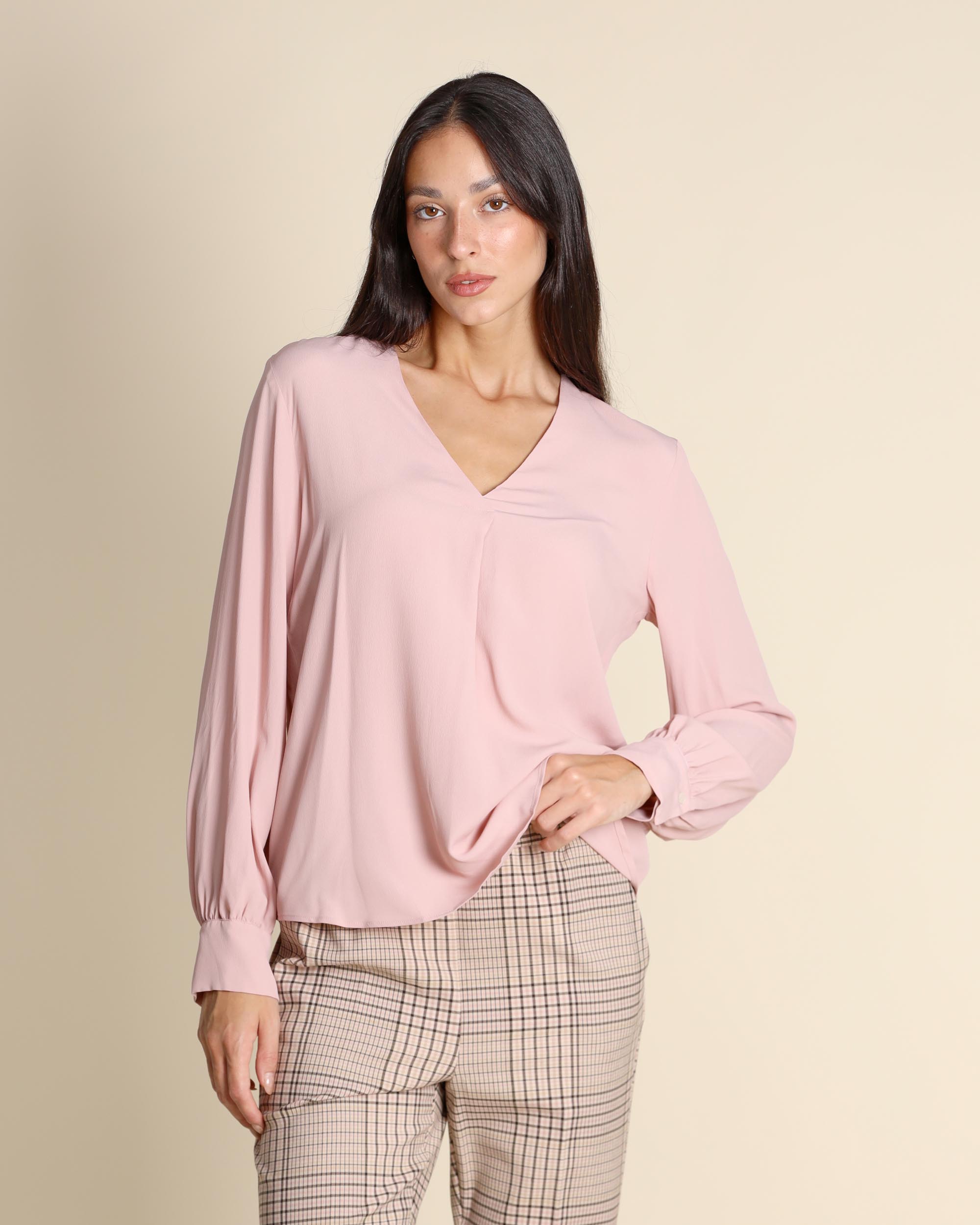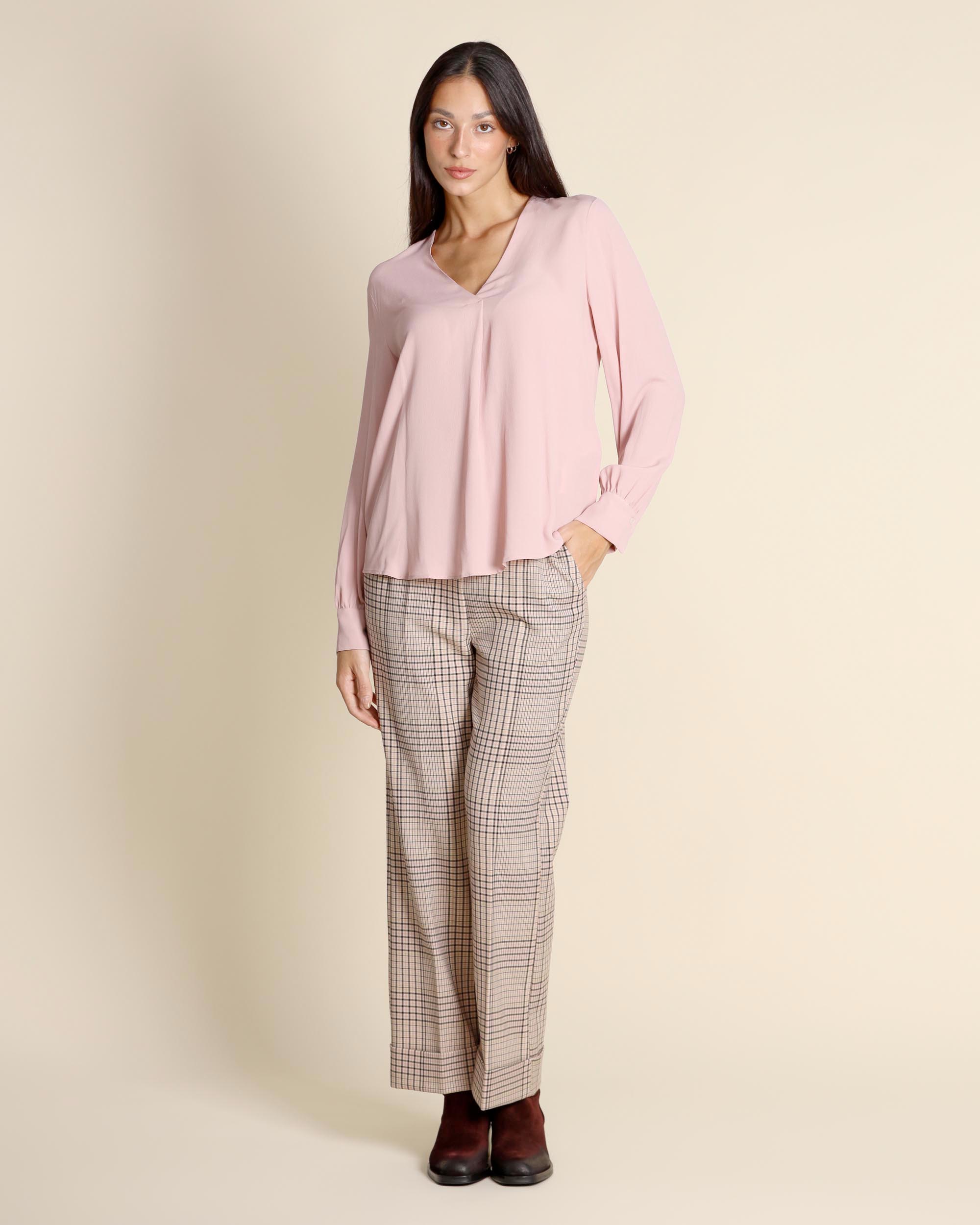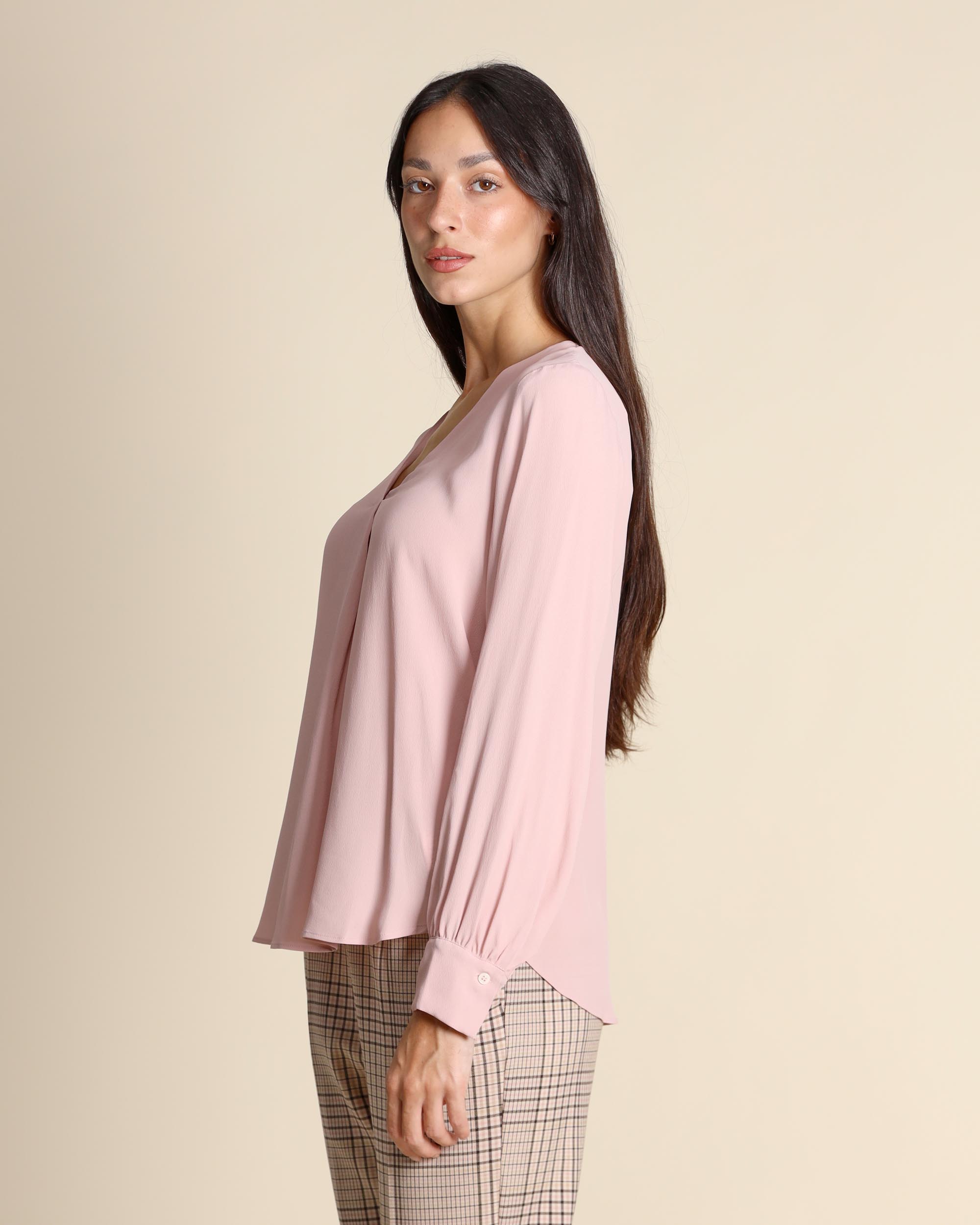 Blusa color cipria in crepe di misto seta, maniche lunghe con polsino, scollo a V, linea dritta, la modella indossa una tg.42, la modella ha le seguenti misure: altezza 173, seno 86,vita 65, fianchi 93, collezione donna Emme by Marella Autunno Inverno 2025/26