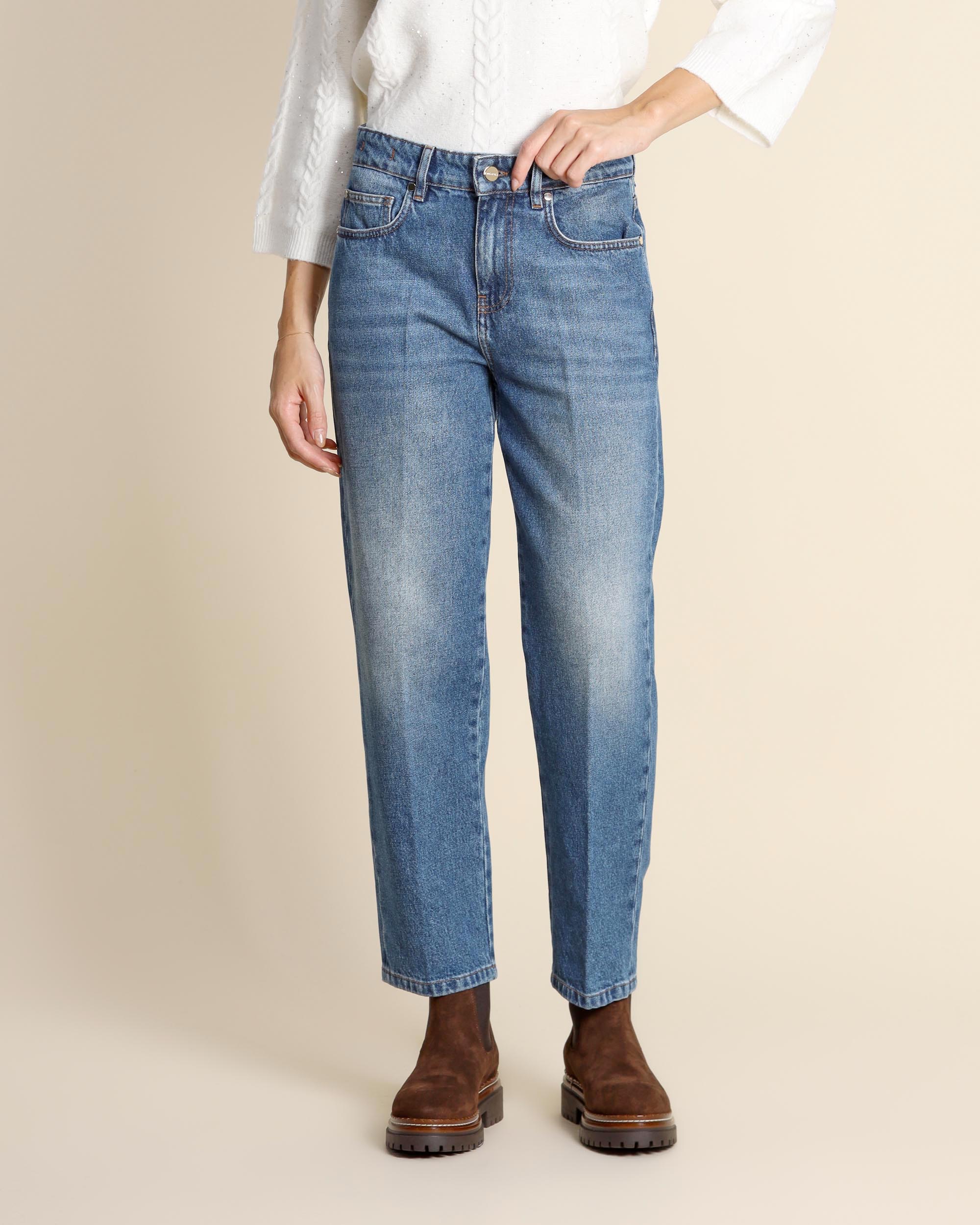 Jeans blu in denim di cotone, chiusura con bottone a chiodo personalizzato e zip nascosta, cinque tasche, slim fit, la modella indossa una tg.42, la modella ha le seguenti misure: altezza 173, seno 86,vita 65, fianchi 93, collezione donna I Blues Autunno Inverno 2025/26