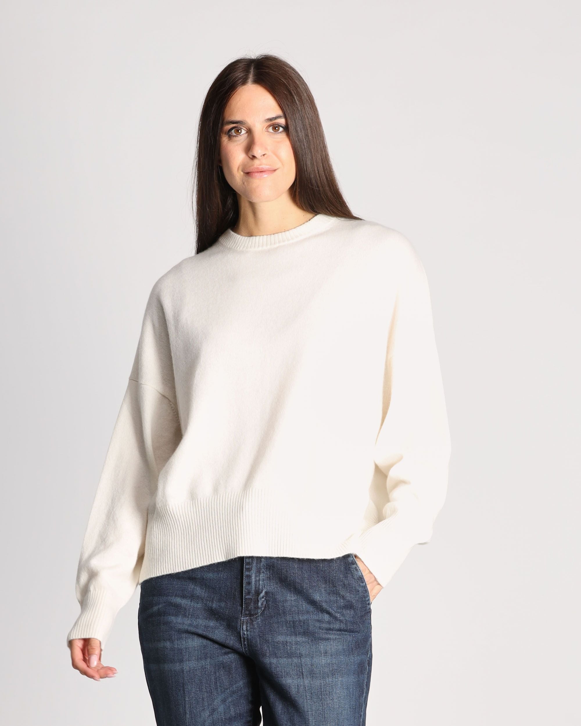 Girocollo bianco lana 100% cashmere, due fili, scollo tondo, maniche lunghe, giro sceso, linea ampia, Veronica indossa una tg.S, Veronica ha le seguenti misure: altezza 177, seno 87,vita 65, fianchi 93, collezione donna Be You Autunno Inverno 2024/2025