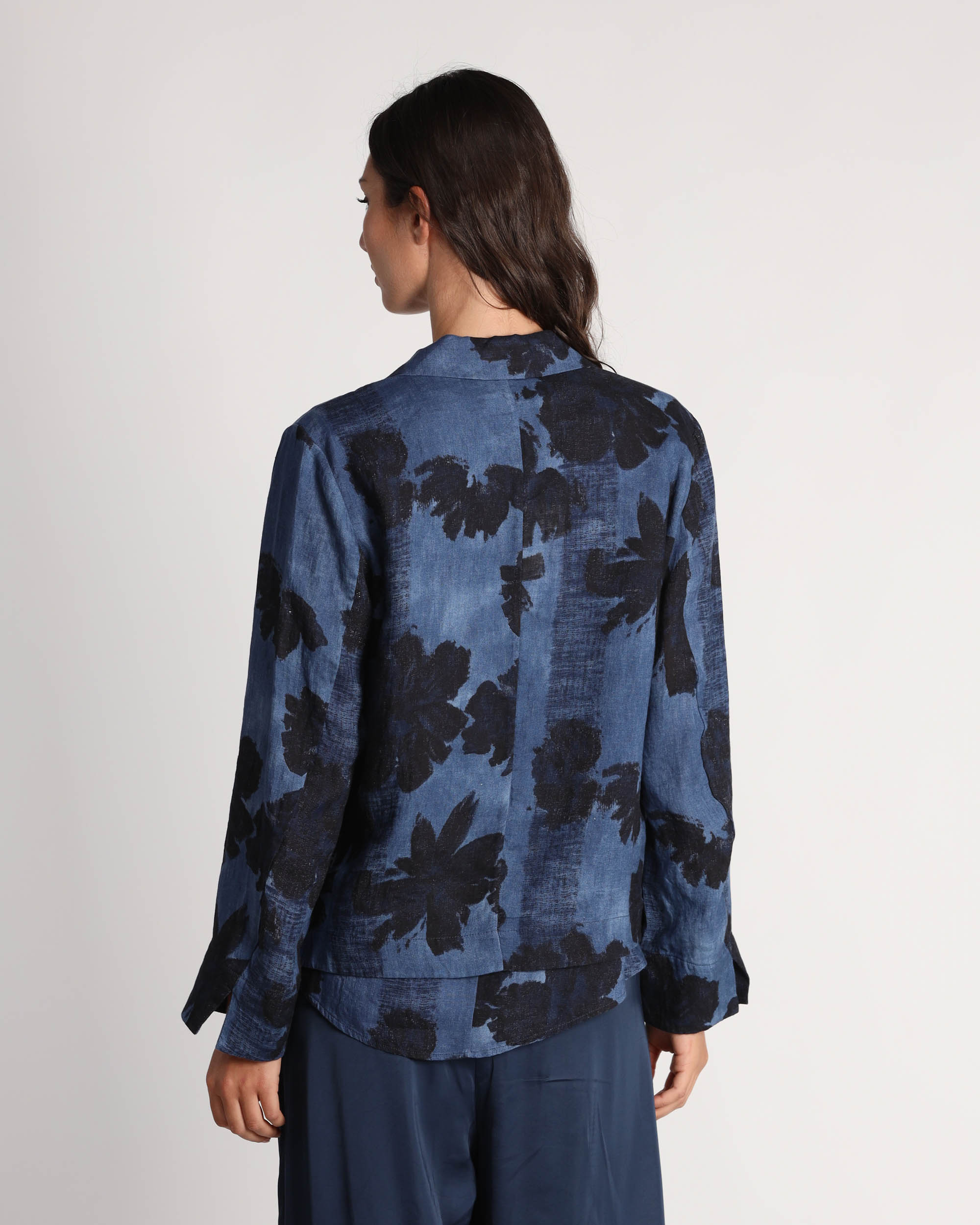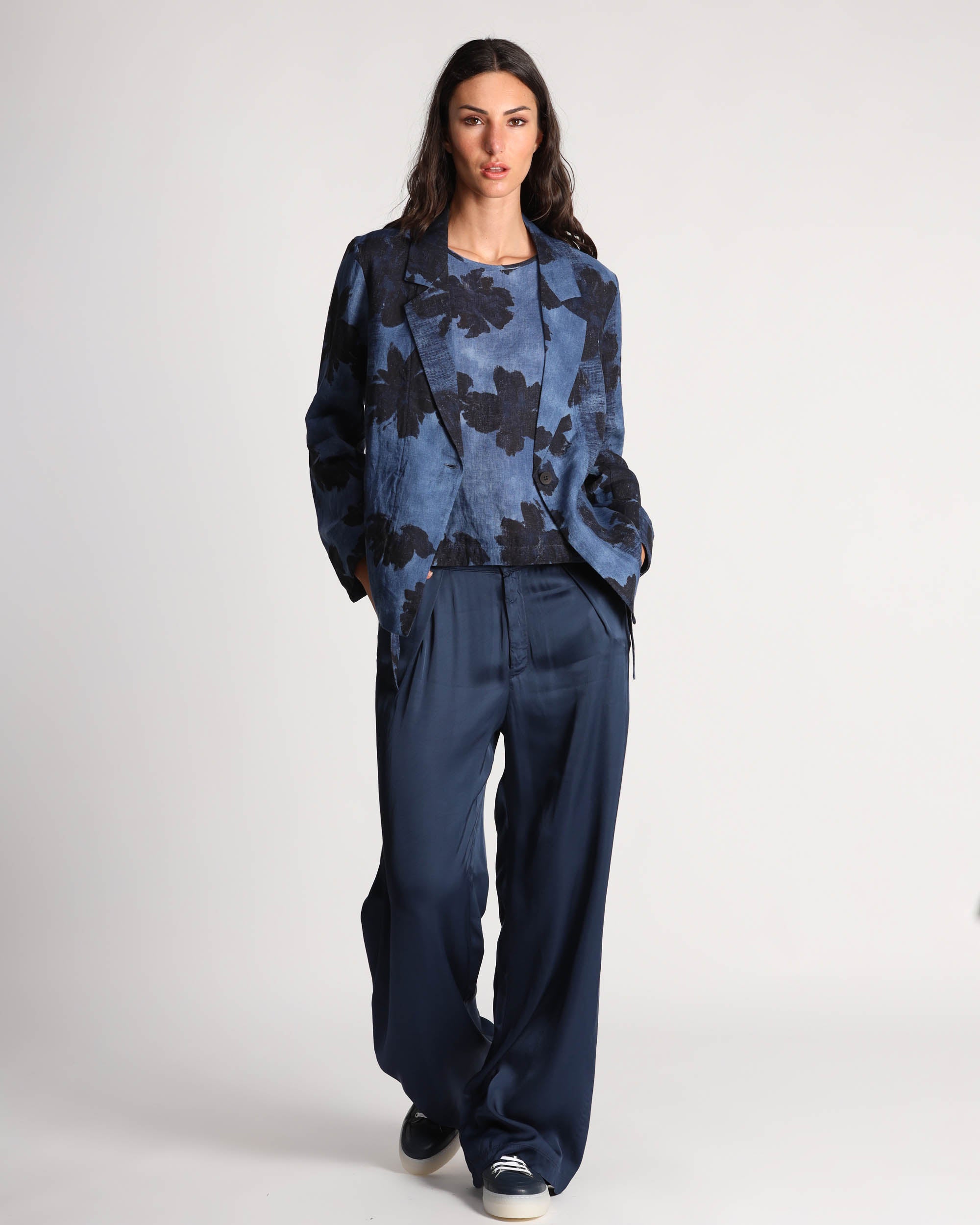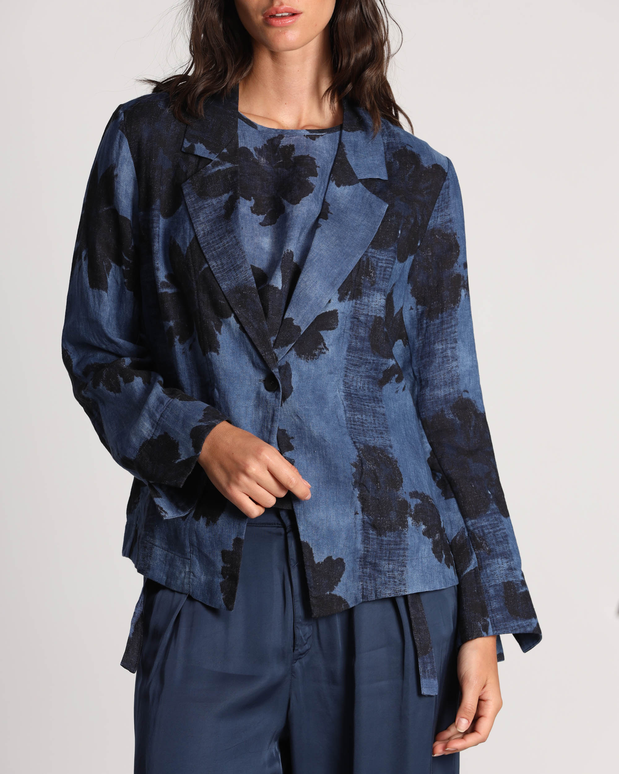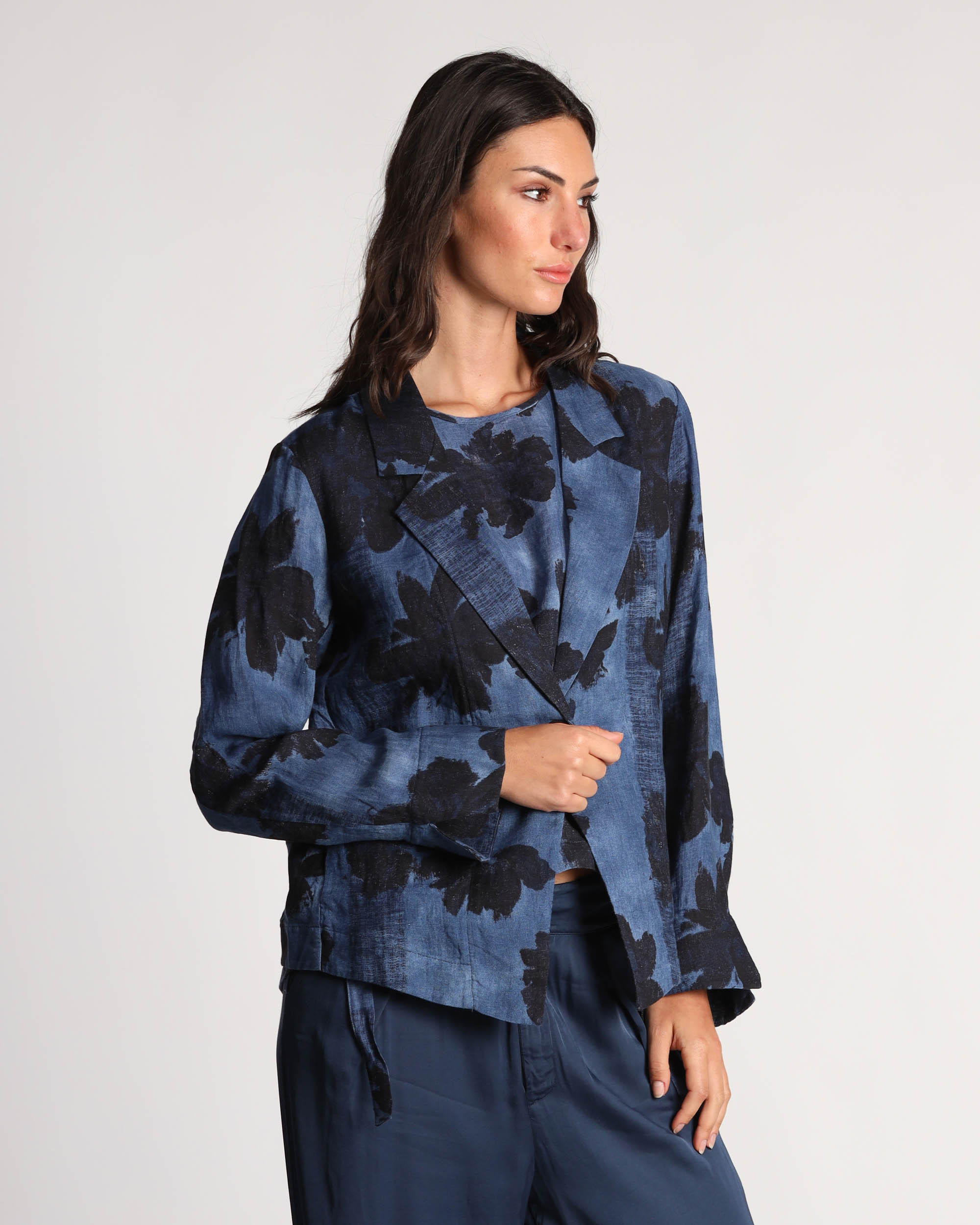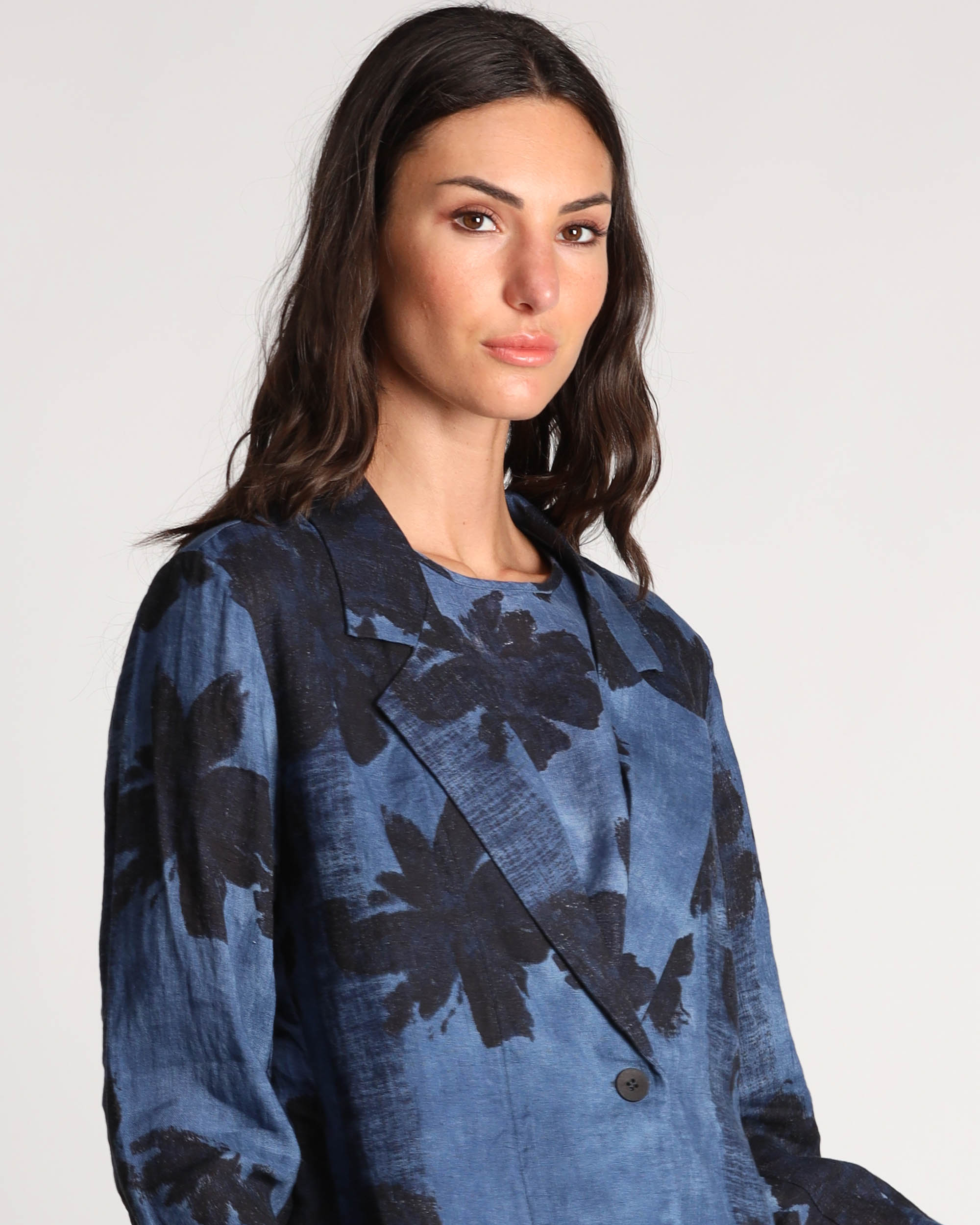 Giacca in lino a fantasia blu, collo a rever, maniche lunghe, chiusura con bottone, tasche a filetto, linea morbida, sfoderata, made in Italy, la modella indossa una tg.42, la modella ha le seguenti misure: altezza 178, seno 86,vita 65, fianchi 93, collezione donna Tandem Primavera Estate 2025