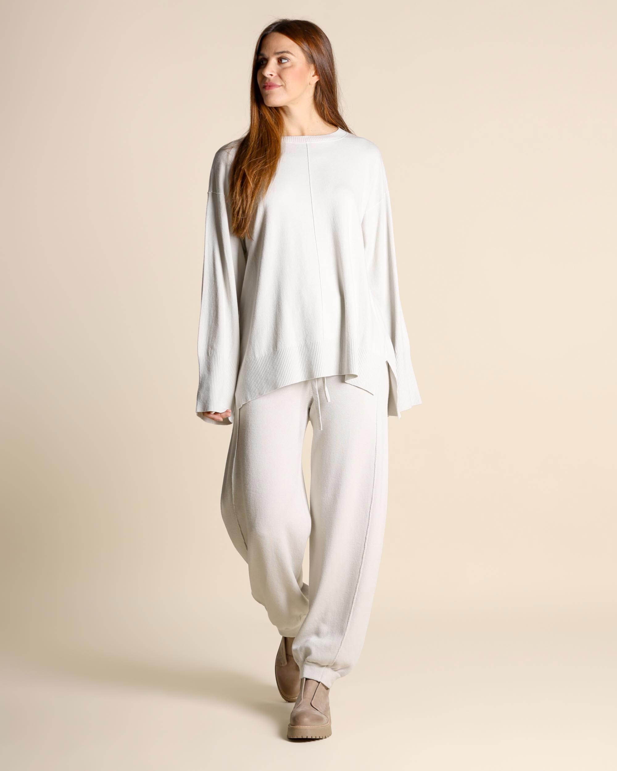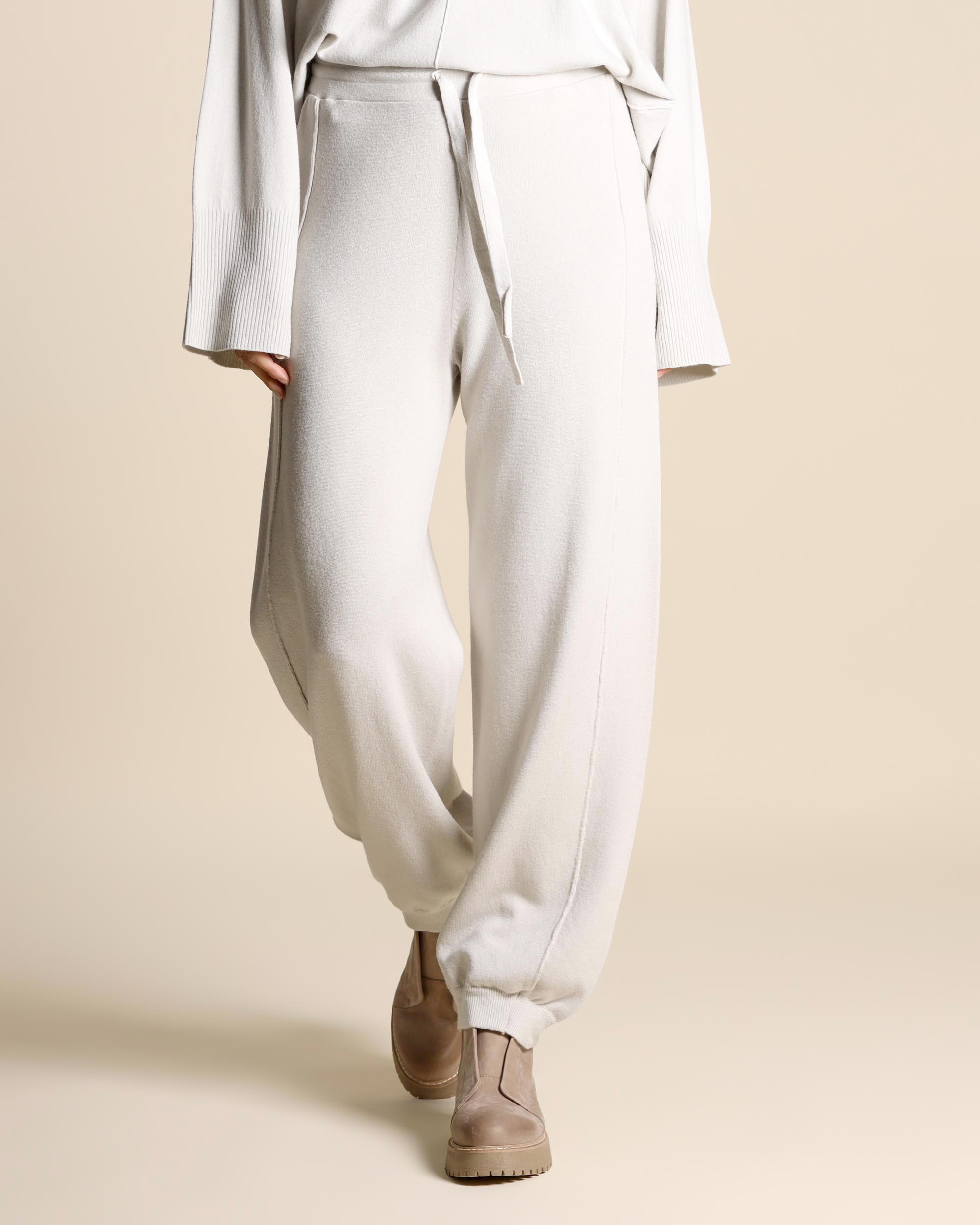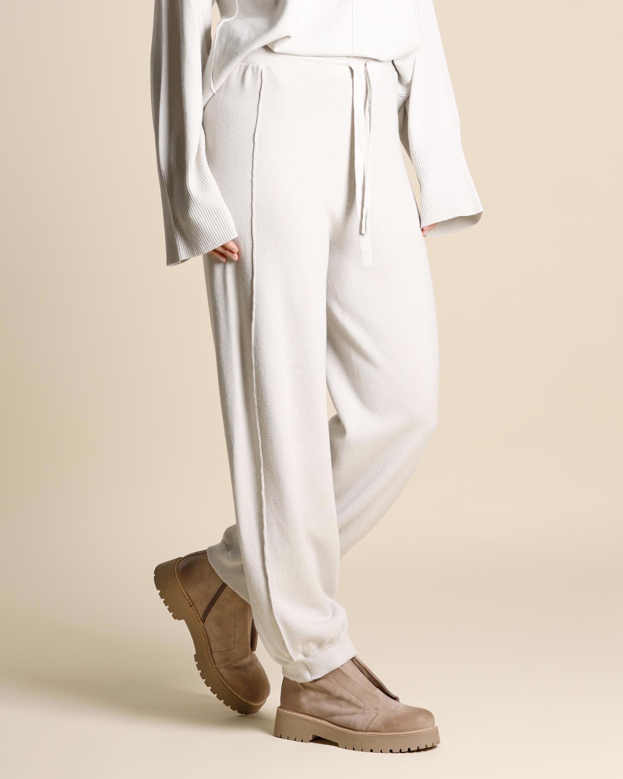 Pantaloni color gesso in maglia rasata di viscosa e lana stretch, linea morbida leggermente più stretta sul fondo, vita elastica con coulisse, dettaglio di nervatura sul davanti, made in Italy, la modella indossa una tg.42, la modella ha le seguenti misure: altezza 177, seno 87,vita 65, fianchi 93, collezione donna Transit Autunno Inverno 2025/26