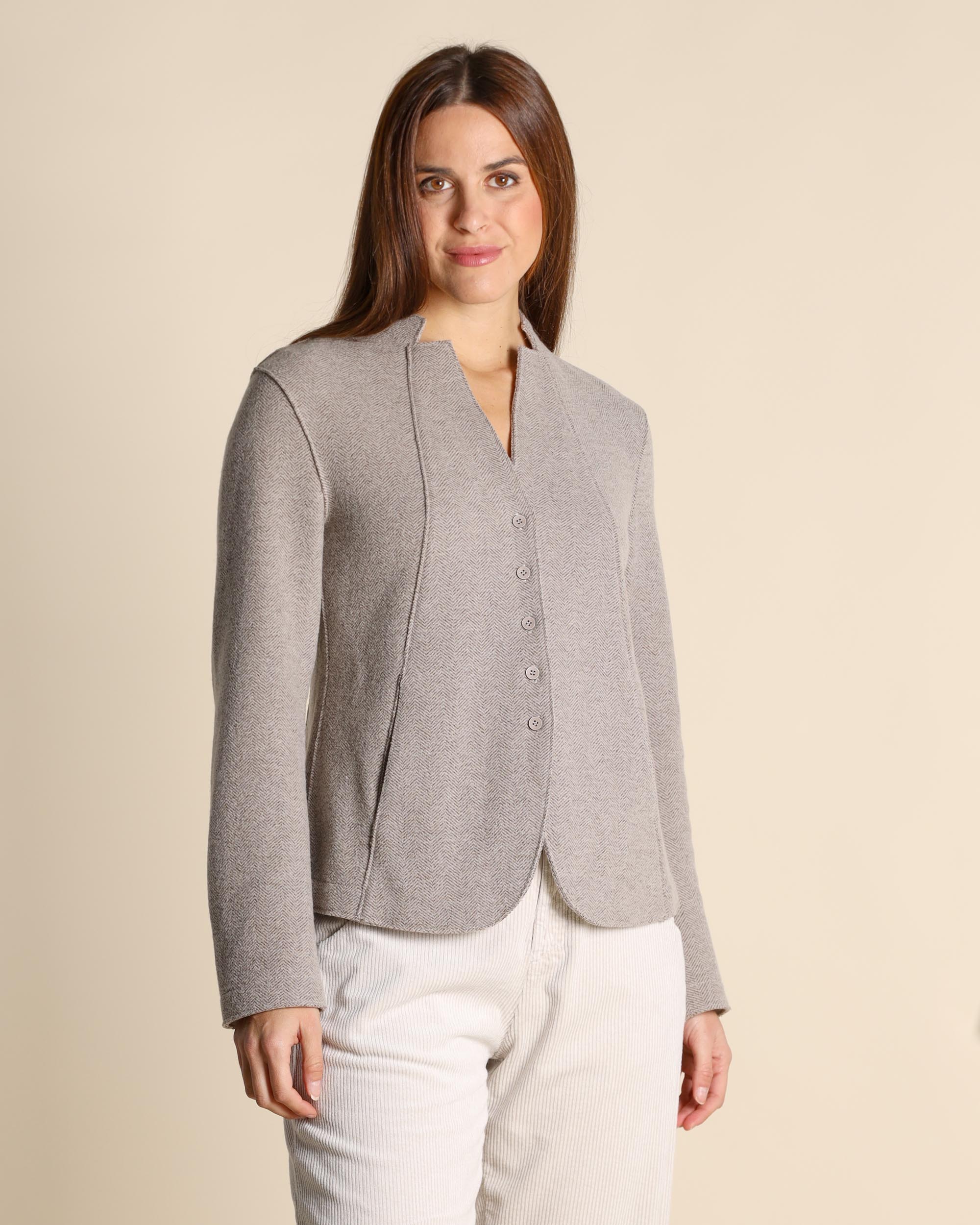 Giacca nocciola spinata in maglia di lana e viscosa, chiusura con bottoni, linea semiaderente, maniche lunghe, impunture sui tagli a vivo, tasche a filetto, sfoderata, made in Italy, la modella indossa una tg.42, la modella ha le seguenti misure: altezza 178, seno 86,vita 65, fianchi 93, collezione donna Transit Autunno Inverno 2025/26