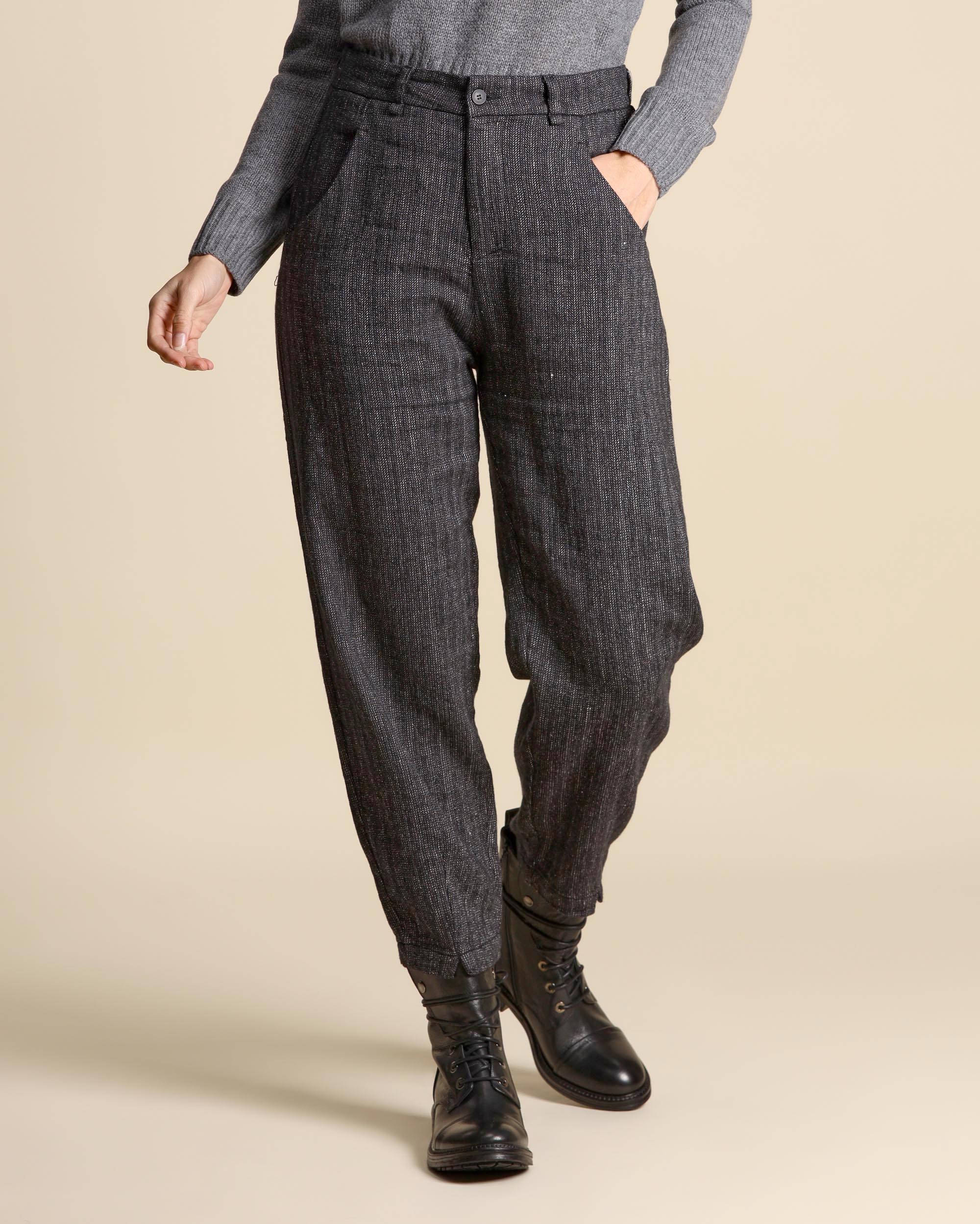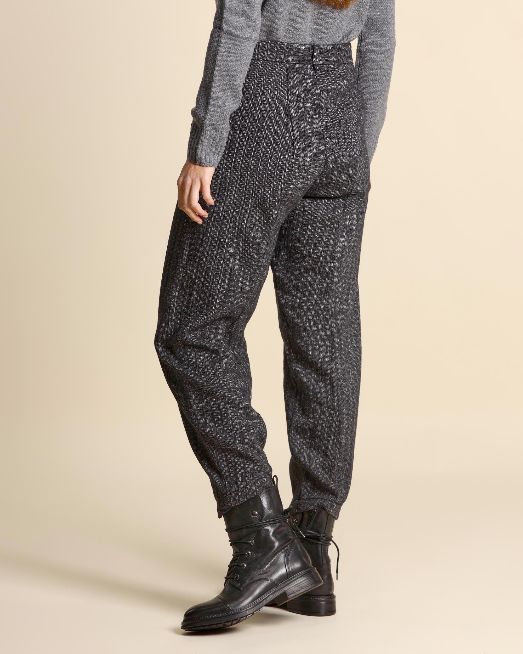Pantaloni neri spinati in misto cotone e lana, linea morbida leggermente più stretta sul fondo, chiusura con bottone e zip nascosta, tasche alla francese arrotondate sul davanti e finta tasca a filetto sul dietro piccolo spacco sul fondo, made in Italy, la modella indossa una tg.42, la modella ha le seguenti misure: altezza 177, seno 87,vita 65, fianchi 93, collezione donna Transit Autunno Inverno 2025/26