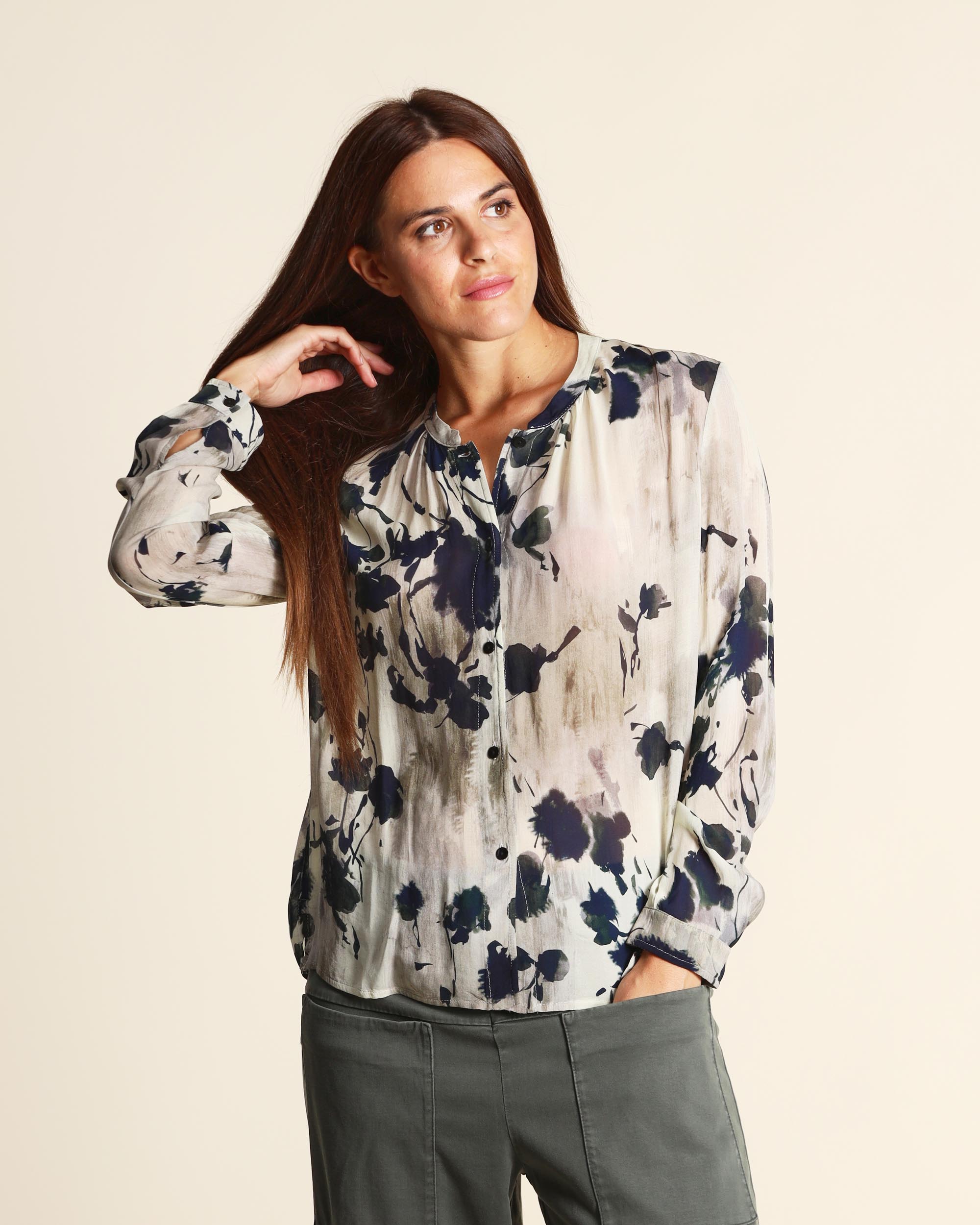 Camicia in georgette di viscosa stampata color sabbia, collo alla coreana, linea morbida, chiusura con bottoni, maniche lunghe con polsino, made in Italy, la modella indossa una tg.42, la modella ha le seguenti misure: altezza 178, seno 86,vita 65, fianchi 93, collezione donna Transit Autunno Inverno 2025/26