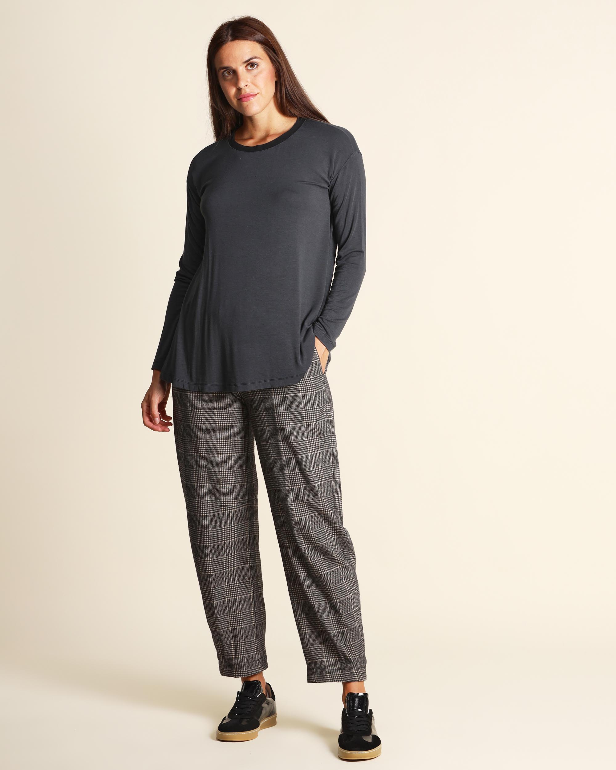 T shirt in jersey di modal stretch, tinta in capo, scollo tondo con profilo in crepe di viscosa tono su tono, linea ampia, maniche lunghe, made in Italy, la modella indossa una tg.42, la modella ha le seguenti misure: altezza 178, seno 86,vita 65, fianchi 93, collezione donna Transit Autunno Inverno 2025/26