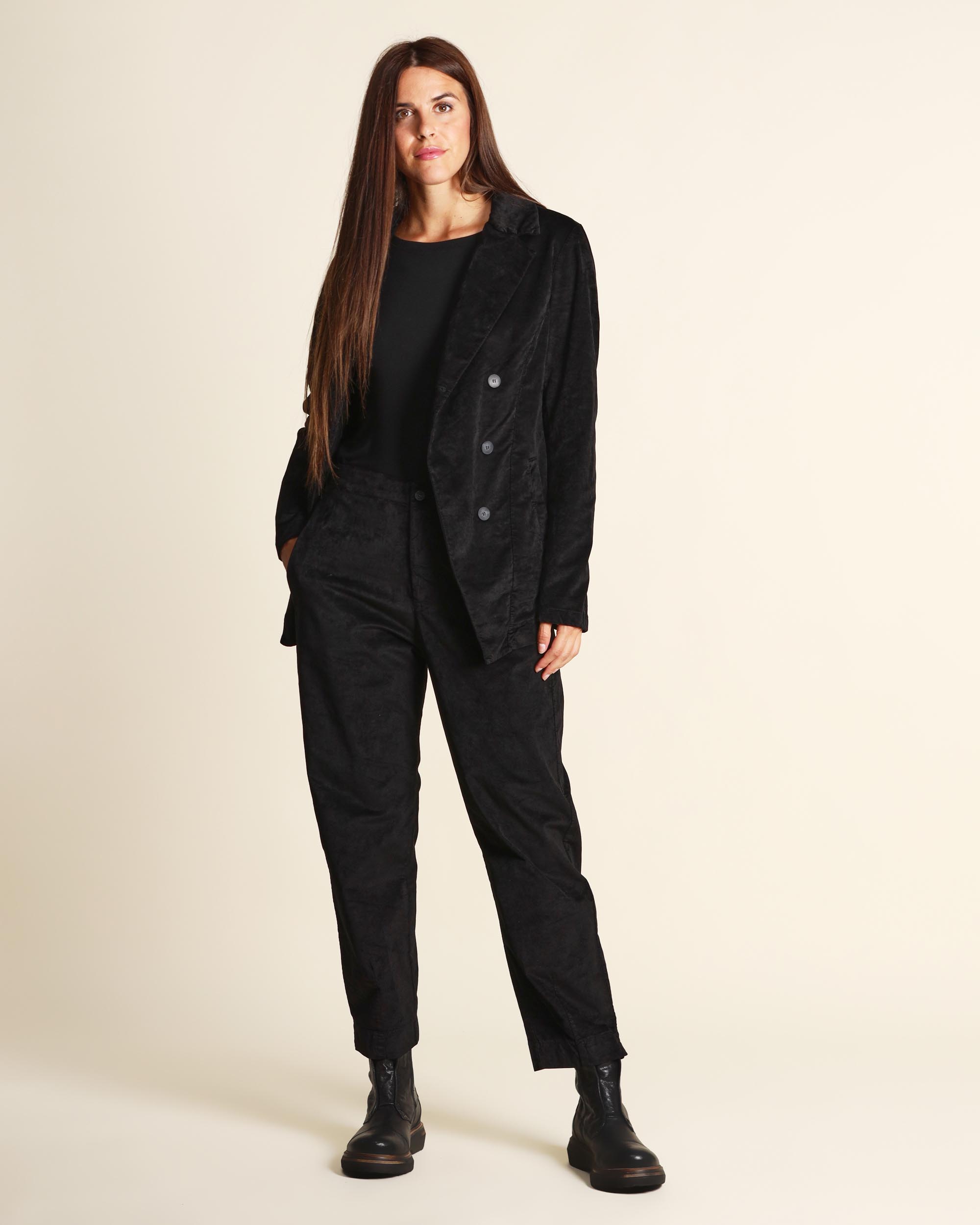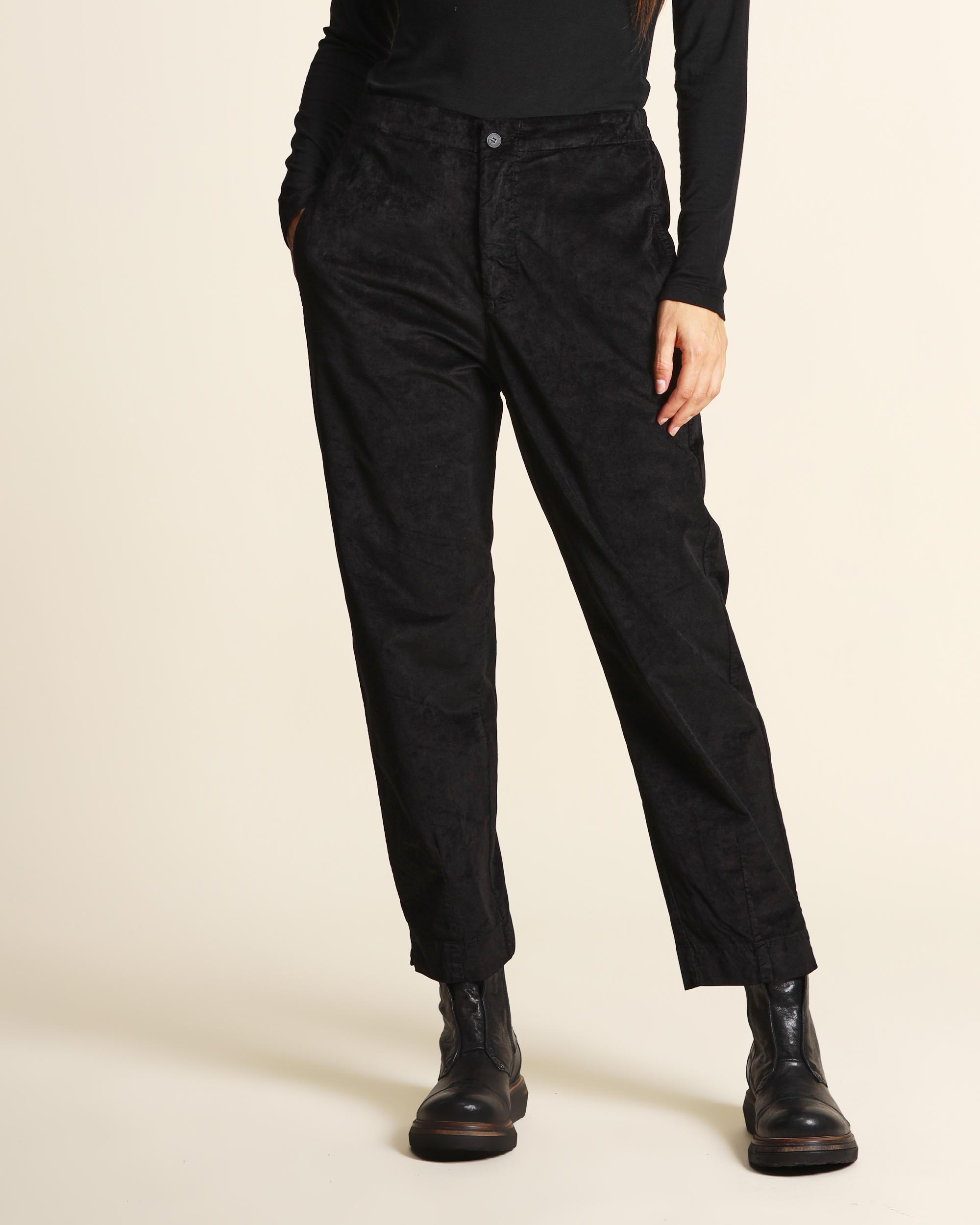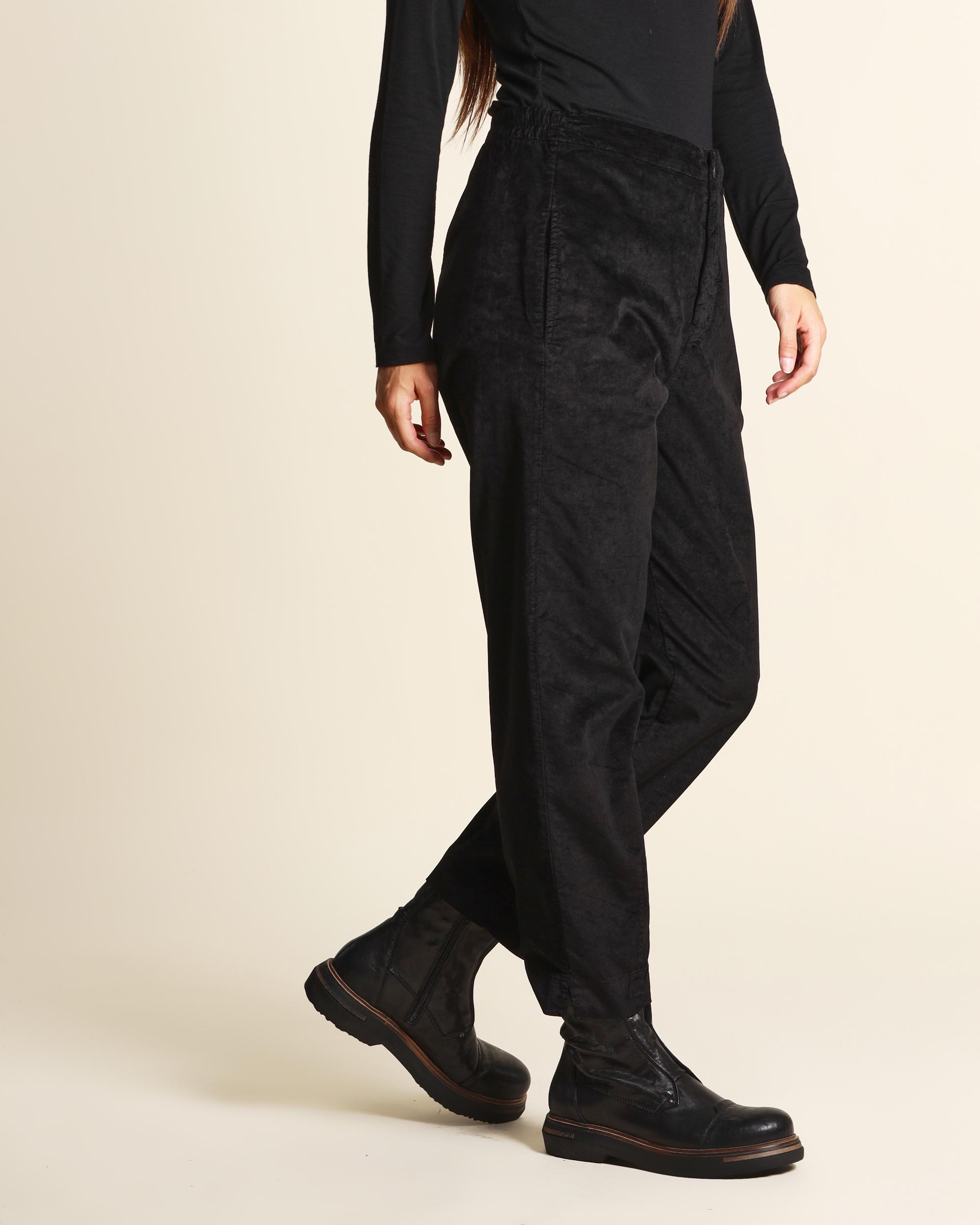 Pantaloni neri in velluto di cotone e viscosa stretch, tinti in capo, chiusura con bottone e zip nascosta, linea dritta, tasche inserite sul fianco, piccolo spacco laterale sul fondo, made in Italy, la modella indossa una tg.42, la modella ha le seguenti misure: altezza 178, seno 86,vita 65, fianchi 93, collezione donna Transit Autunno Inverno 2025/26