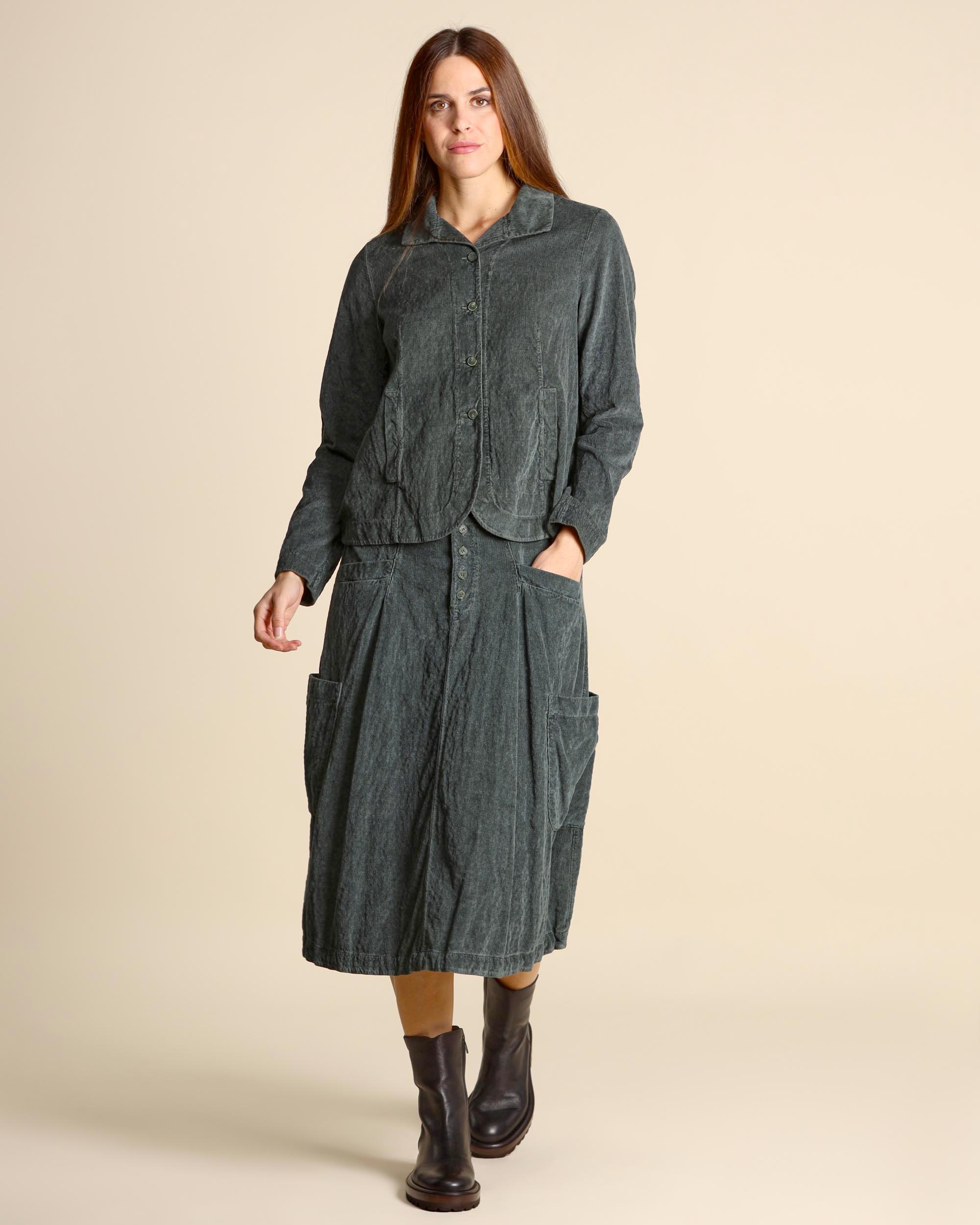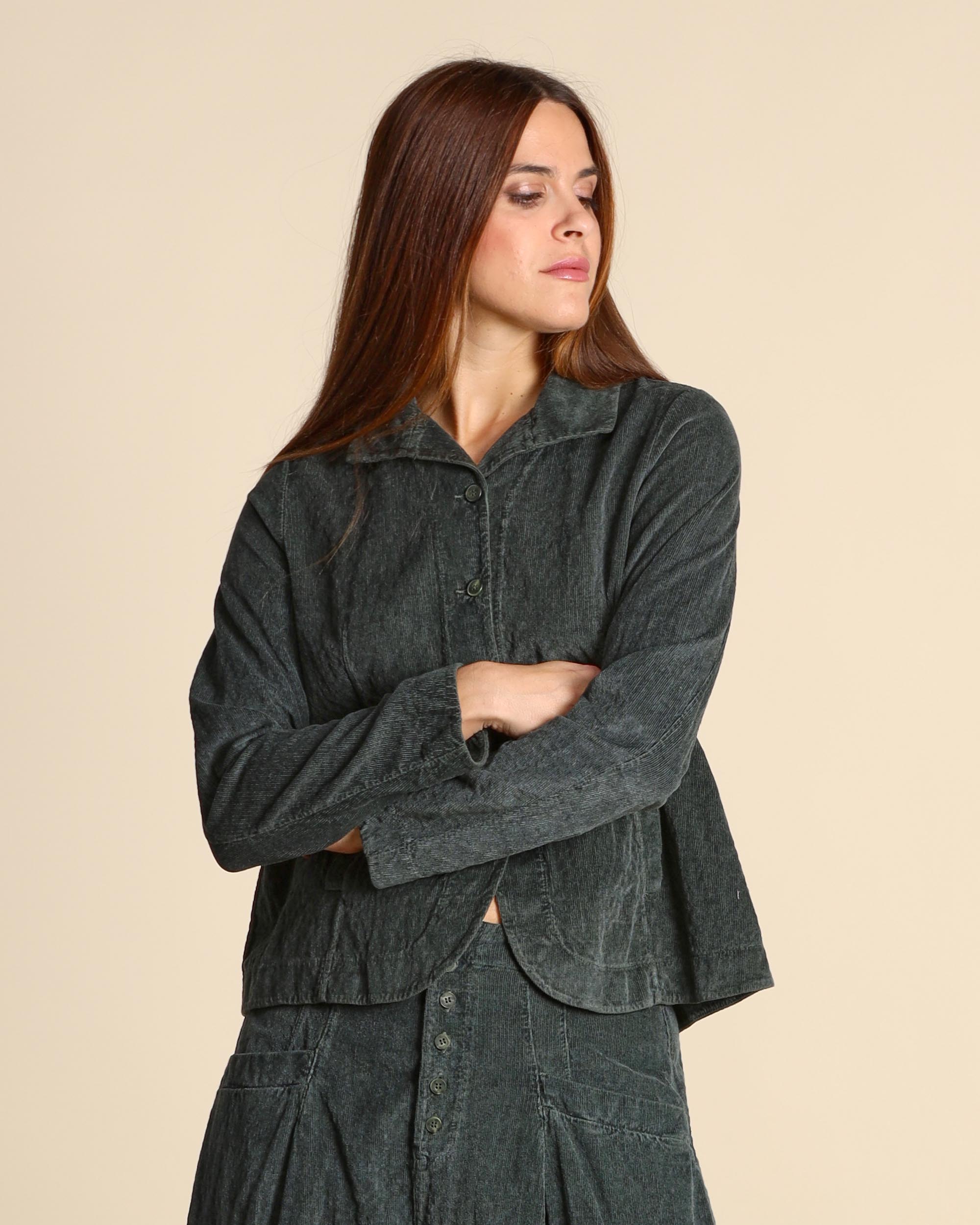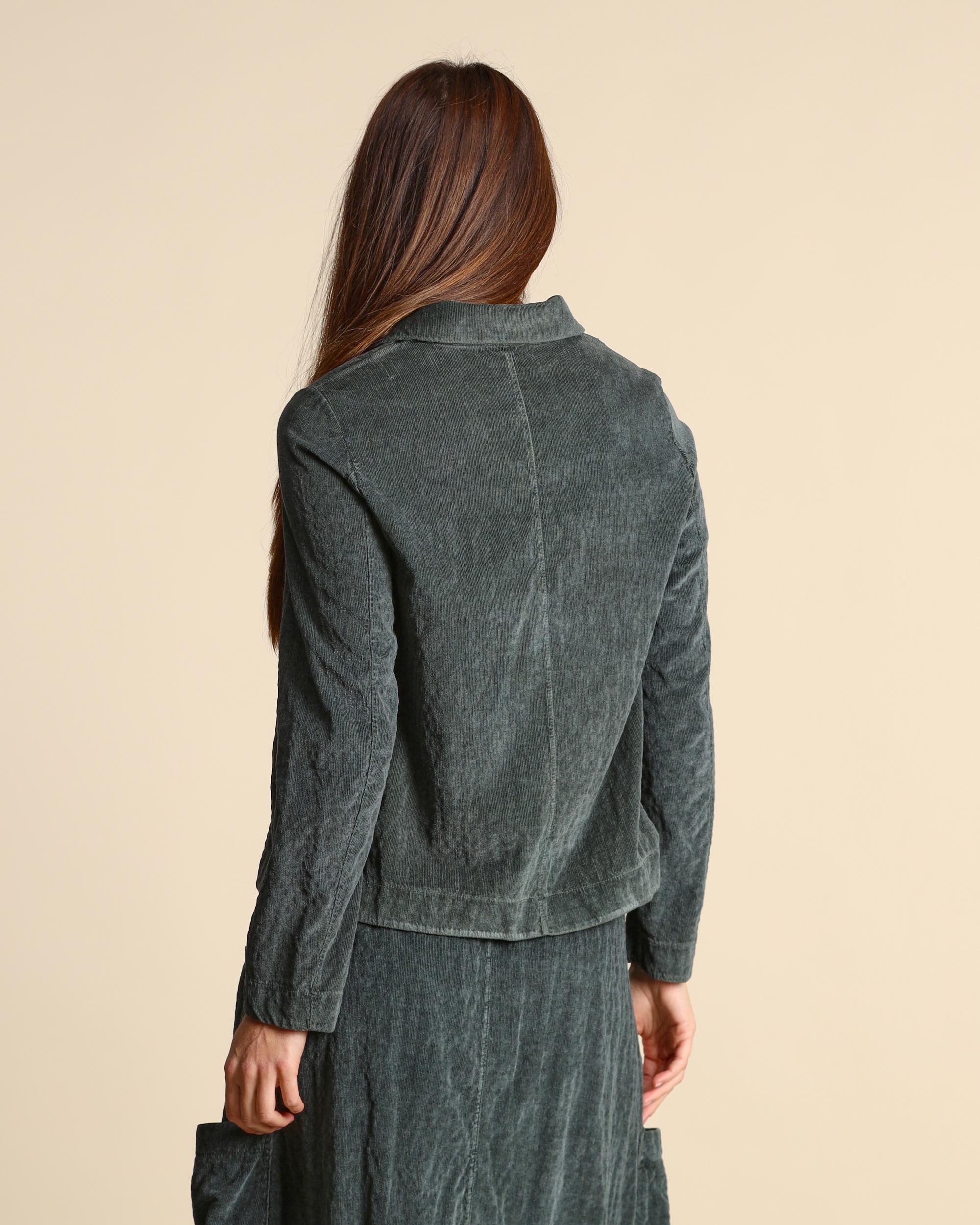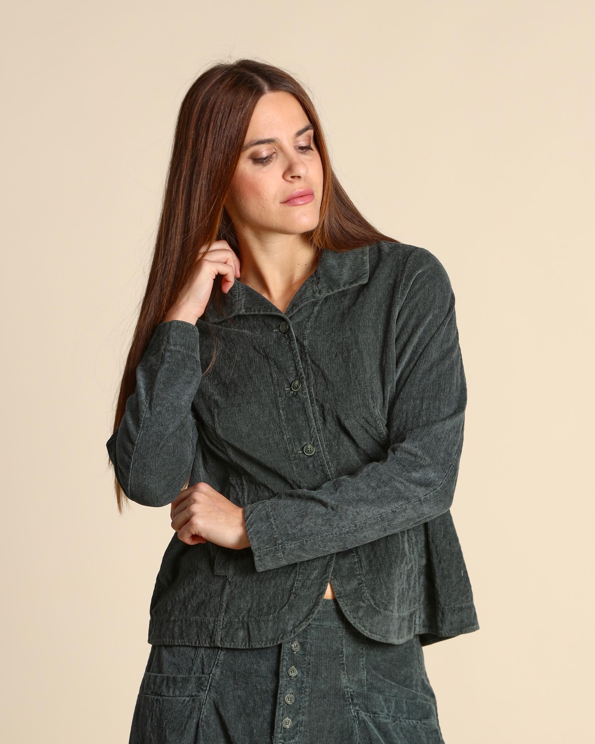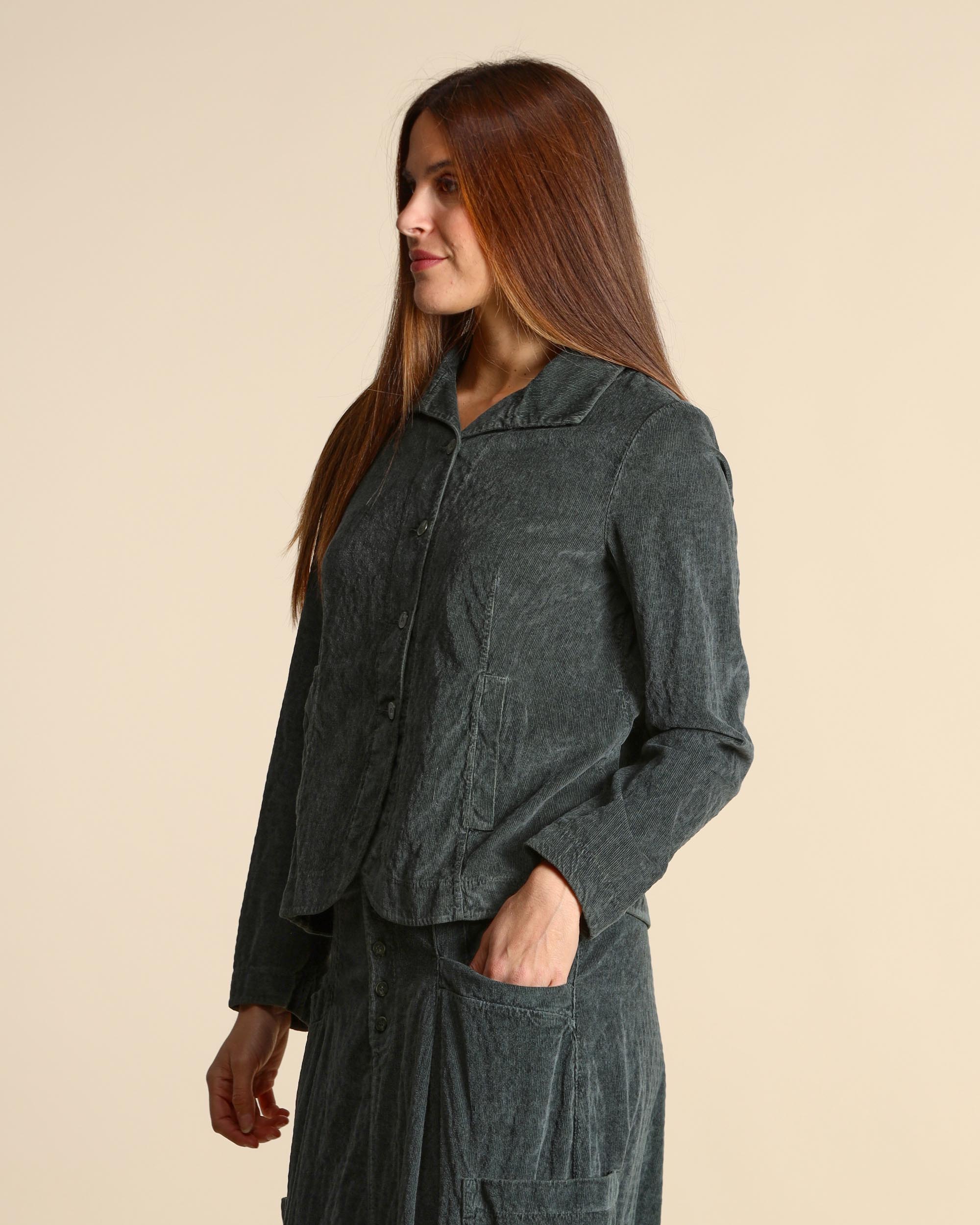 Giacca verde in velluto a coste di viscosa e cotone stretch effetto goffrato, tinto in capo, chiusura con bottoni, linea morbida, maniche lunghe, tasche a filetto, sfoderata, made in Italy, la modella indossa una tg.42, la modella ha le seguenti misure: altezza 178, seno 86,vita 65, fianchi 93, collezione donna Transit Autunno Inverno 2025/26