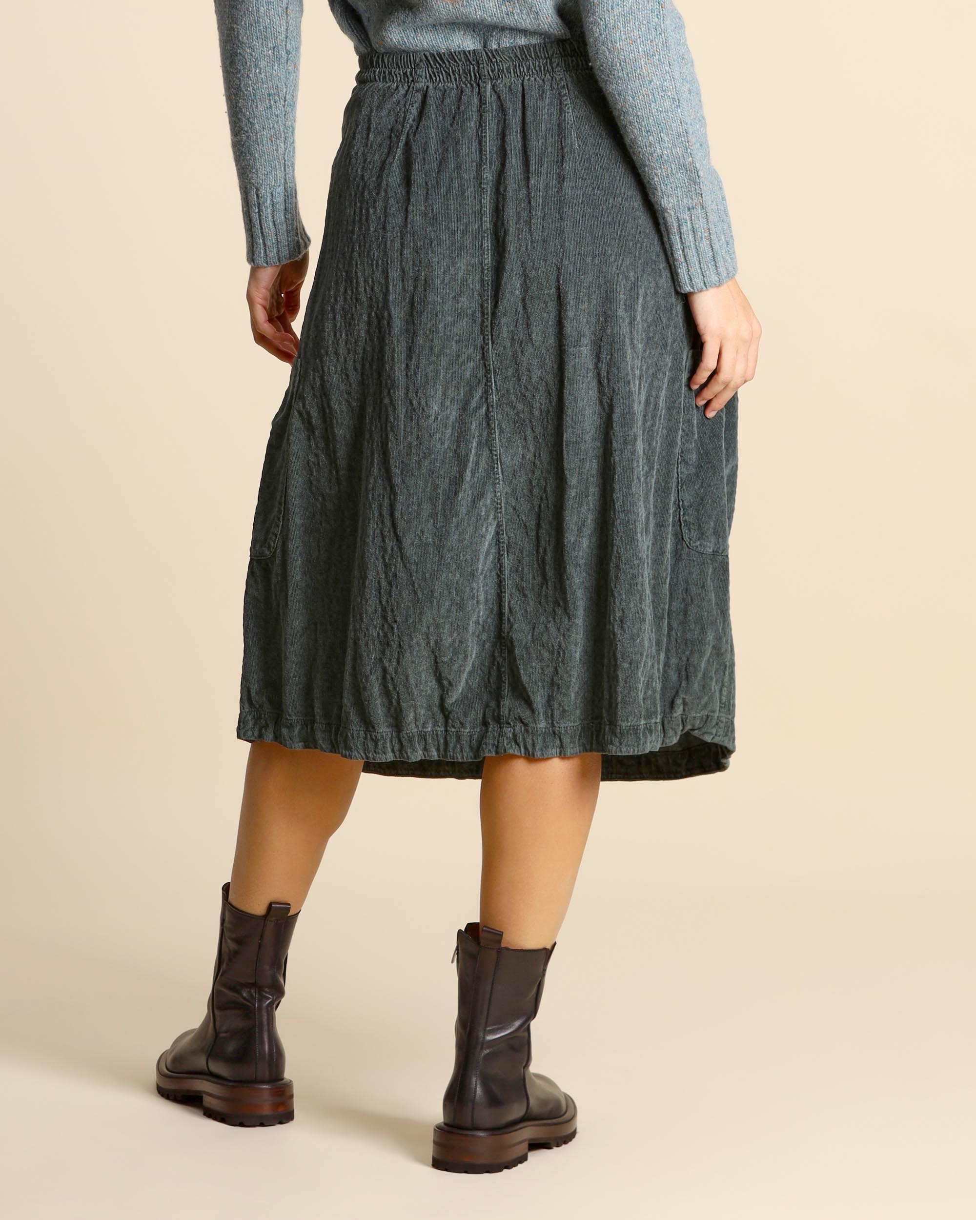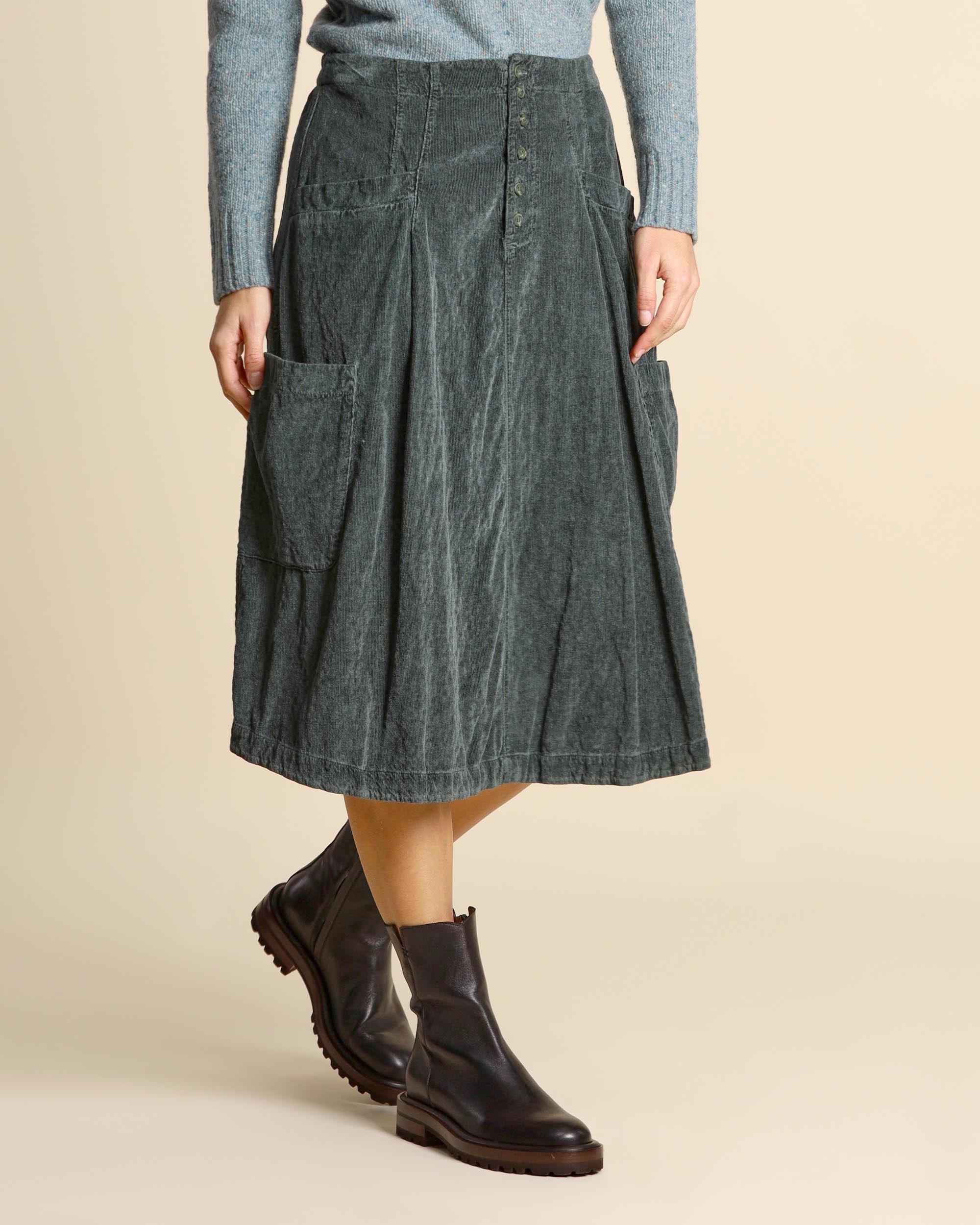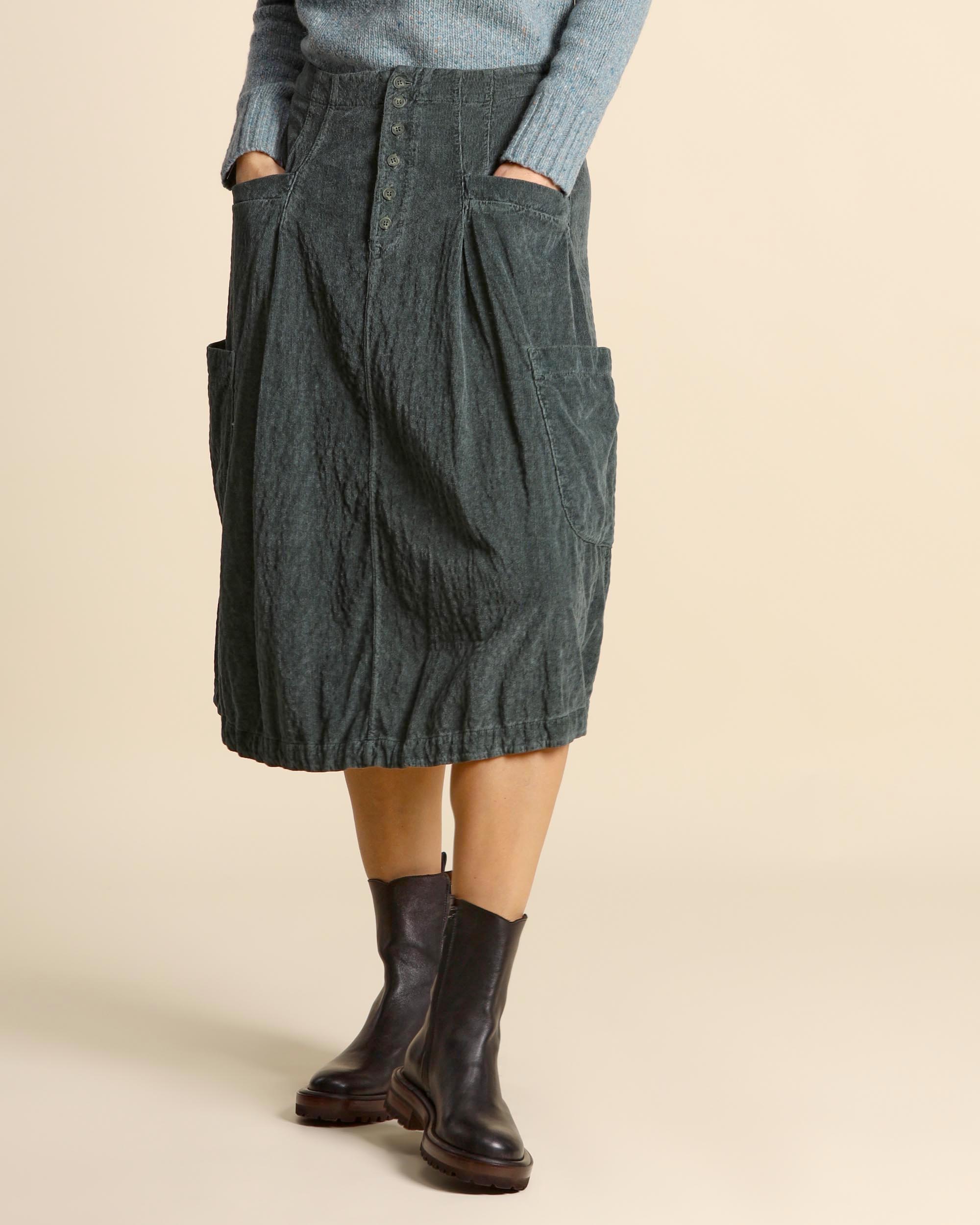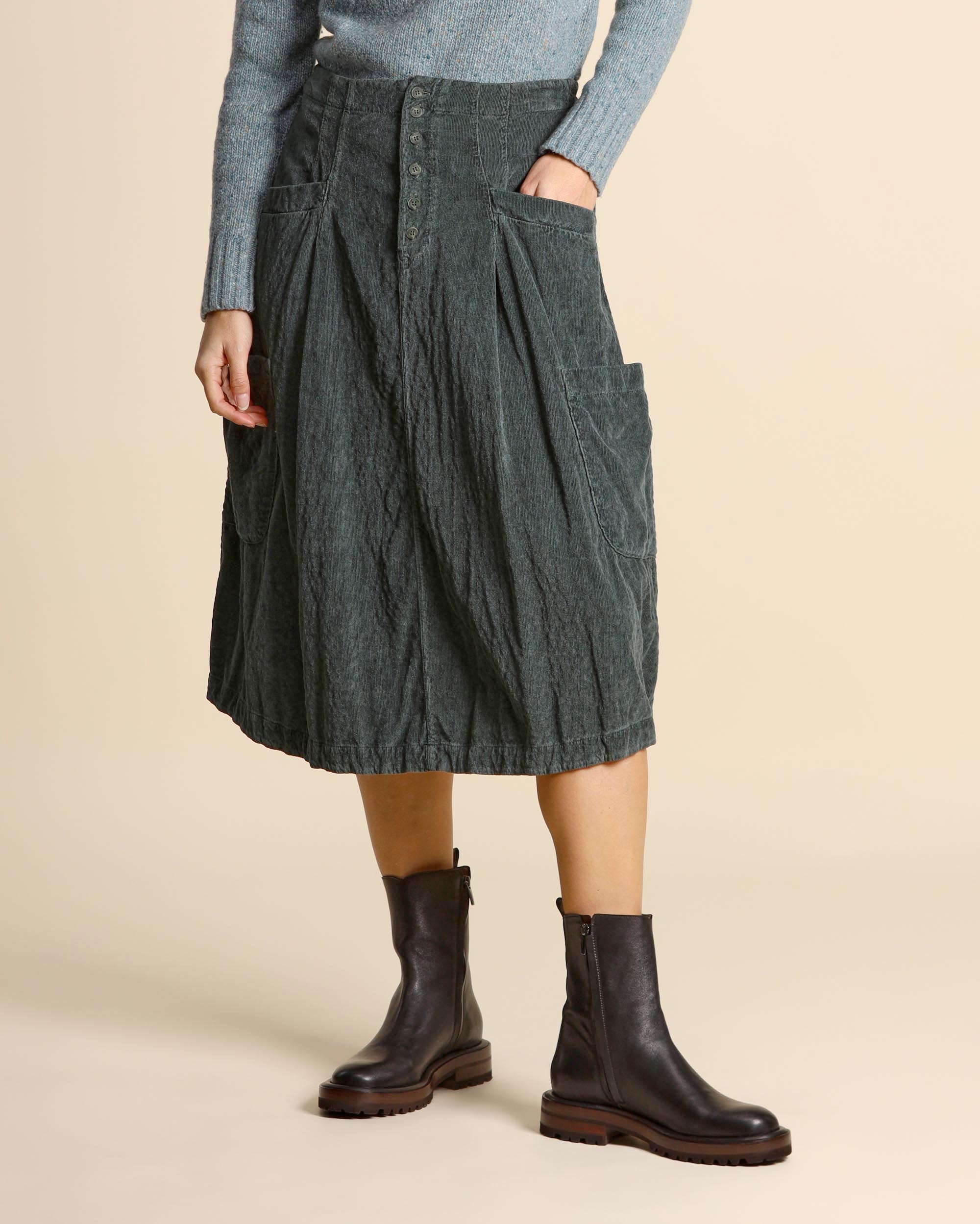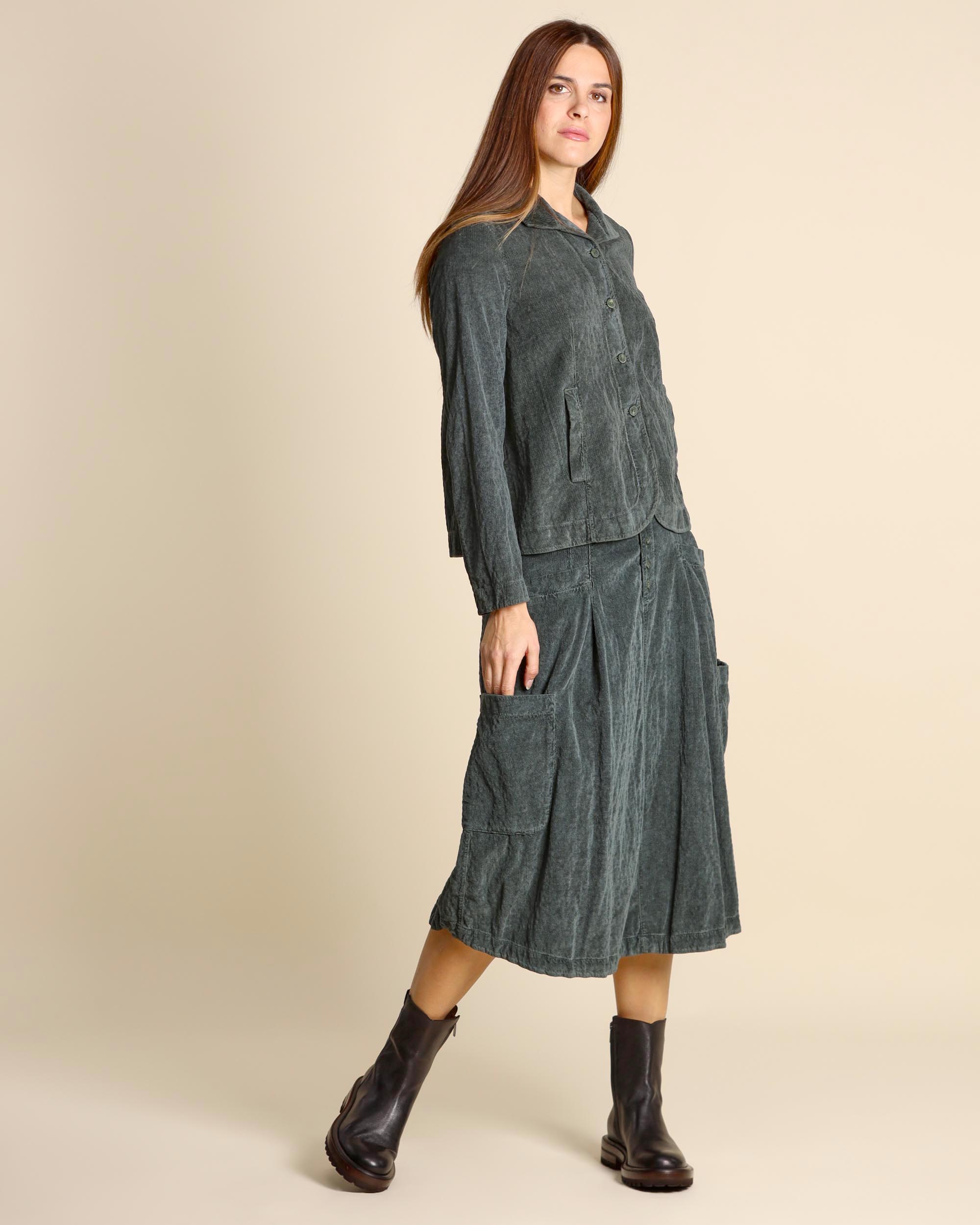 Gonna verde in velluto a coste effetto goffrato in viscosa e cotone stretch, tinta in capo, sfoderata, linea morbida con coulisse sul fondo, chiusura con bottoni, vita elastica sul dietro, tasche applicate laterali, made in Italy, la modella indossa una tg.42, la modella ha le seguenti misure: altezza 177, seno 87,vita 65, fianchi 93, collezione donna Transit Autunno Inverno 2025/26