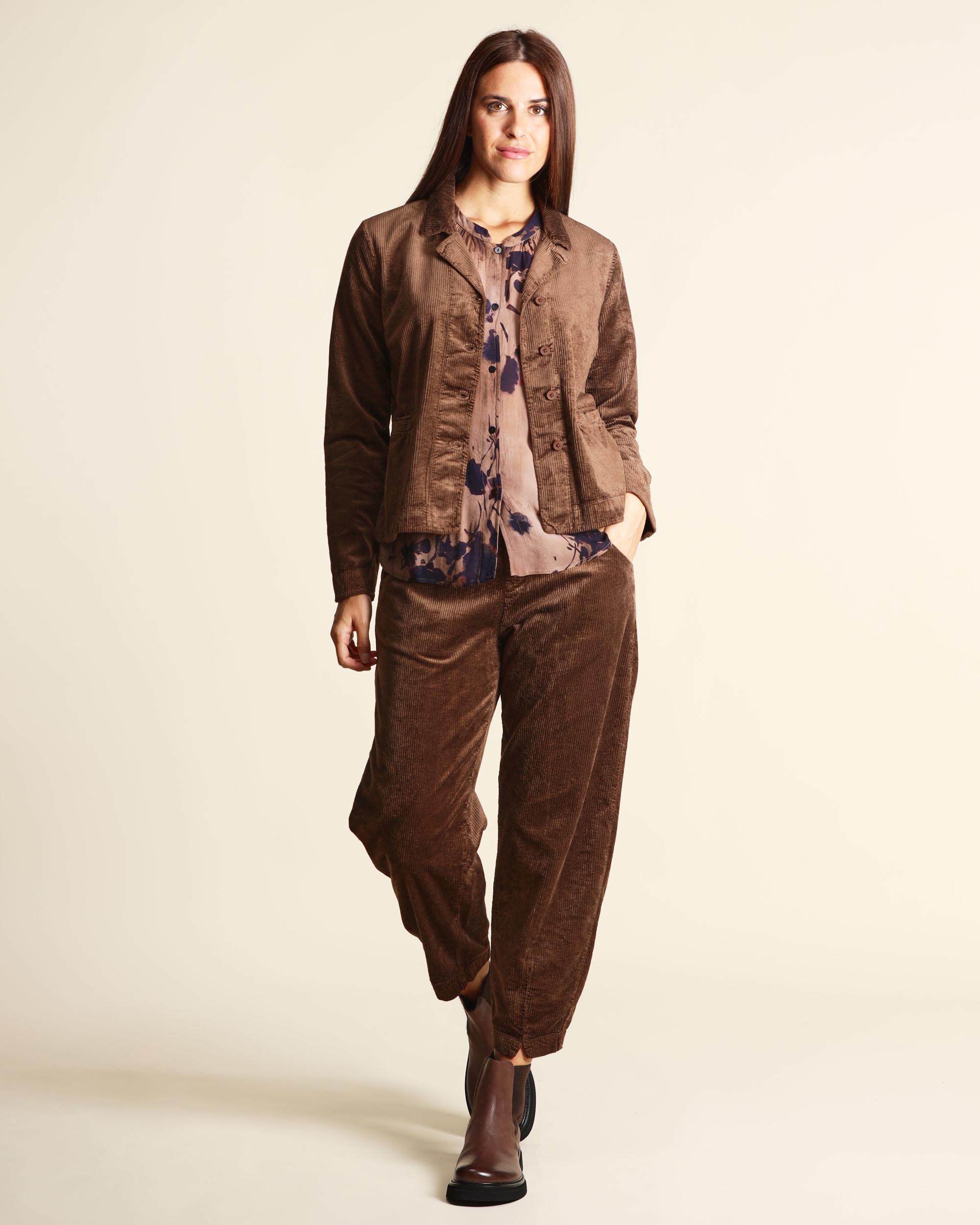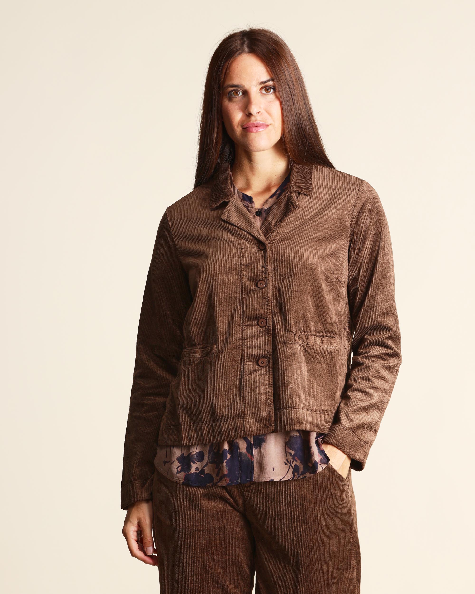 Giacca color tabacco in velluto a coste di viscosa e cotone stretch, tinta in capo, collo a rever, linea boxy, chiusura con bottoni, tasche a filetto, maniche lunghe, sfoderata, made in Italy, la modella indossa una tg.42, la modella ha le seguenti misure: altezza 178, seno 86,vita 65, fianchi 93, collezione donna Transit Autunno Inverno 2025/26