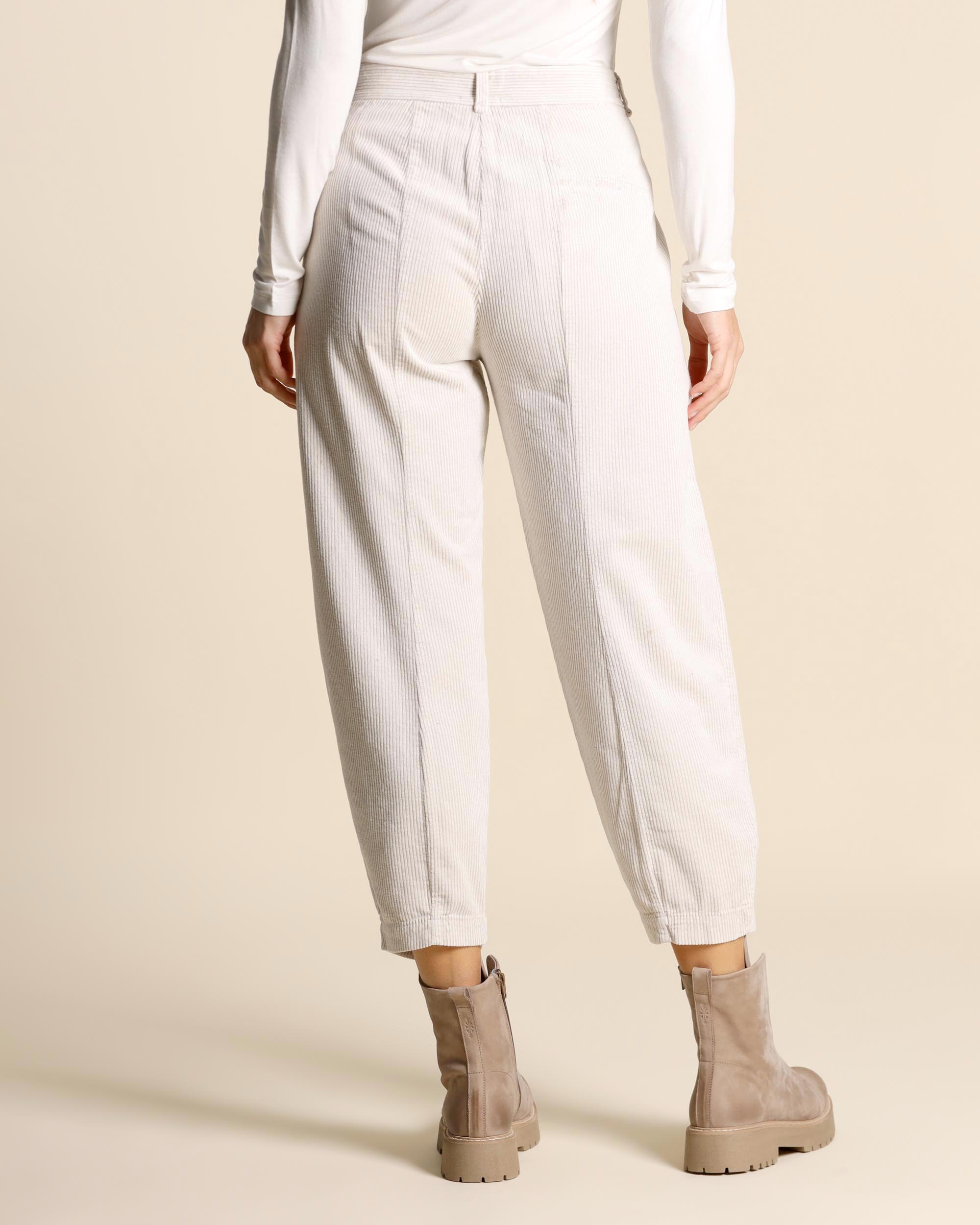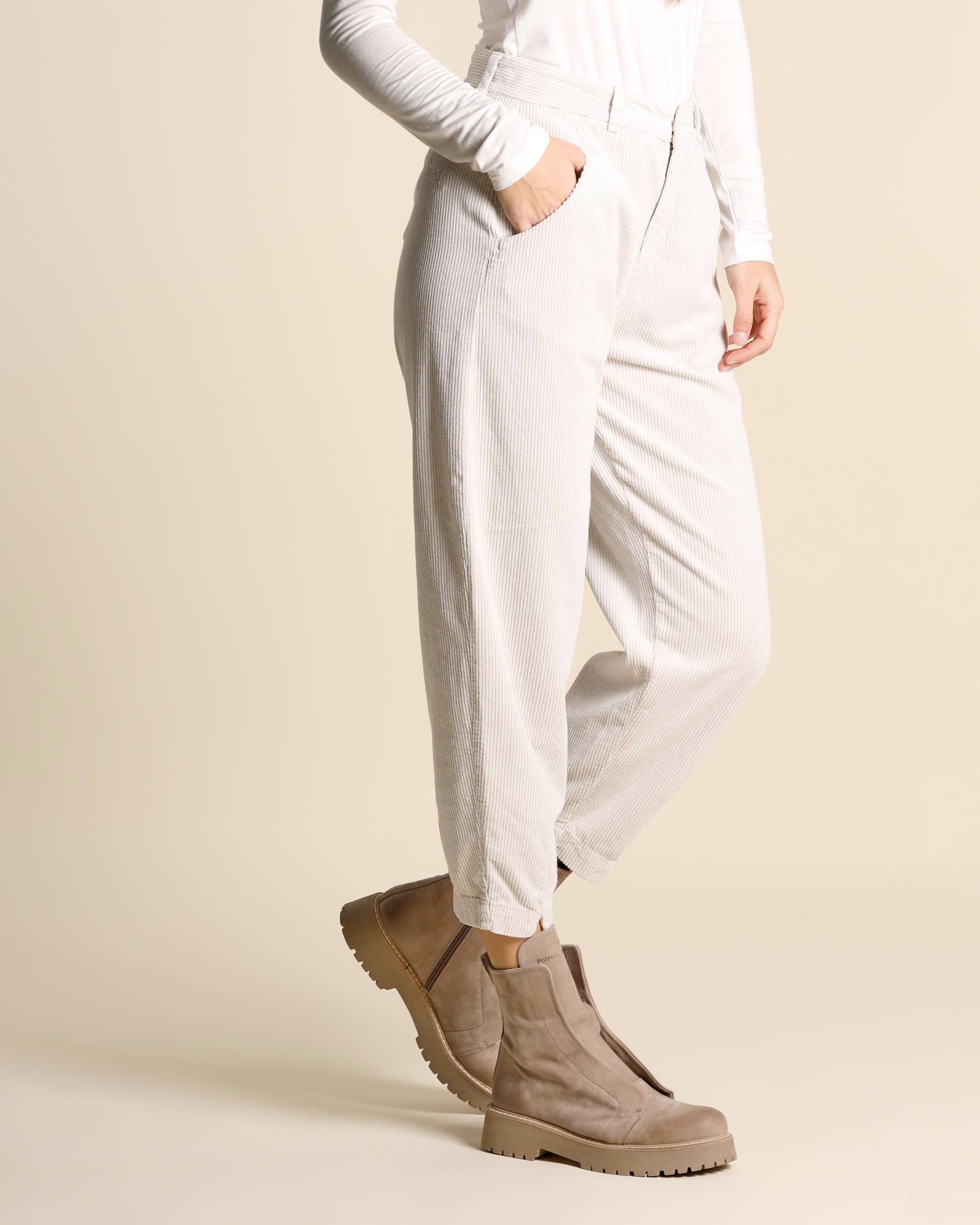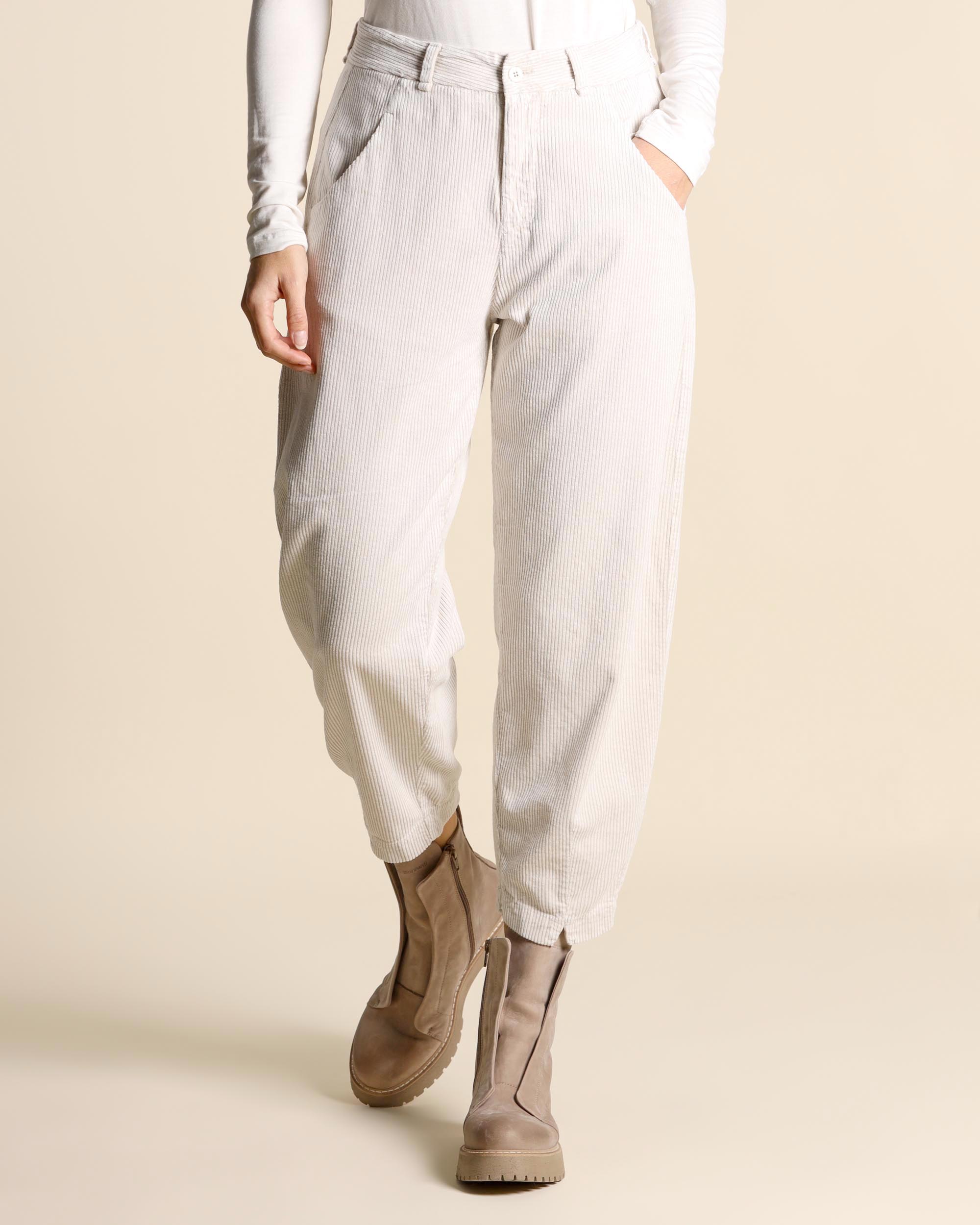 Pantaloni color gesso in velluto a coste in viscosa e cotone stretch, linea morbida leggermente più stretta sul fondo, chiusura con bottone e zip nascosta, tasche alla francese arrotondate e finta tasca a filetto sul dietro, piccolo spacco sul fondo, made in Italy, la modella indossa una tg.42, la modella ha le seguenti misure: altezza 177, seno 87,vita 65, fianchi 93, collezione donna Transit Autunno Inverno 2025/26