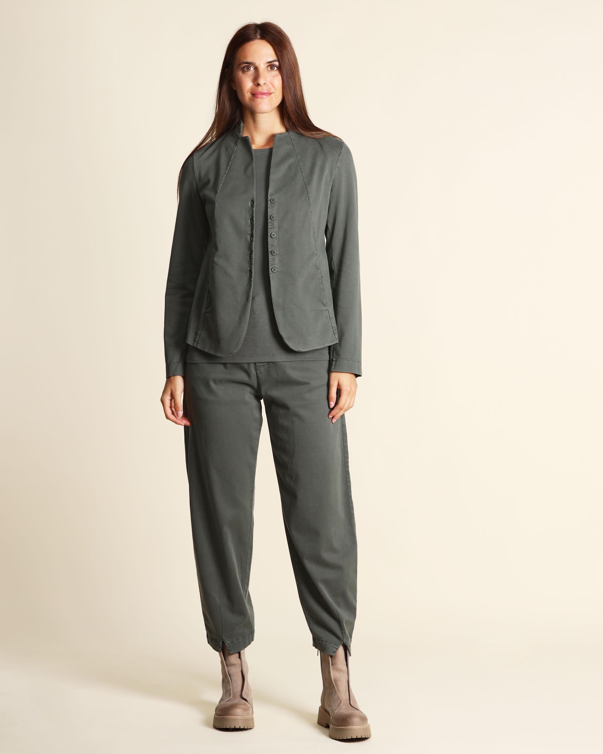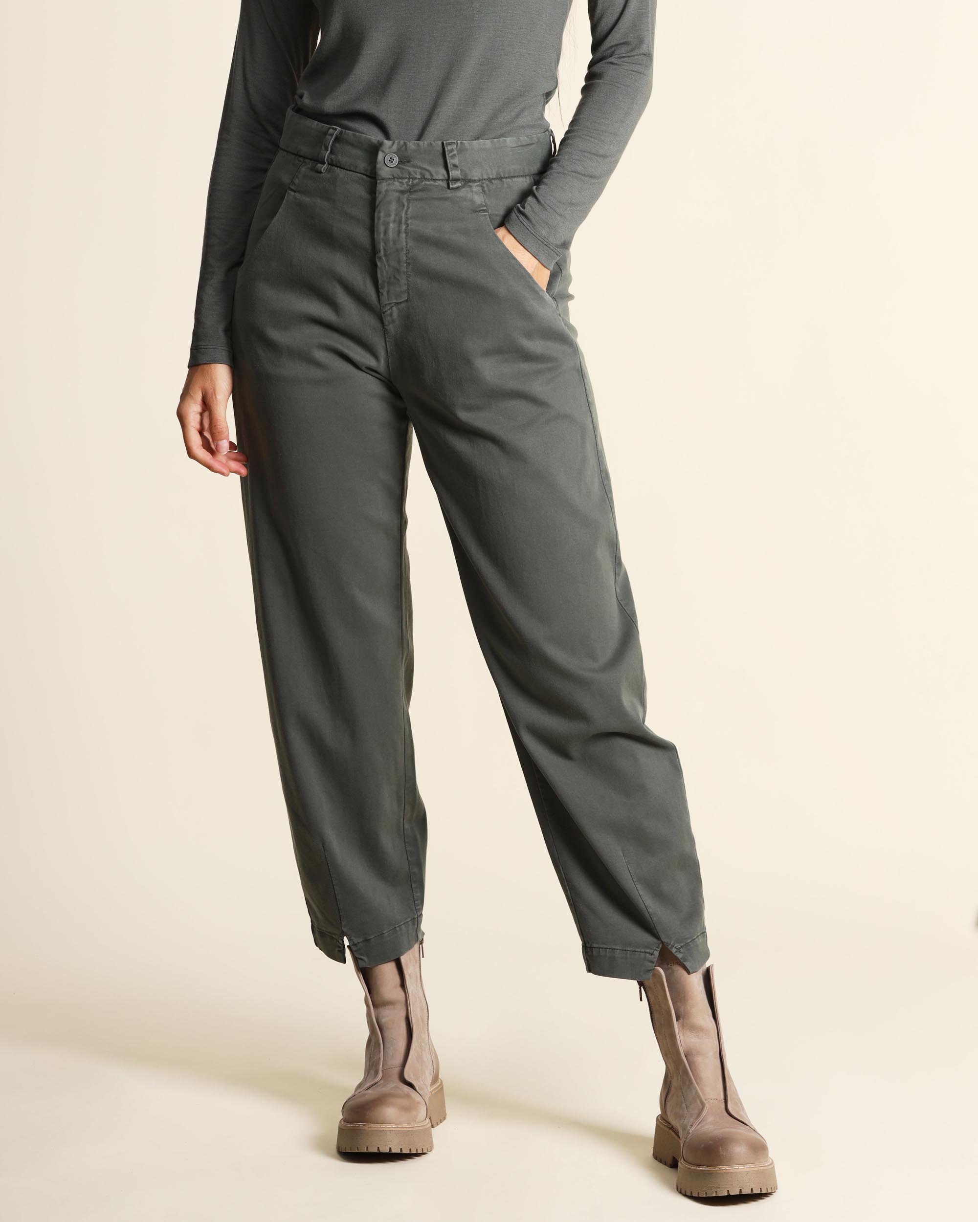 Pantaloni verdi in lyocell, modal e cotone stretch, tinti in capo, chiusura con bottone e zip nascosta, linea morbida, tasche arrotondate sul davanti e tasca a filetto sul dietro, made in Italy, la modella indossa una tg.42, la modella ha le seguenti misure: altezza 178, seno 86,vita 65, fianchi 93, collezione donna Transit Autunno Inverno 2025/26