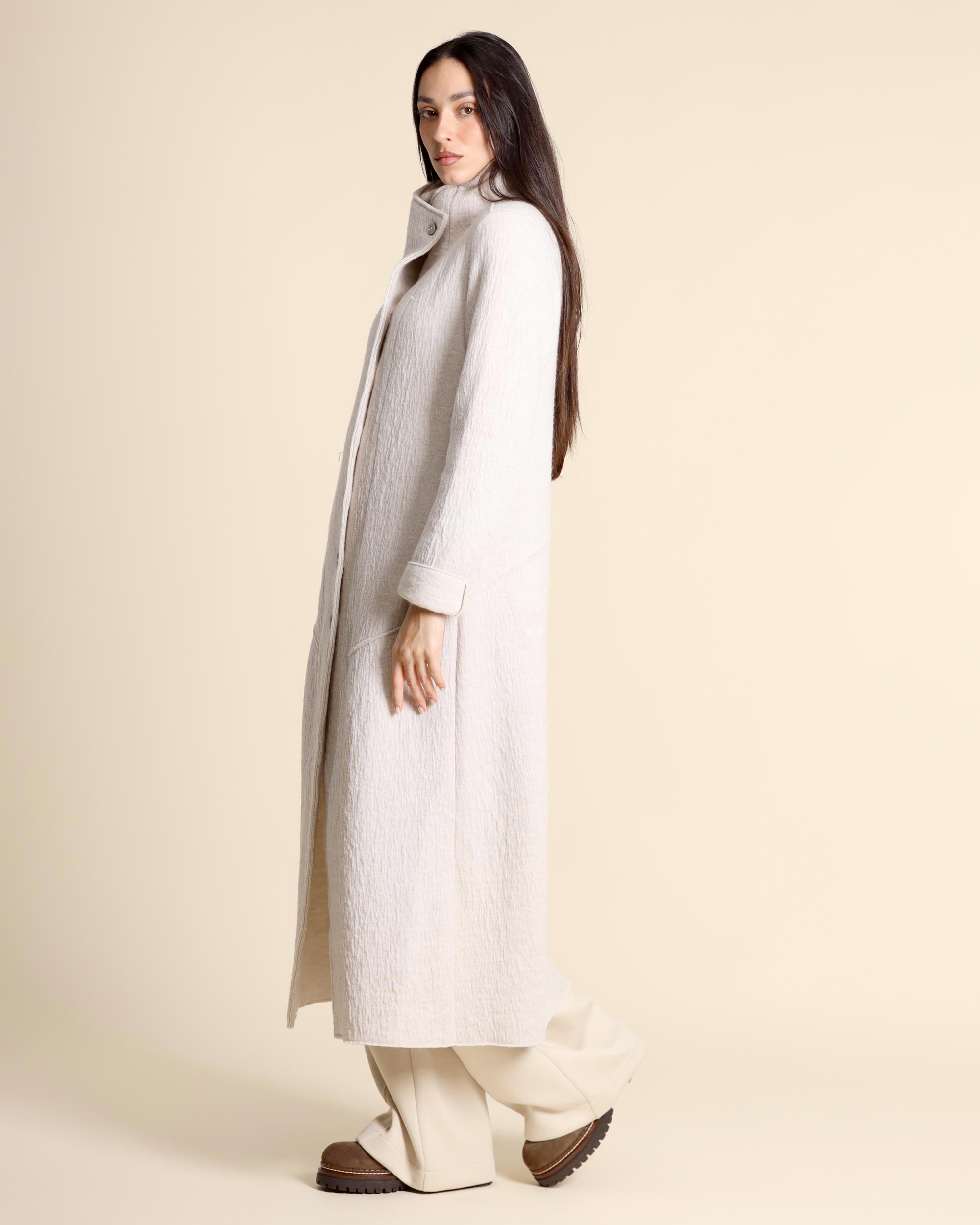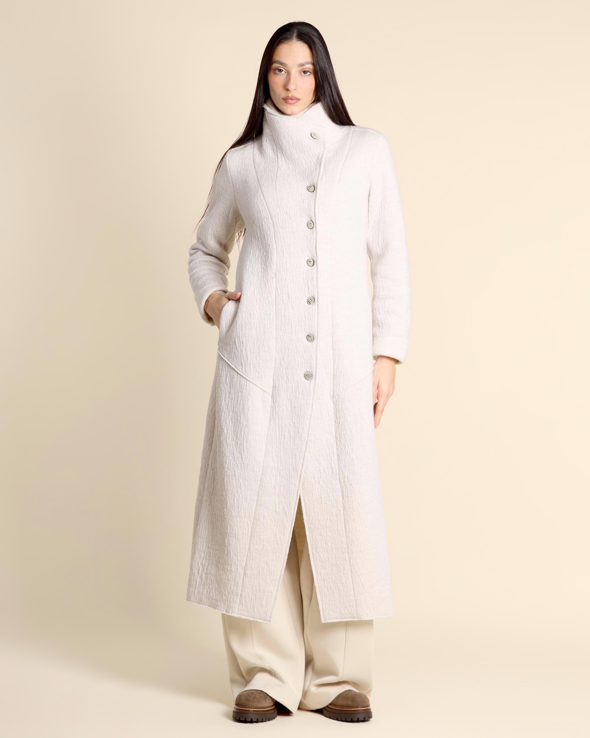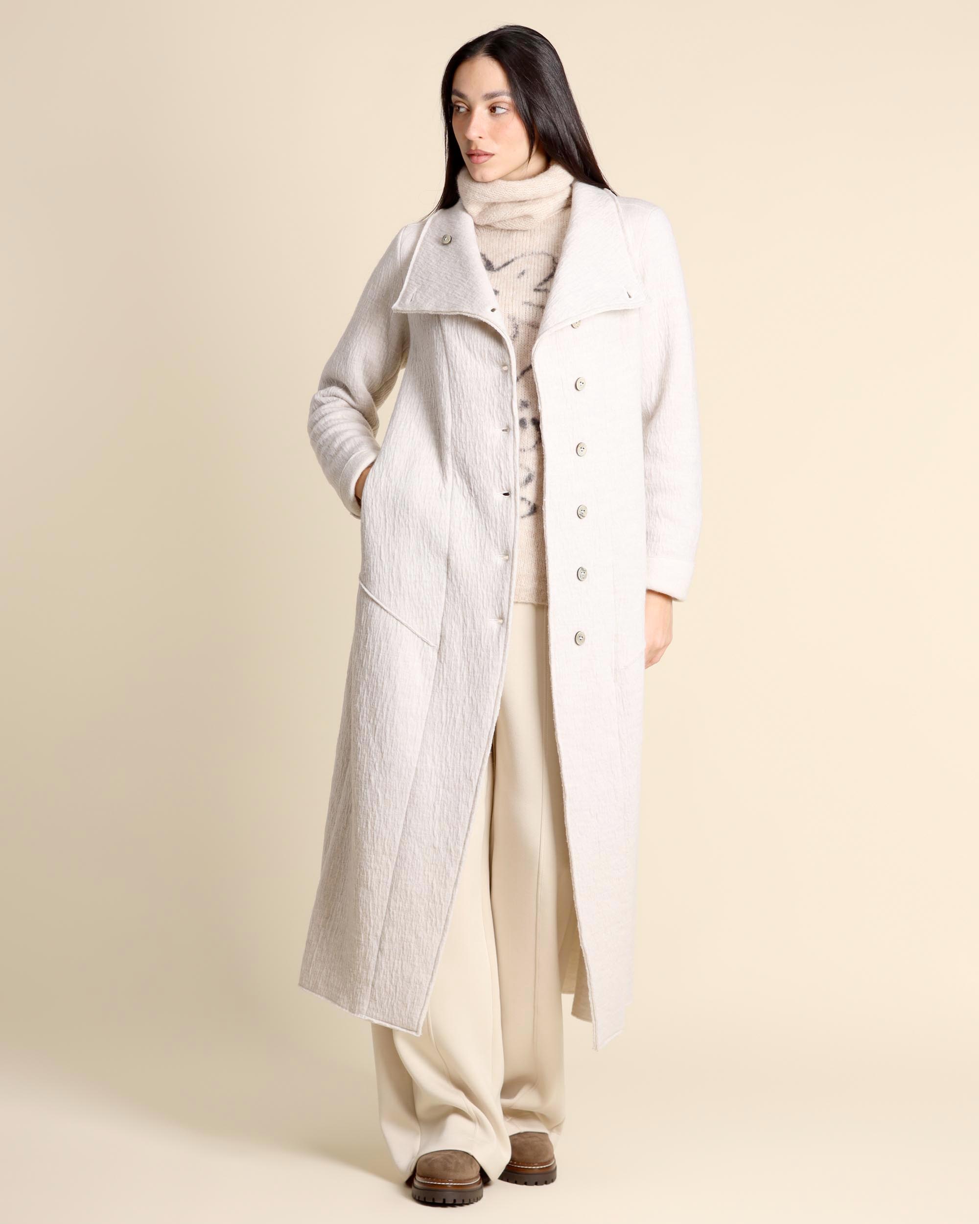 Cappotto lungo avorio slim fit in maglia di lana vergine effetto lana cotta, collo alto, chiusura con bottoni, linea semiaderente, maniche lunghe, tasche inserite sul fianco, rifiniture a taglio vivo, sfoderato, made in Italy, la modella indossa una tg.42, la modella ha le seguenti misure: altezza 178, seno 86,vita 65, fianchi 93, collezione donna Transit Autunno Inverno 2025/26
