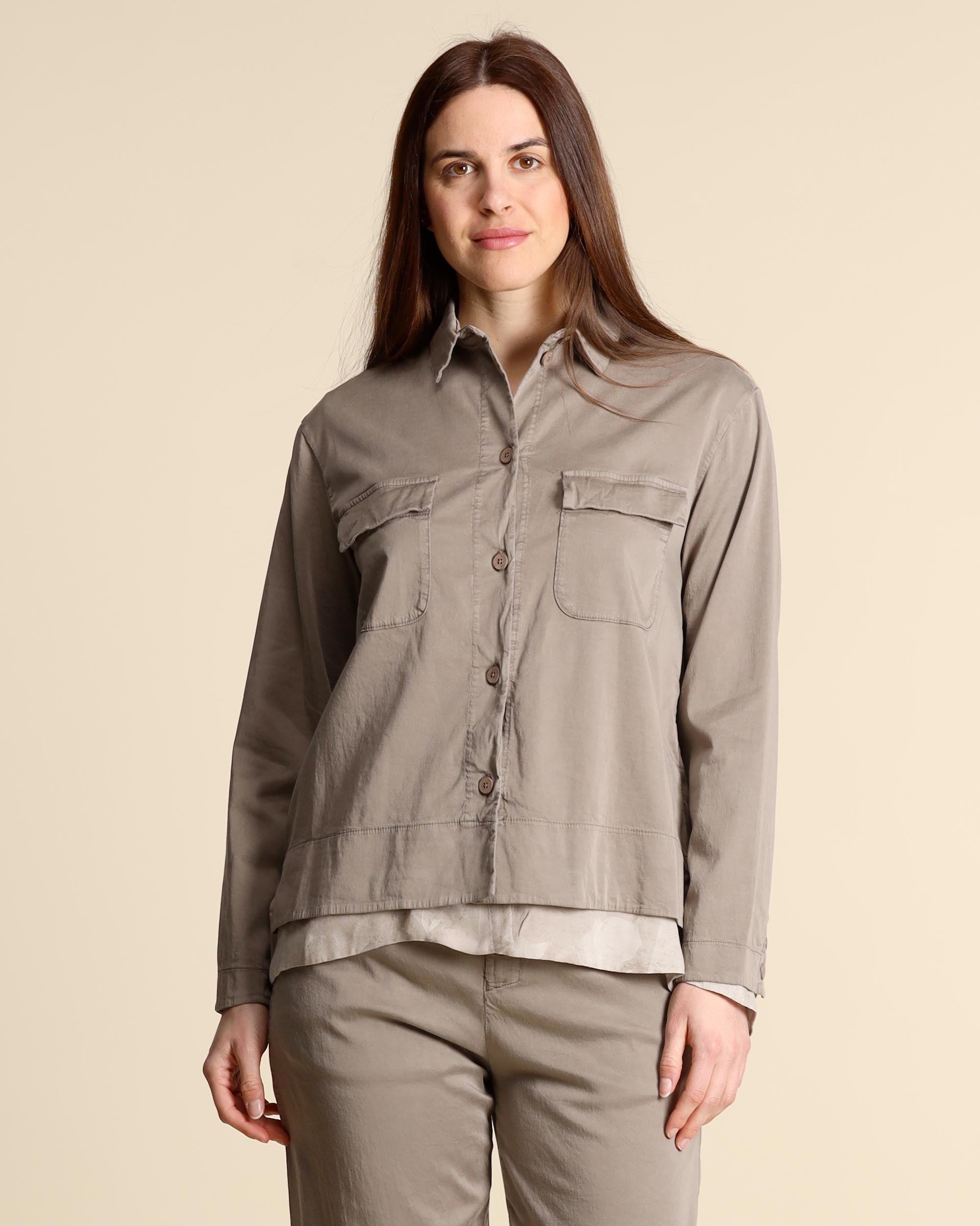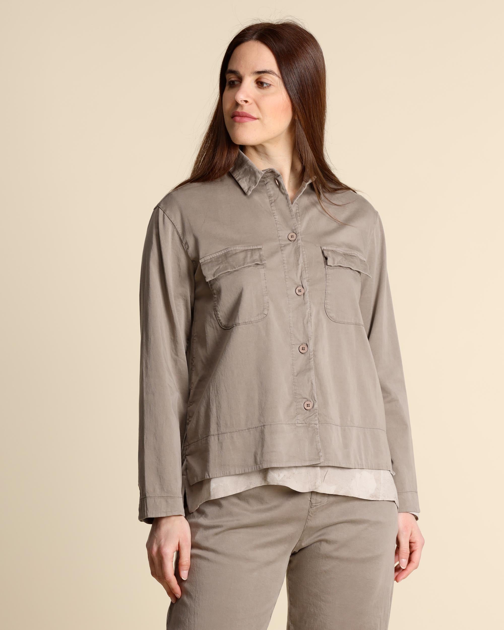 Giacca camicia color taupe in cotone e lyocell stretch, tinto capo, collo a camicia, maniche lunghe, chiusura con bottoni, tasche applicate, linea dritta, spacchi laterali, fondo più lungo dietro, made in Italy, la modella indossa una tg.42, la modella ha le seguenti misure: altezza 177, seno 86,vita 65, fianchi 93, collezione donna Transit Primavera Estate 2026