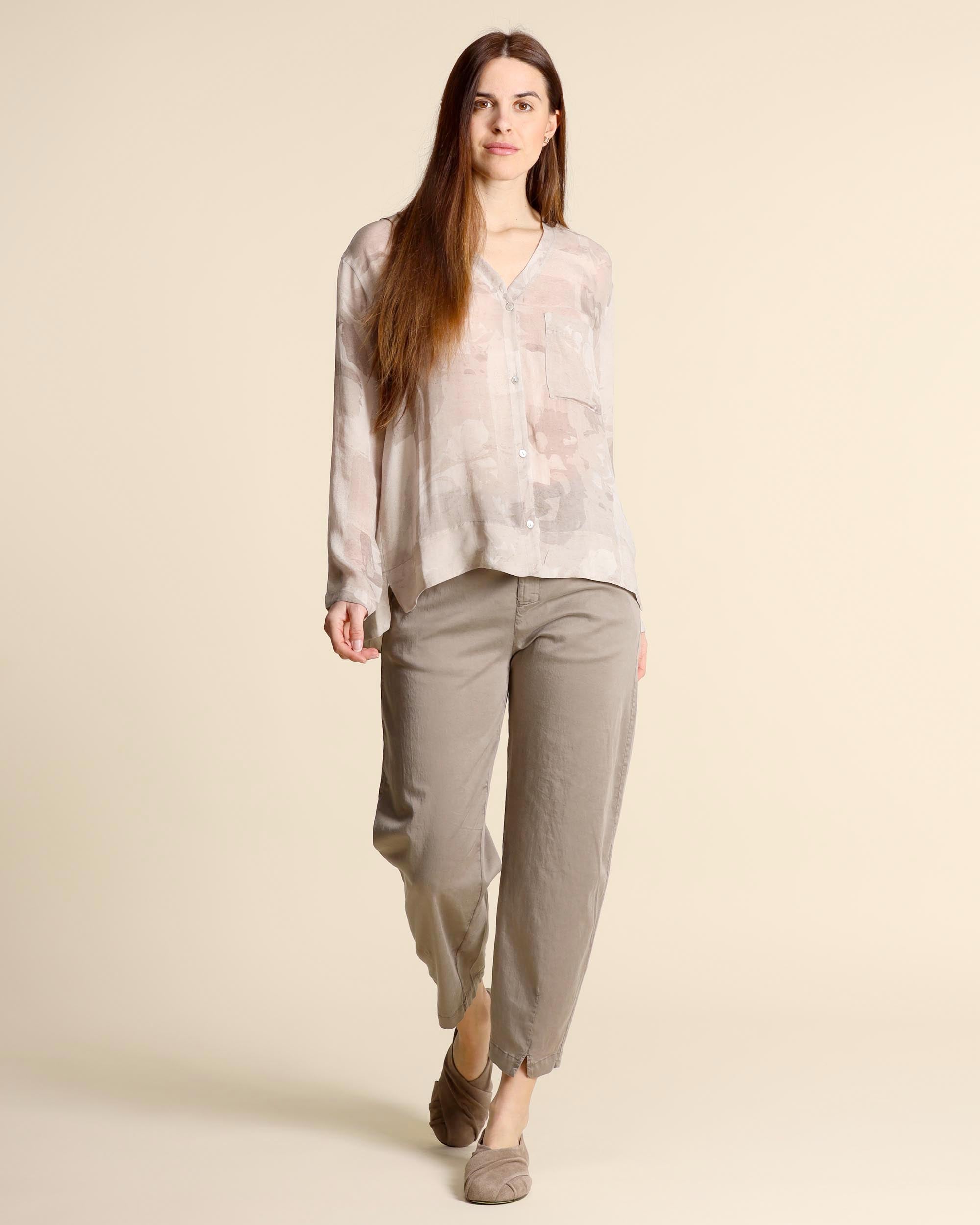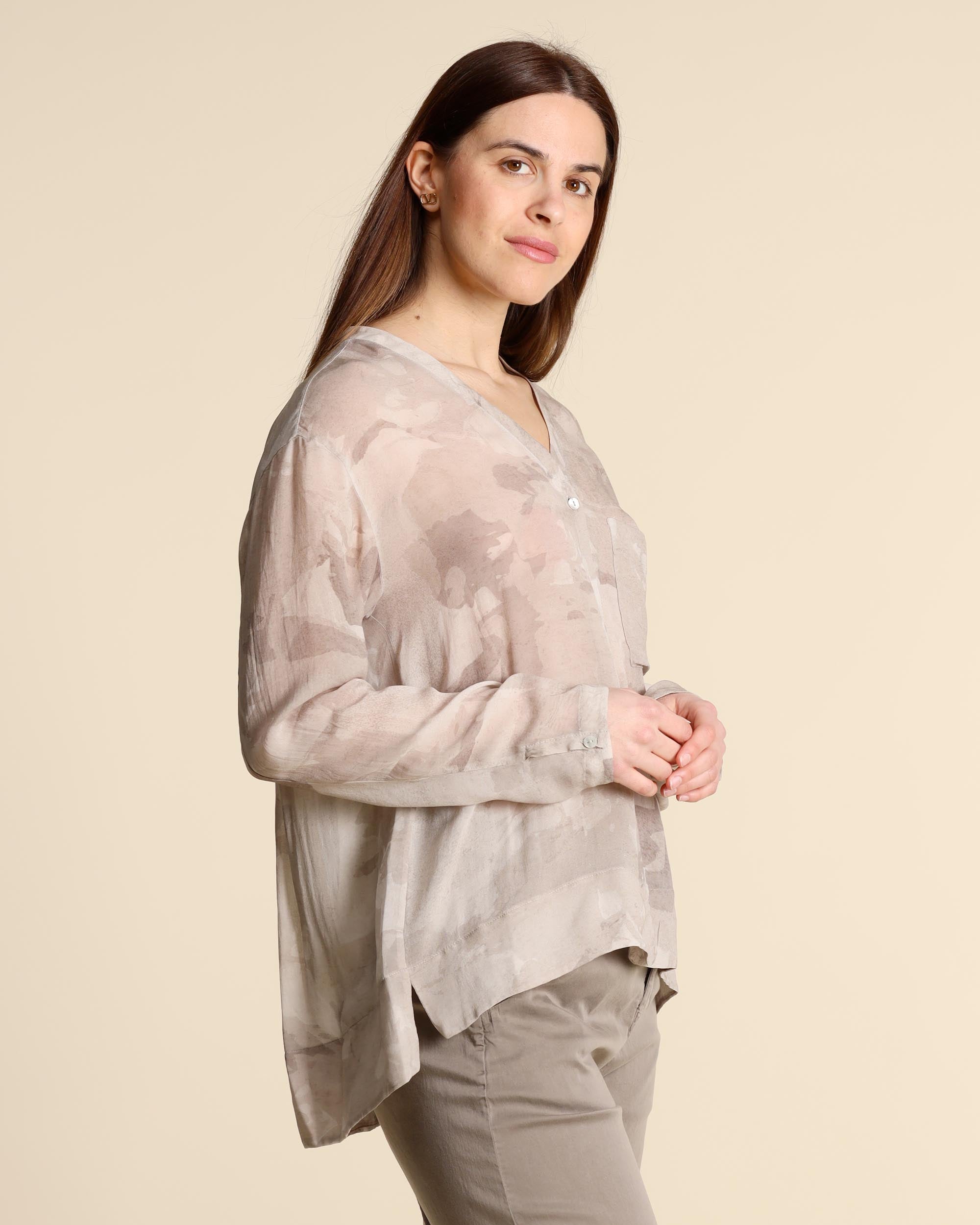 Camicia color sabbia in georgette di viscosa stampata, scollo a V, maniche lunghe, chiusura con bottoni, tasca applicata, linea ampia, spacchi laterali, made in Italy, la modella indossa una tg.42, la modella ha le seguenti misure: altezza 177, seno 86,vita 65, fianchi 93, collezione donna Transit Primavera Estate 2026