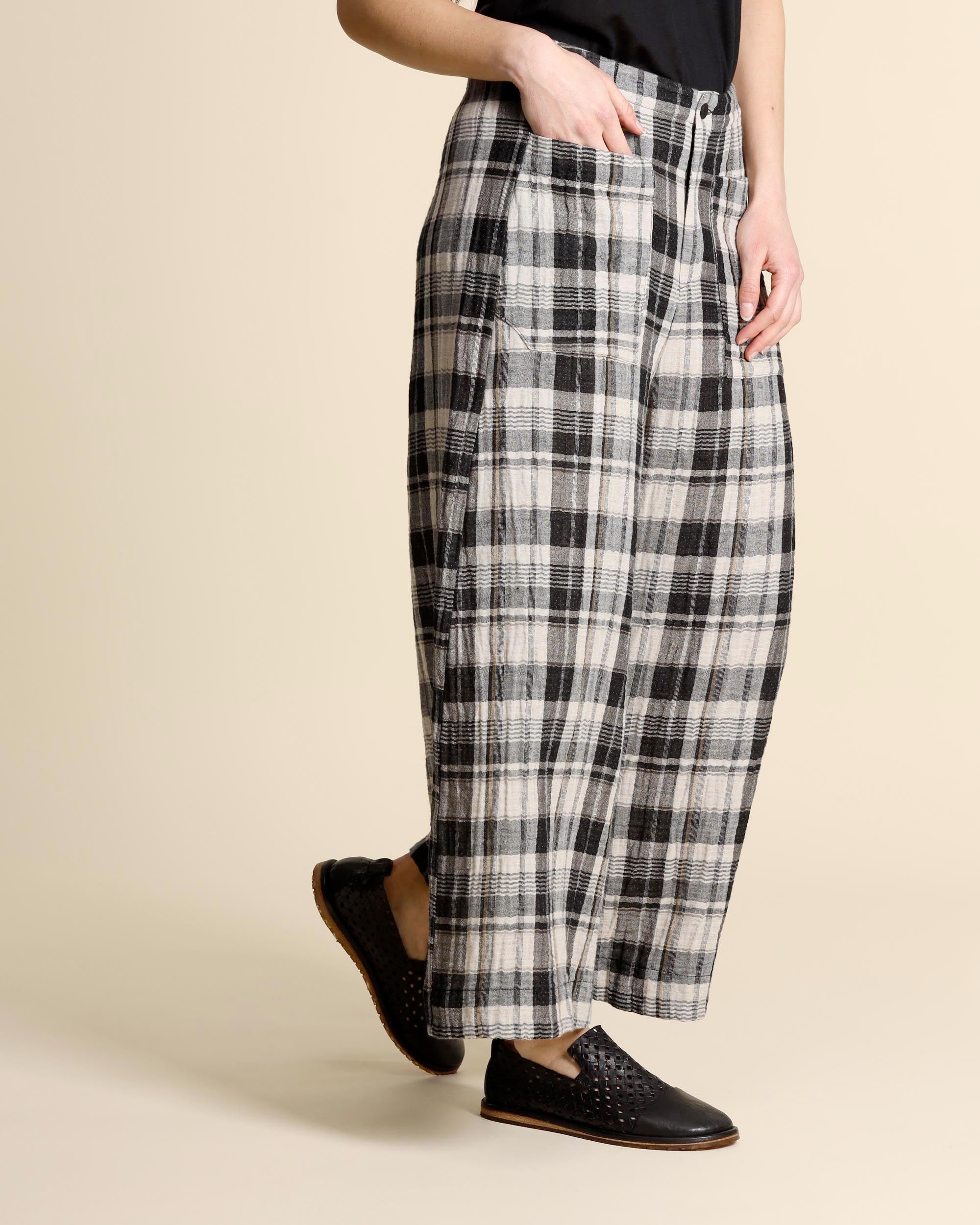 Pantaloni check neri e sabbia in cotone e lino, chiusura con bottone e zip nascosta, tasche applicate, linea ampia, made in Italy, la modella indossa una tg.42, la modella ha le seguenti misure: altezza 177, seno 86,vita 65, fianchi 93, collezione donna Transit Primavera Estate 2026