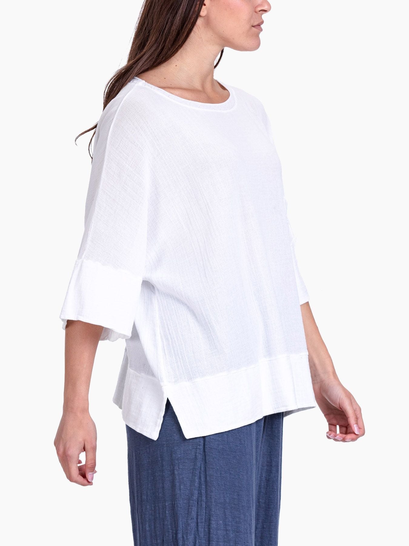 T shirt in cotone garzato bianco, scollo tondo, maniche corte, spacchi laterali, linea ampia, made in Italy, Veronica indossa una tg.42, Veronica ha le seguenti misure: altezza 177, seno 87,vita 65, fianchi 93, collezione donna Transit Primavera Estate 2020