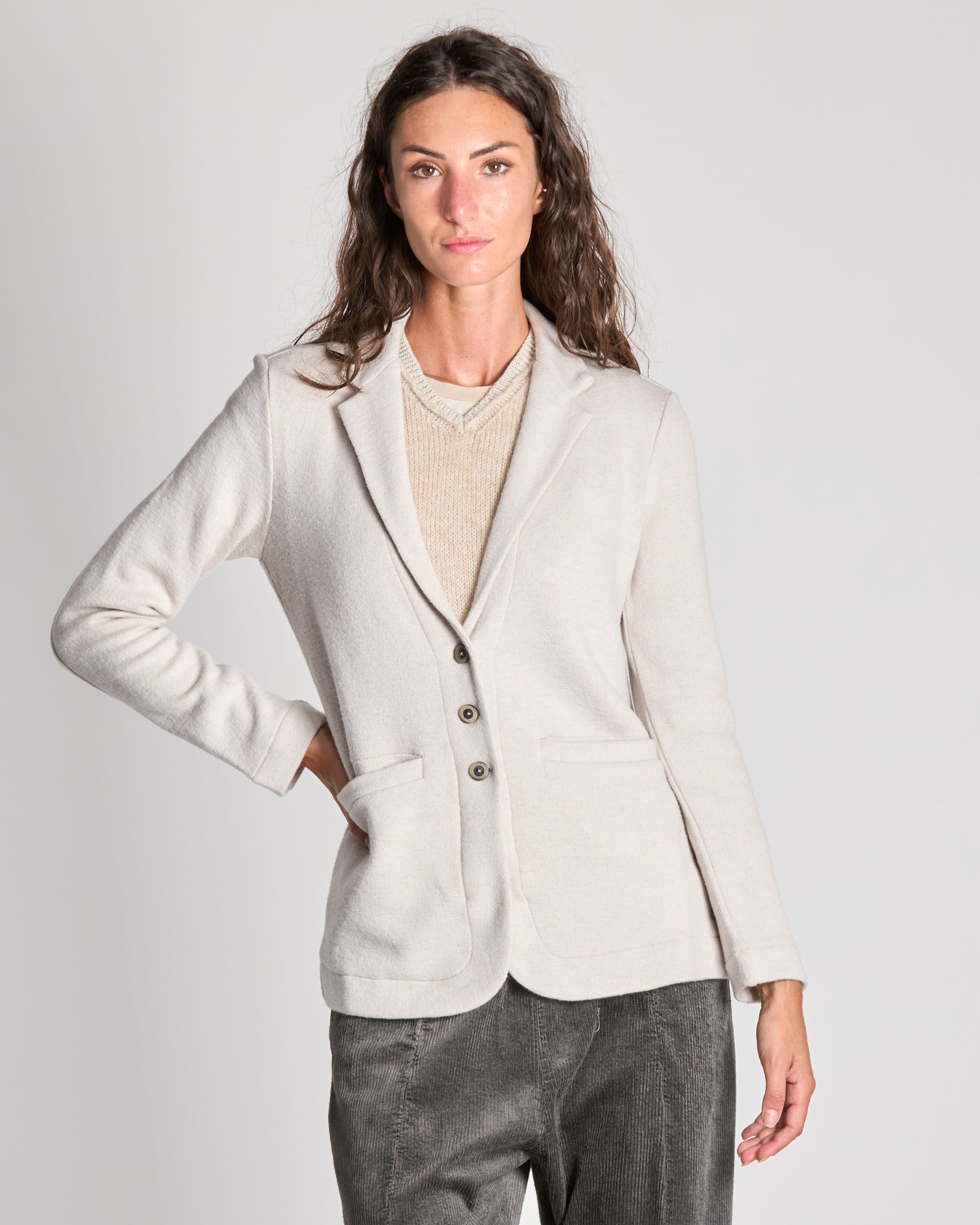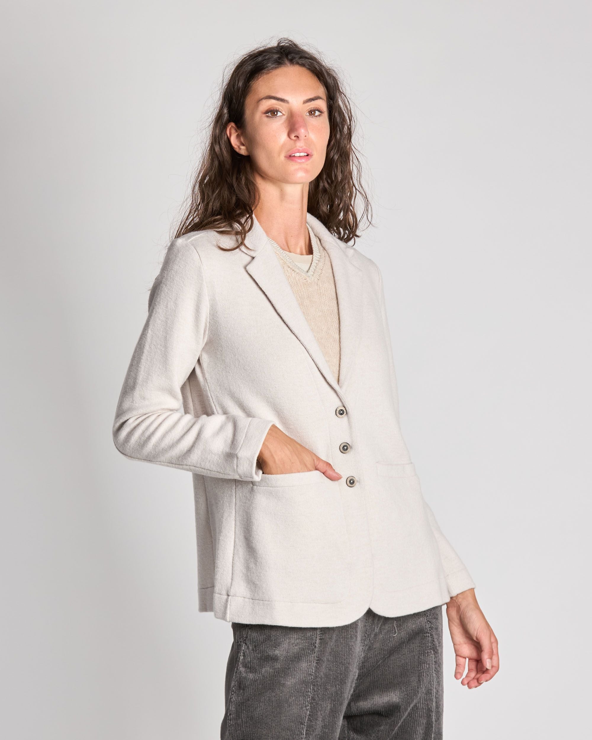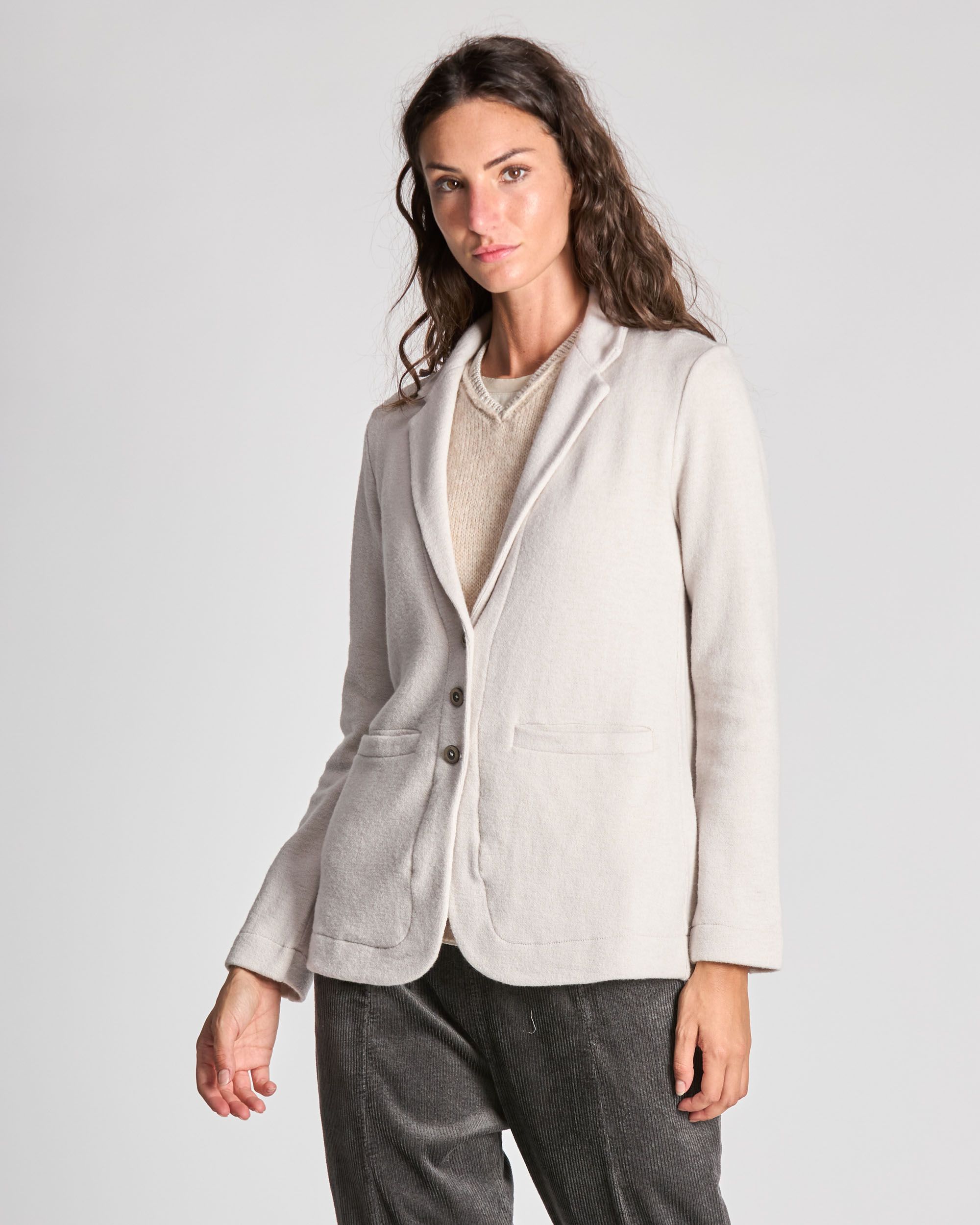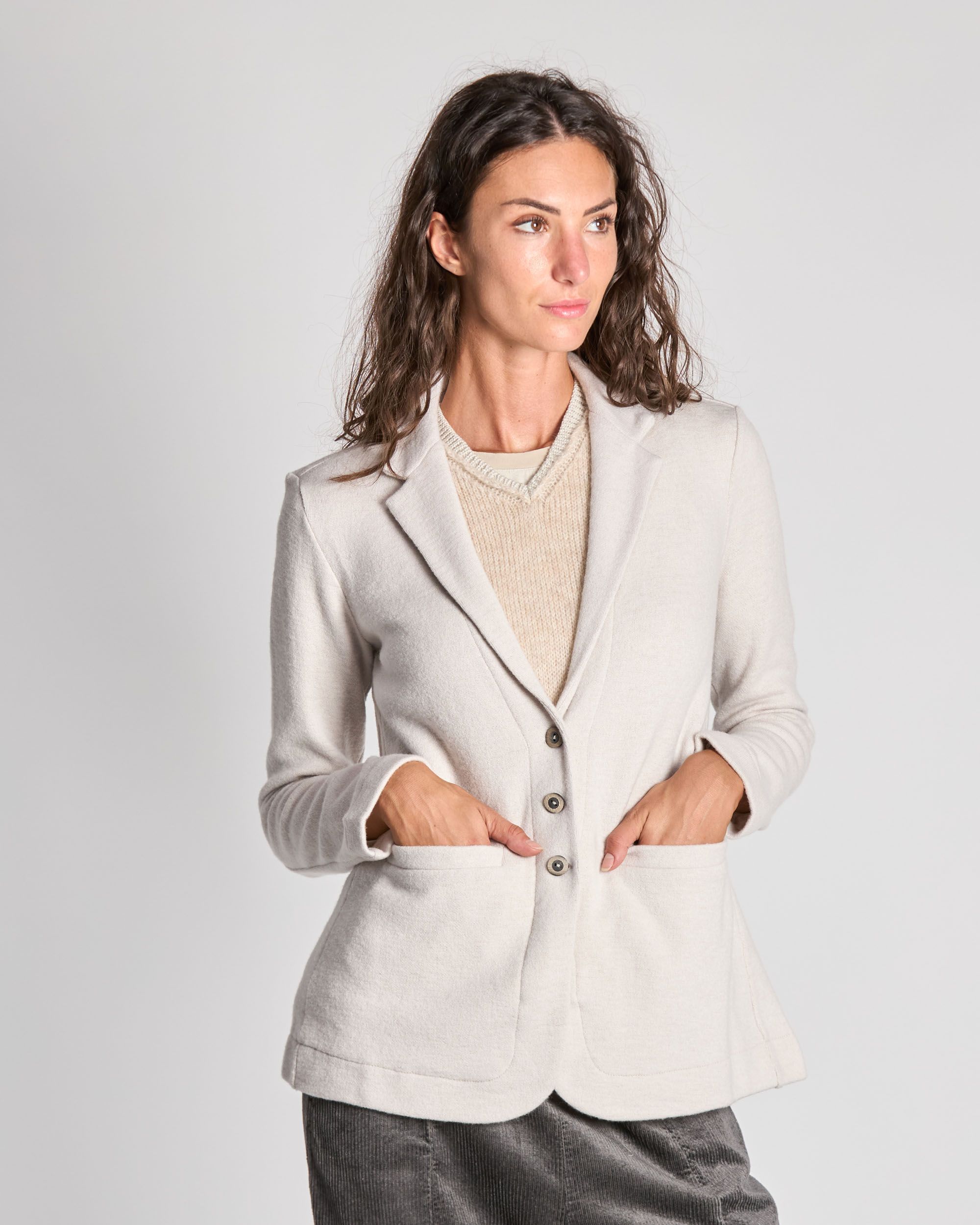 Giacca in maglia color ghiacco di lana e viscosa, collo a rever, maniche lunghe, chiusura con bottoni, tasche a filetto, sfoderata, linea dritta, made in Italy, Elisa indossa una tg.42, Elisa ha le seguenti misure: altezza 179, seno 84, vita 63, fianchi 94, collezione donna Transit Autunno Inverno 2024/25