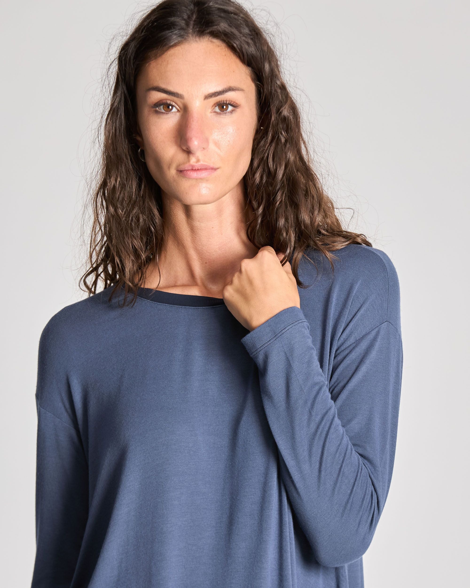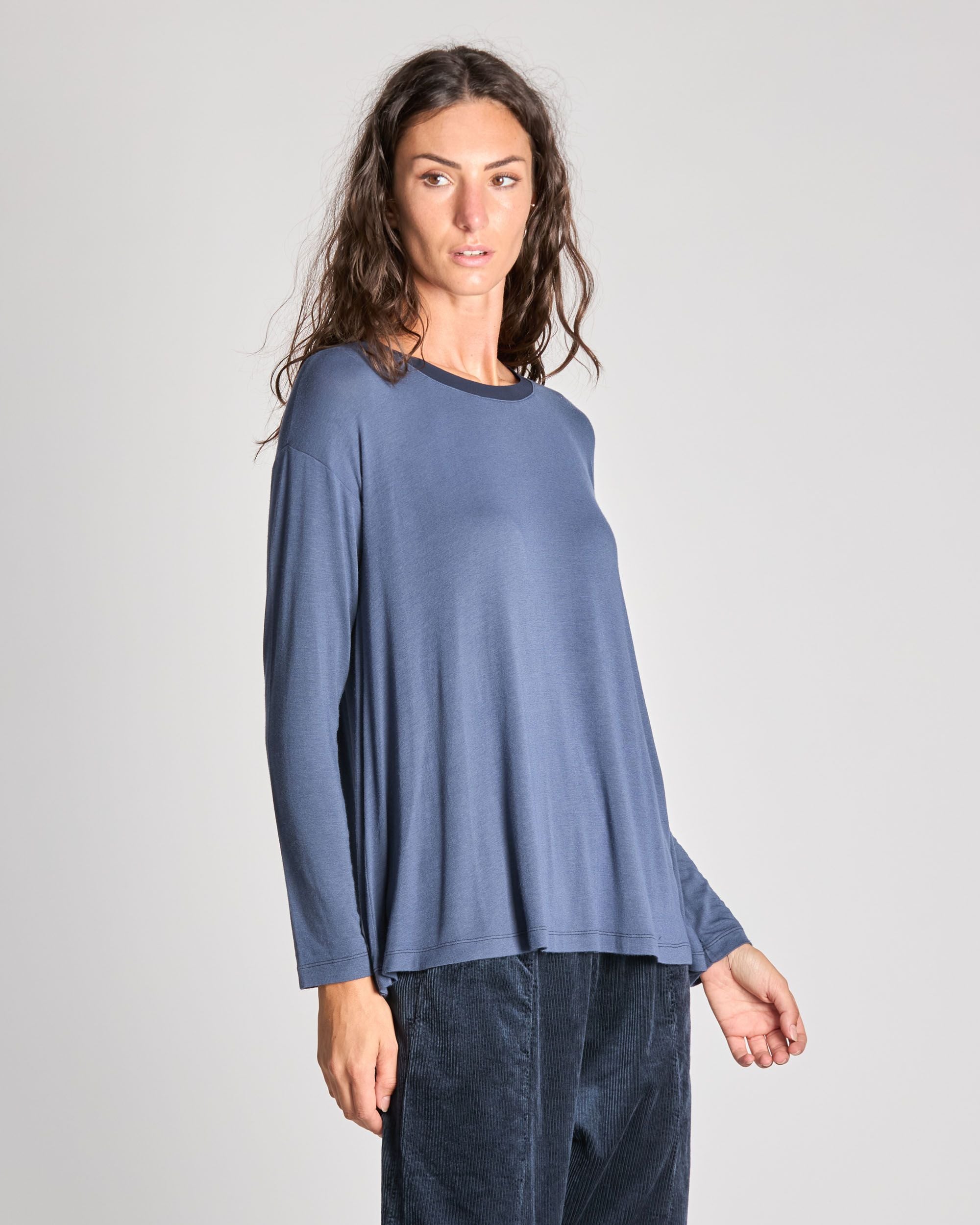T shirt blu navy in jersey di modal stretch, tinta in capo, scollo tondo con profilo in georgette di viscosa, maniche lunghe, giro sceso, linea morbida leggermente svasata al fondo, made in Italy, Elisa indossa una tg.42, Elisa ha le seguenti misure: altezza 179, seno 84, vita 63, fianchi 94, collezione donna Transit Autunno Inverno 2024/25