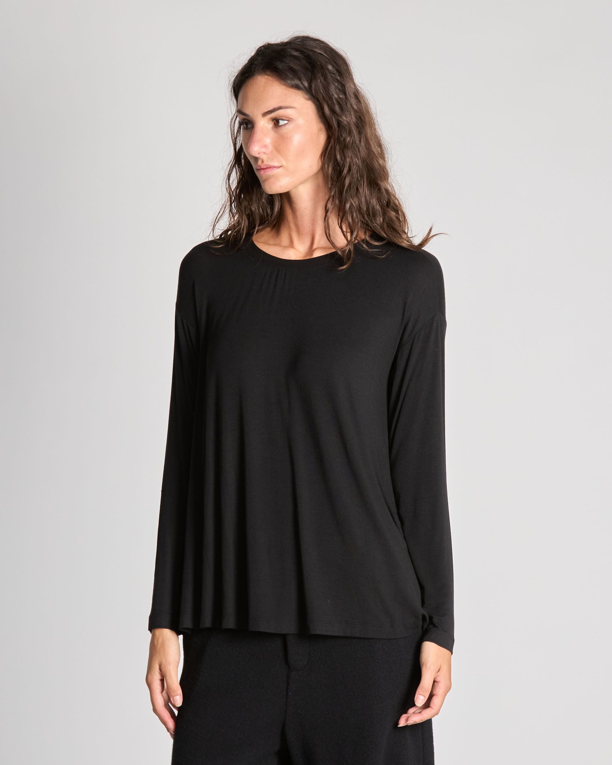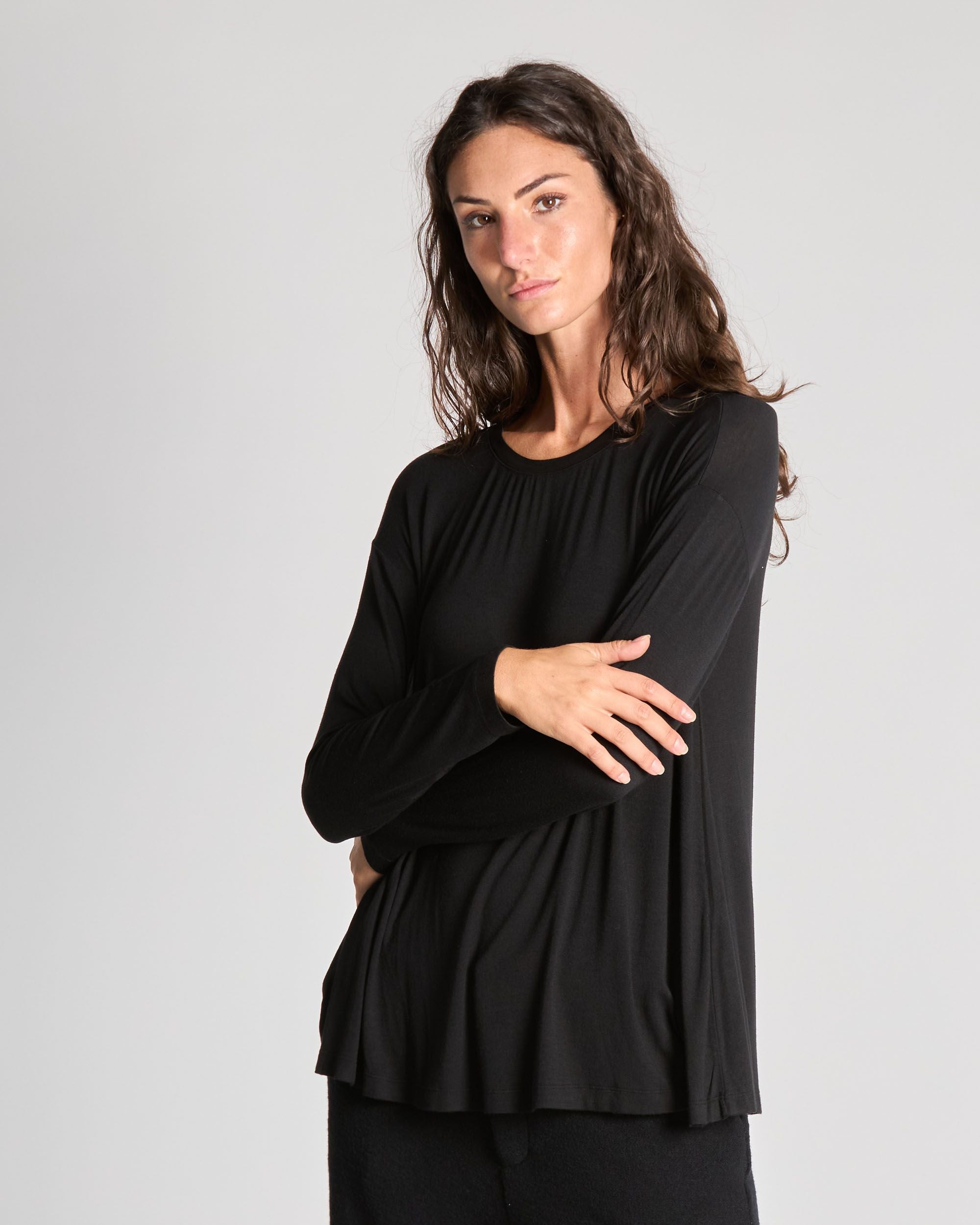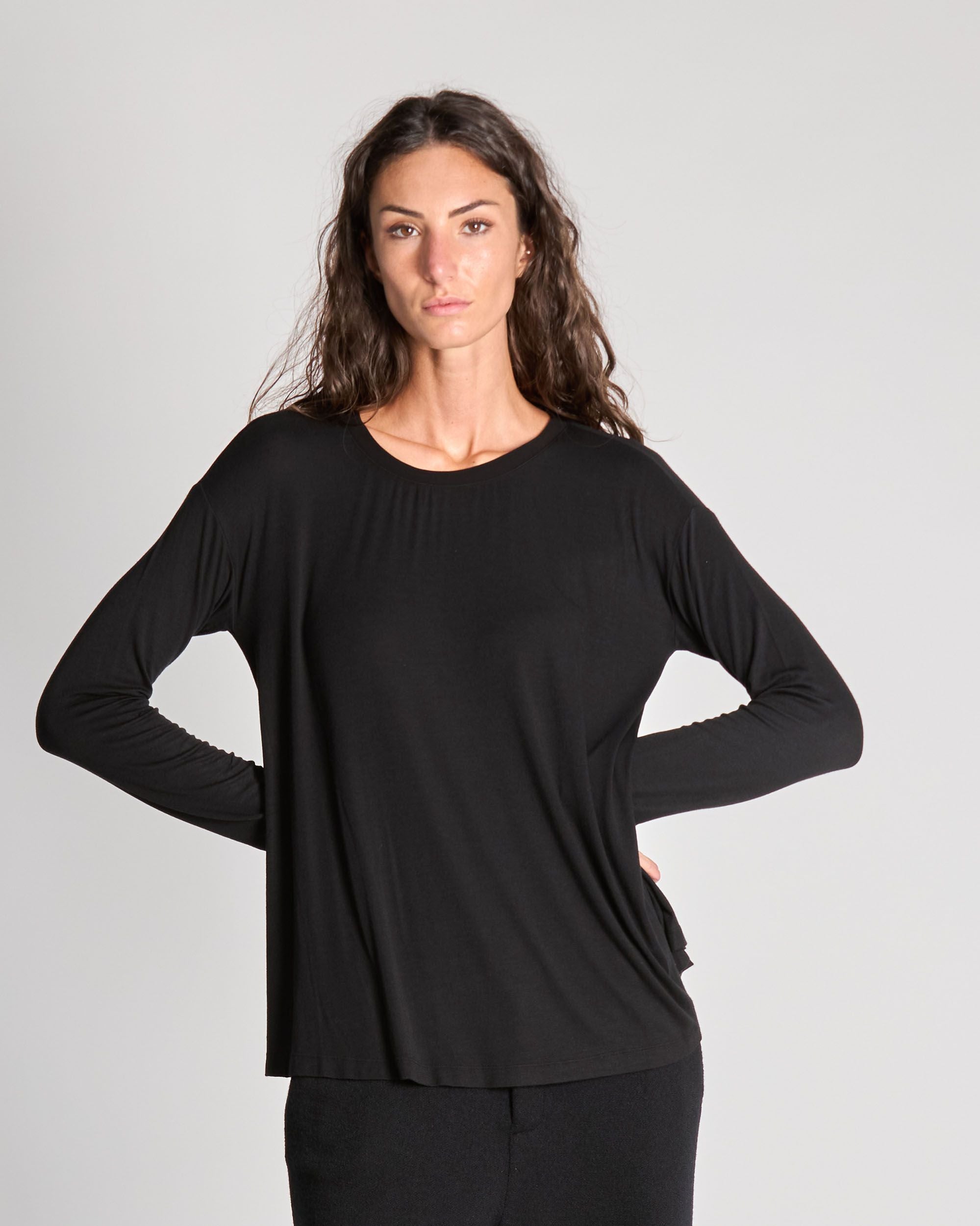 T shirt nera in jersey di modal stretch, tinta in capo, scollo tondo con profilo in georgette di viscosa, maniche lunghe, giro sceso, linea morbida leggermente svasata al fondo, made in Italy, Elisa indossa una tg.42, Elisa ha le seguenti misure: altezza 179, seno 84, vita 63, fianchi 94, collezione donna Transit Autunno Inverno 2024/25