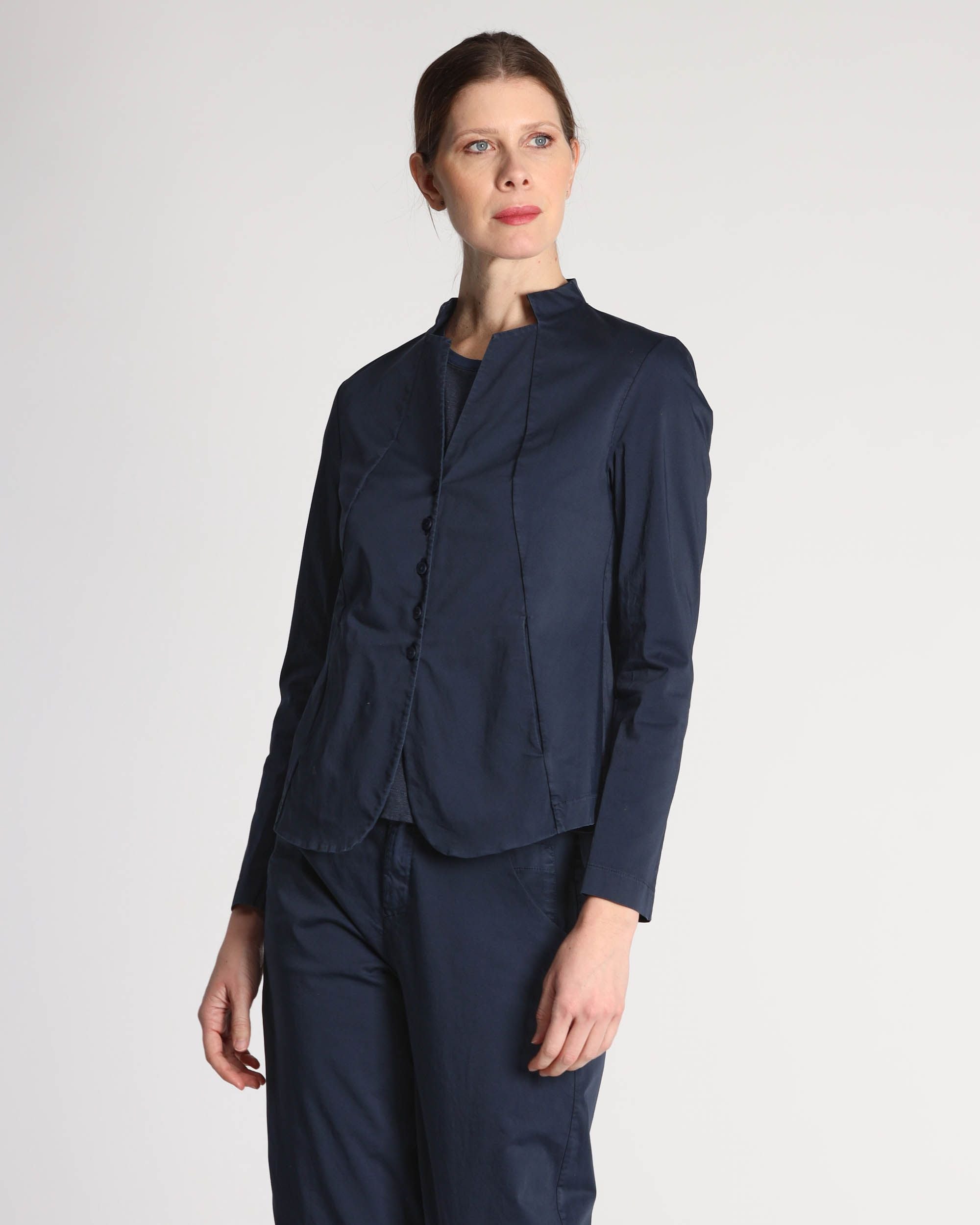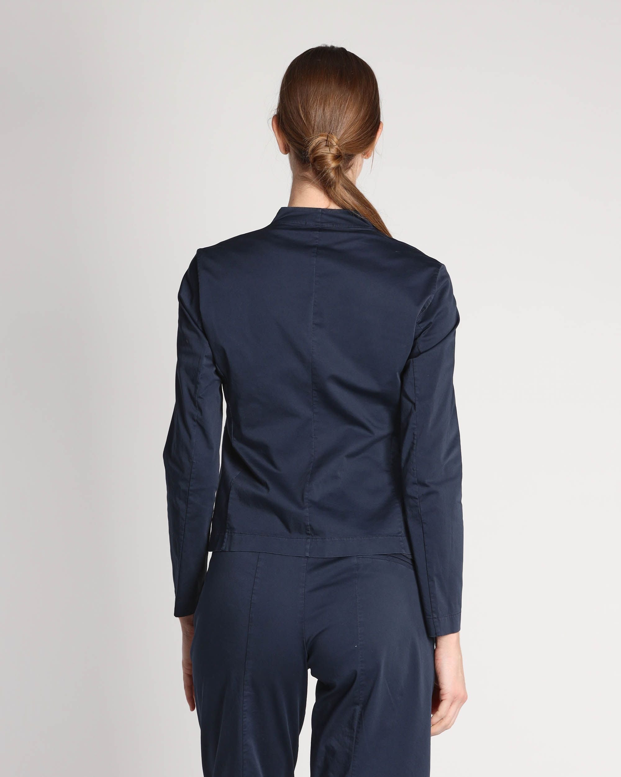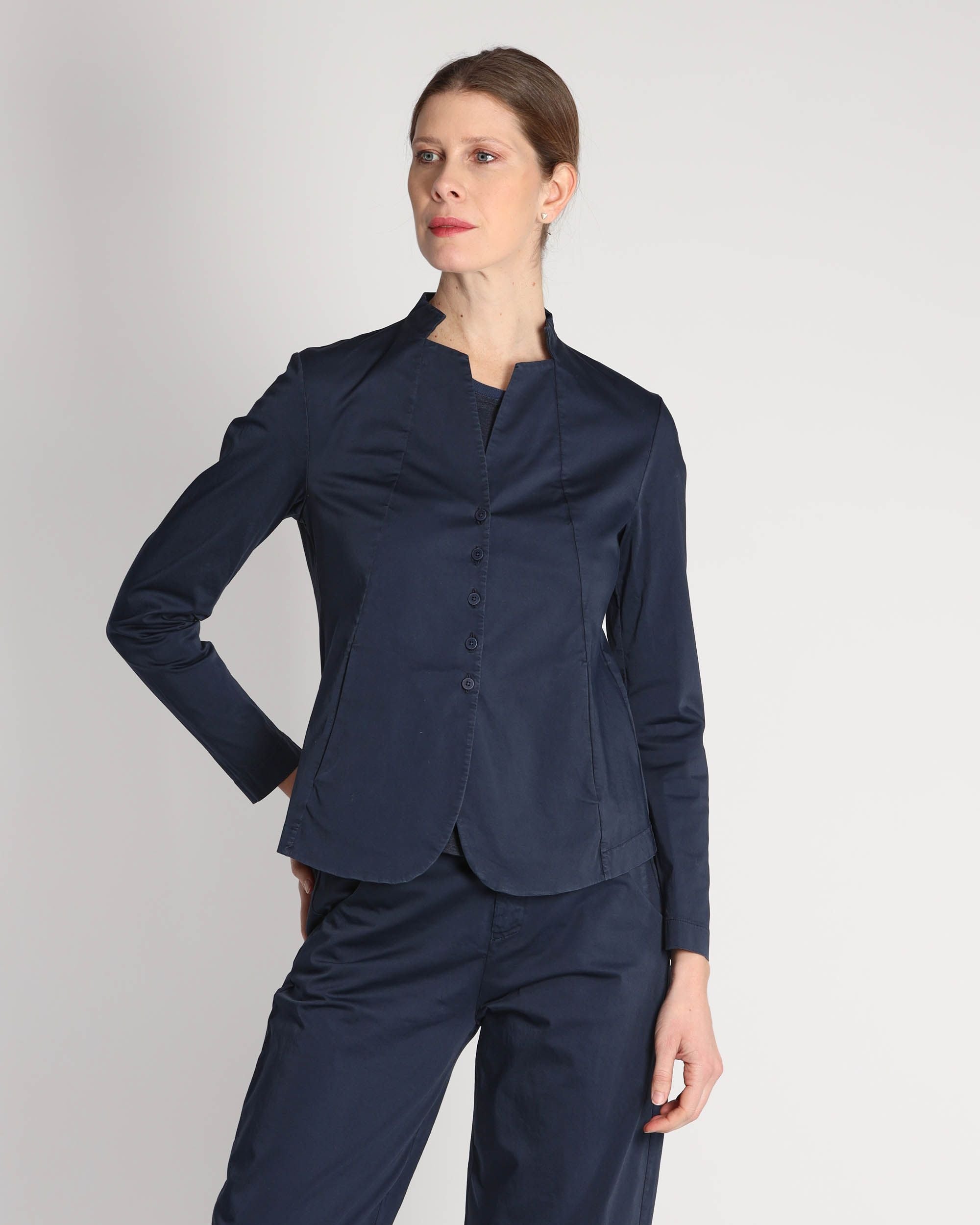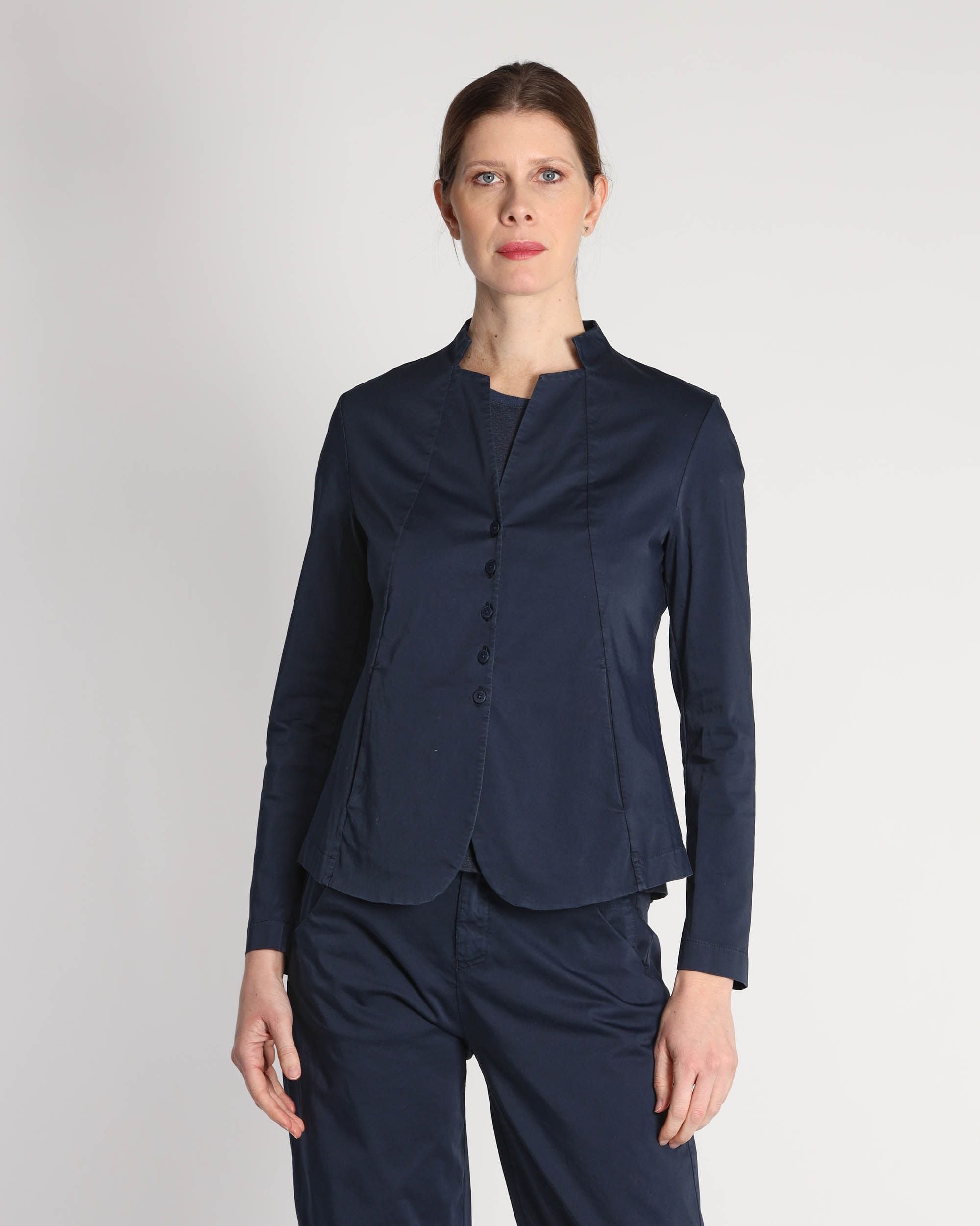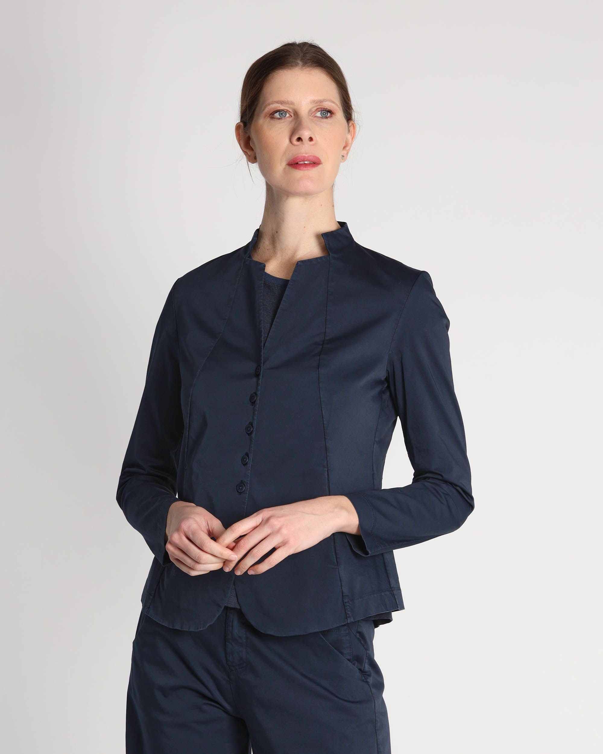 Giacca blu in cotone stretch, tinto in capo, collo alla coreana, maniche lunghe, chiusura con piccoli bottoni, slim fit, tasche a filetto, sfoderata, made in Italy, la modella indossa una tg.42, la modella ha le seguenti misure: altezza 178, seno 86,vita 65, fianchi 93, collezione donna Transit Primavera Estate 2025