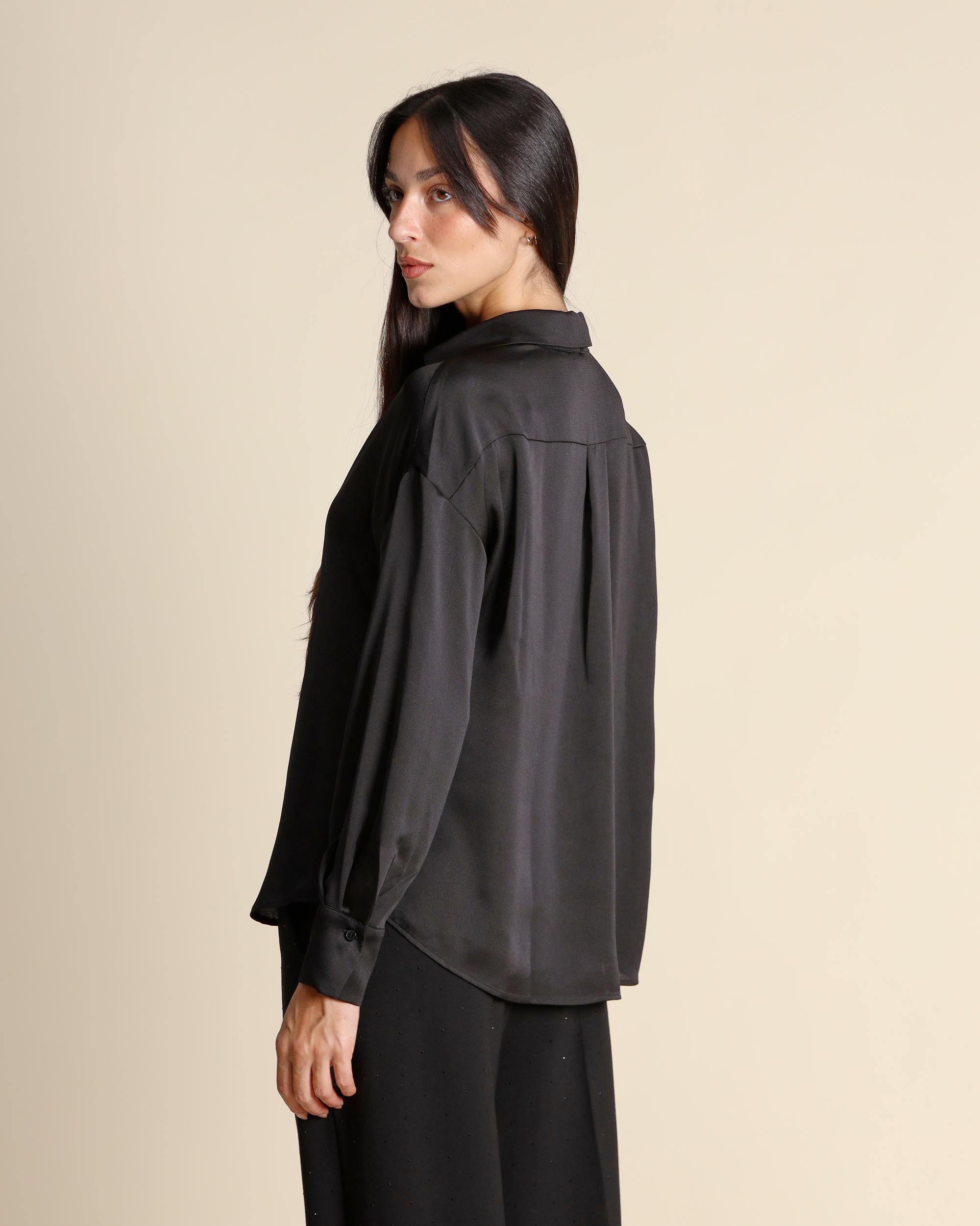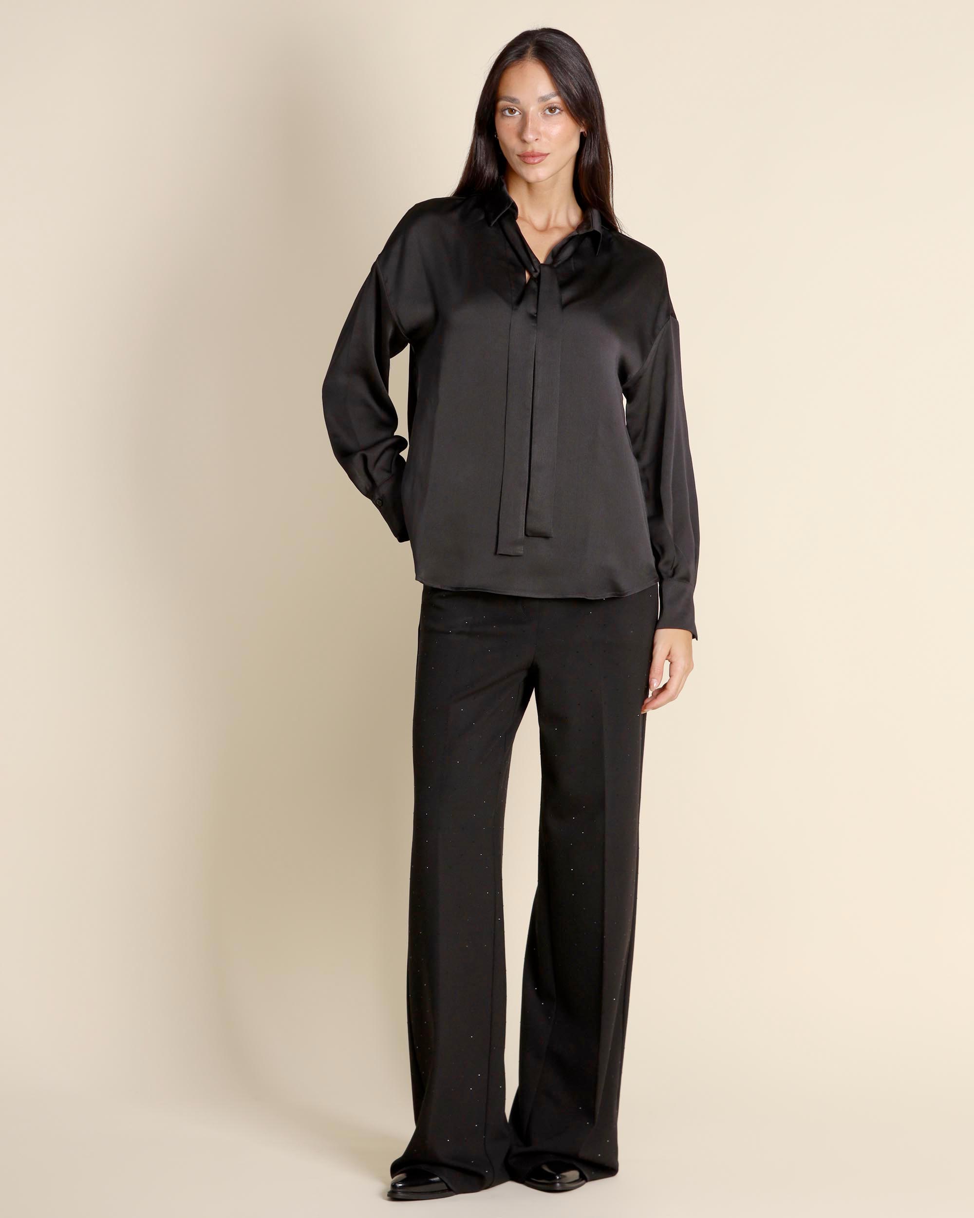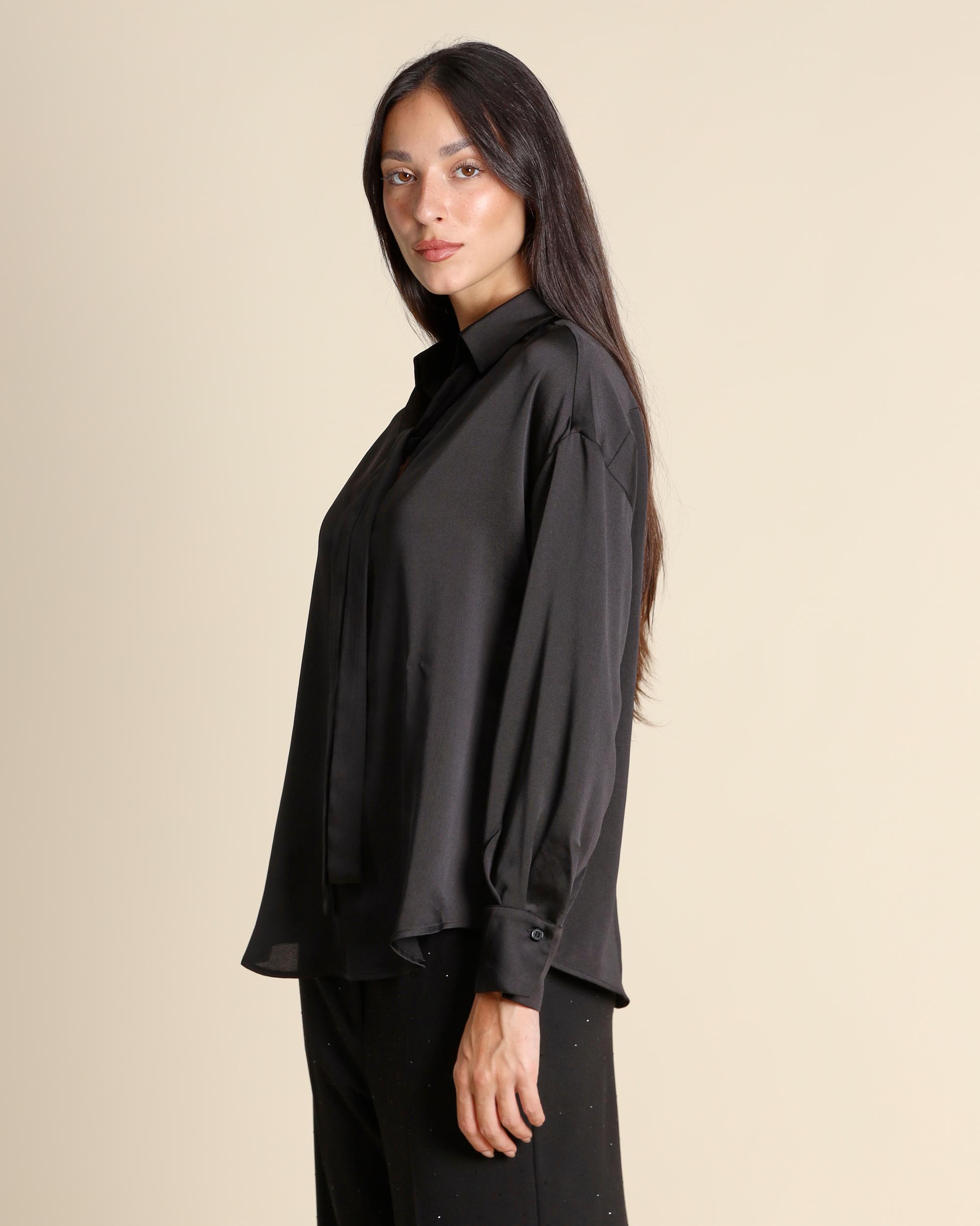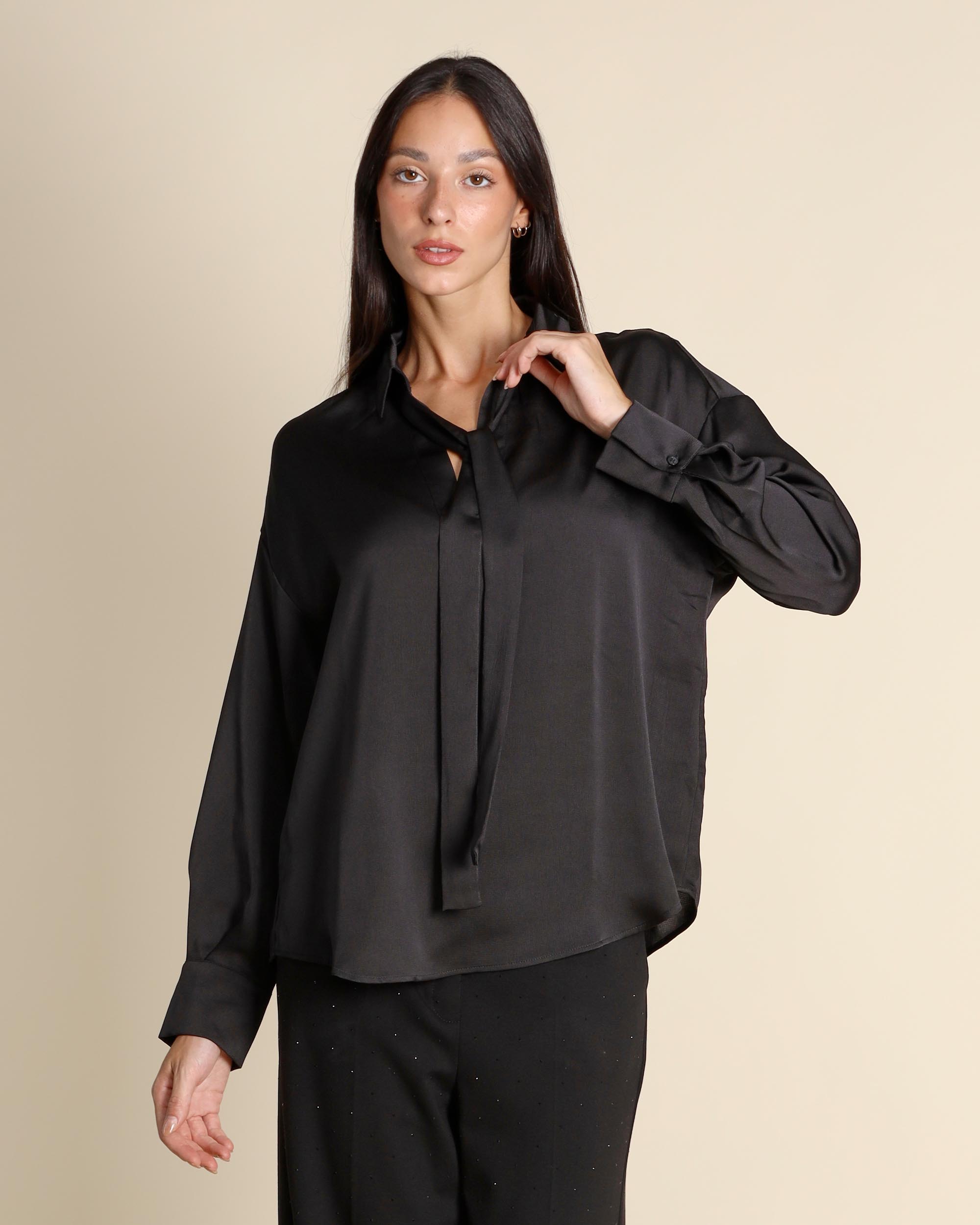 Camicia nera in raso, maniche lunghe con polsino, giro sceso, collo a polo, linea morbida, sciarpina removibile da annodare, la modella indossa una tg.42, la modella ha le seguenti misure: altezza 173, seno 86,vita 65, fianchi 93, collezione donna Emme by Marella Autunno Inverno 2025/26