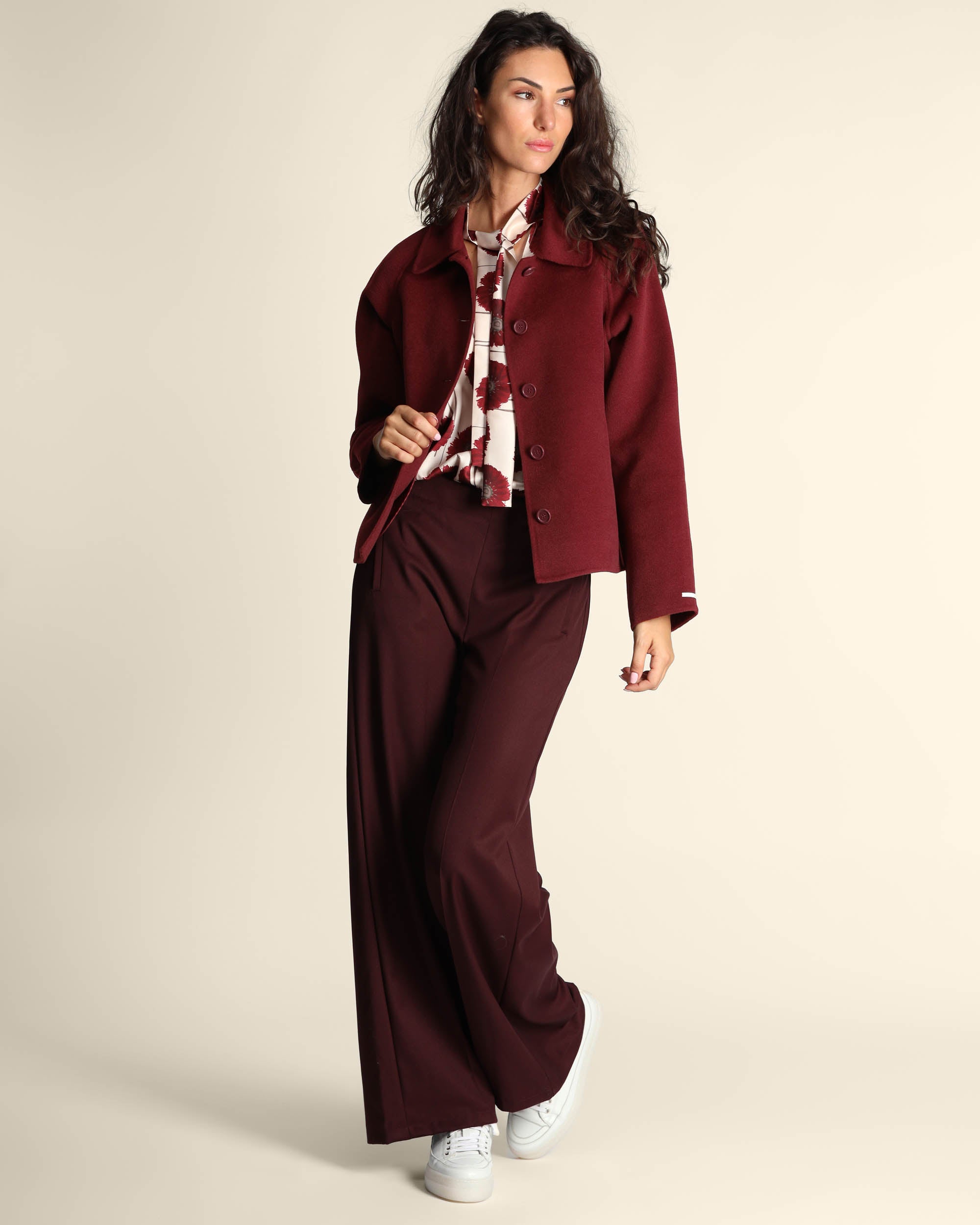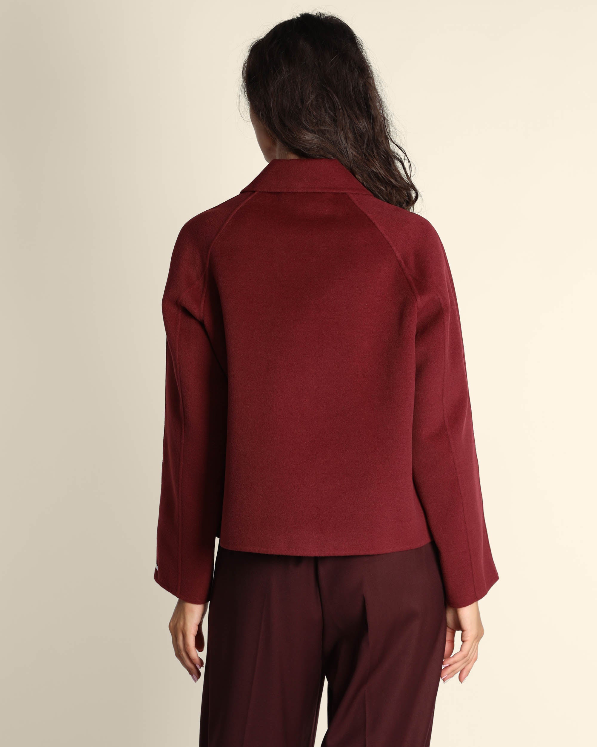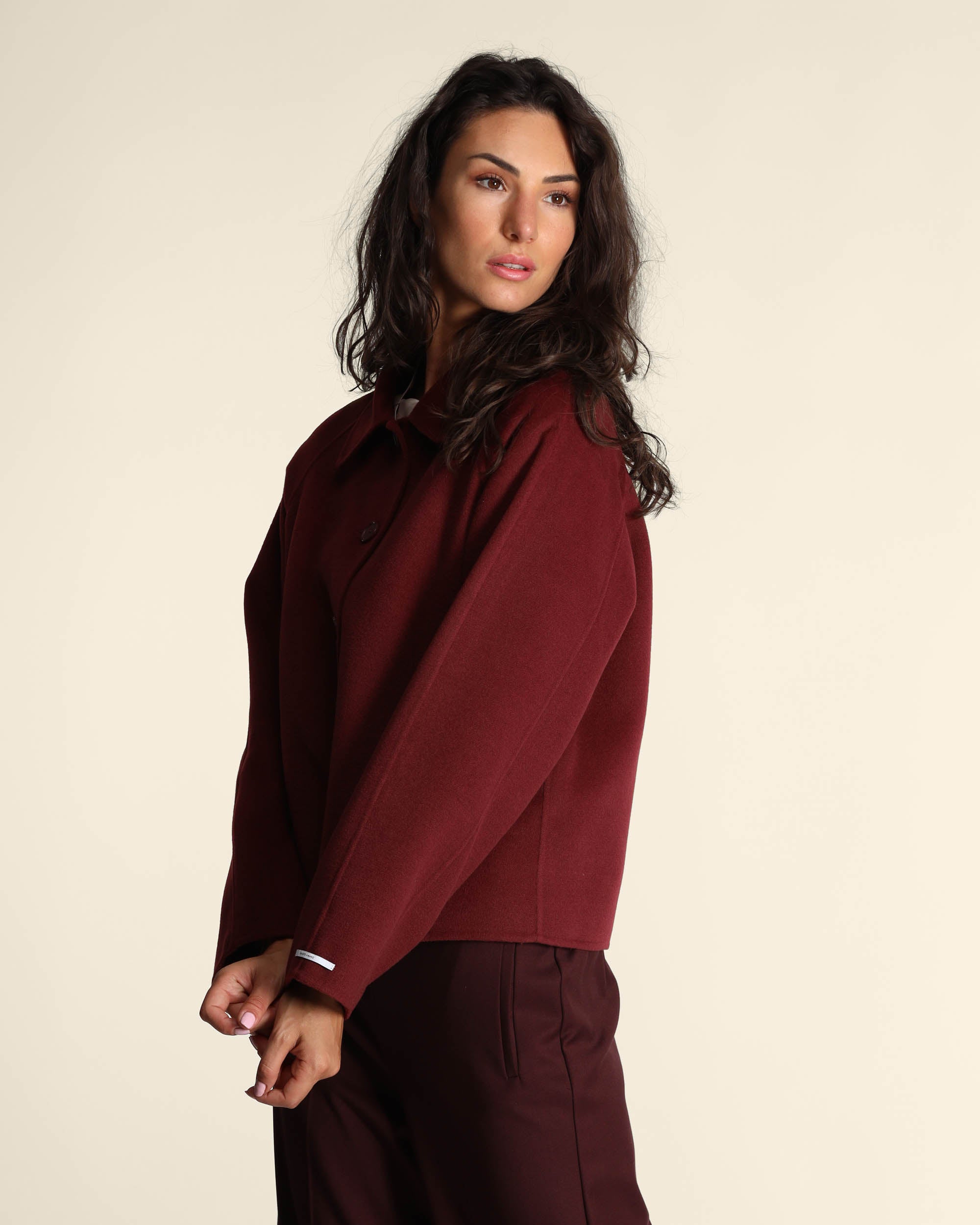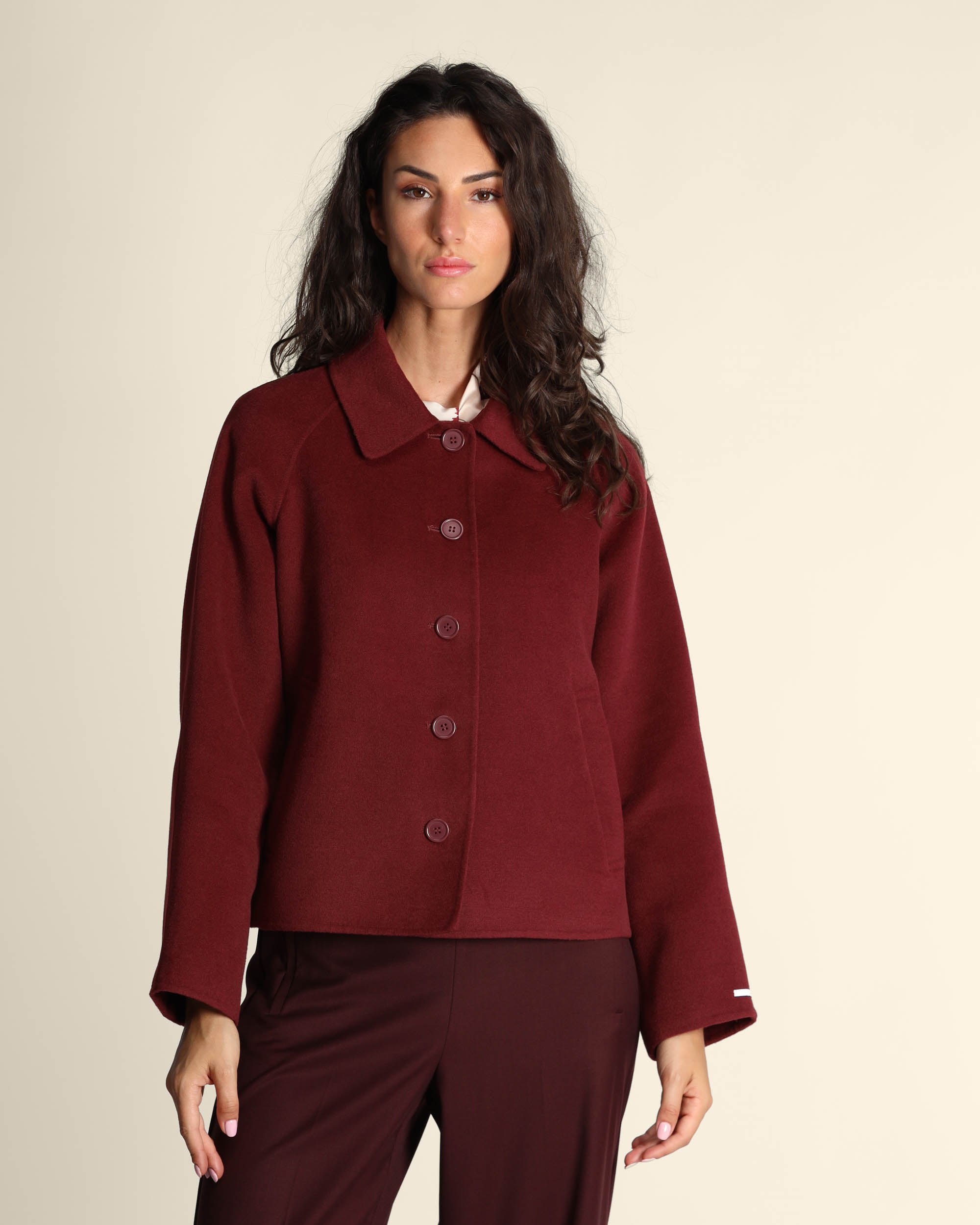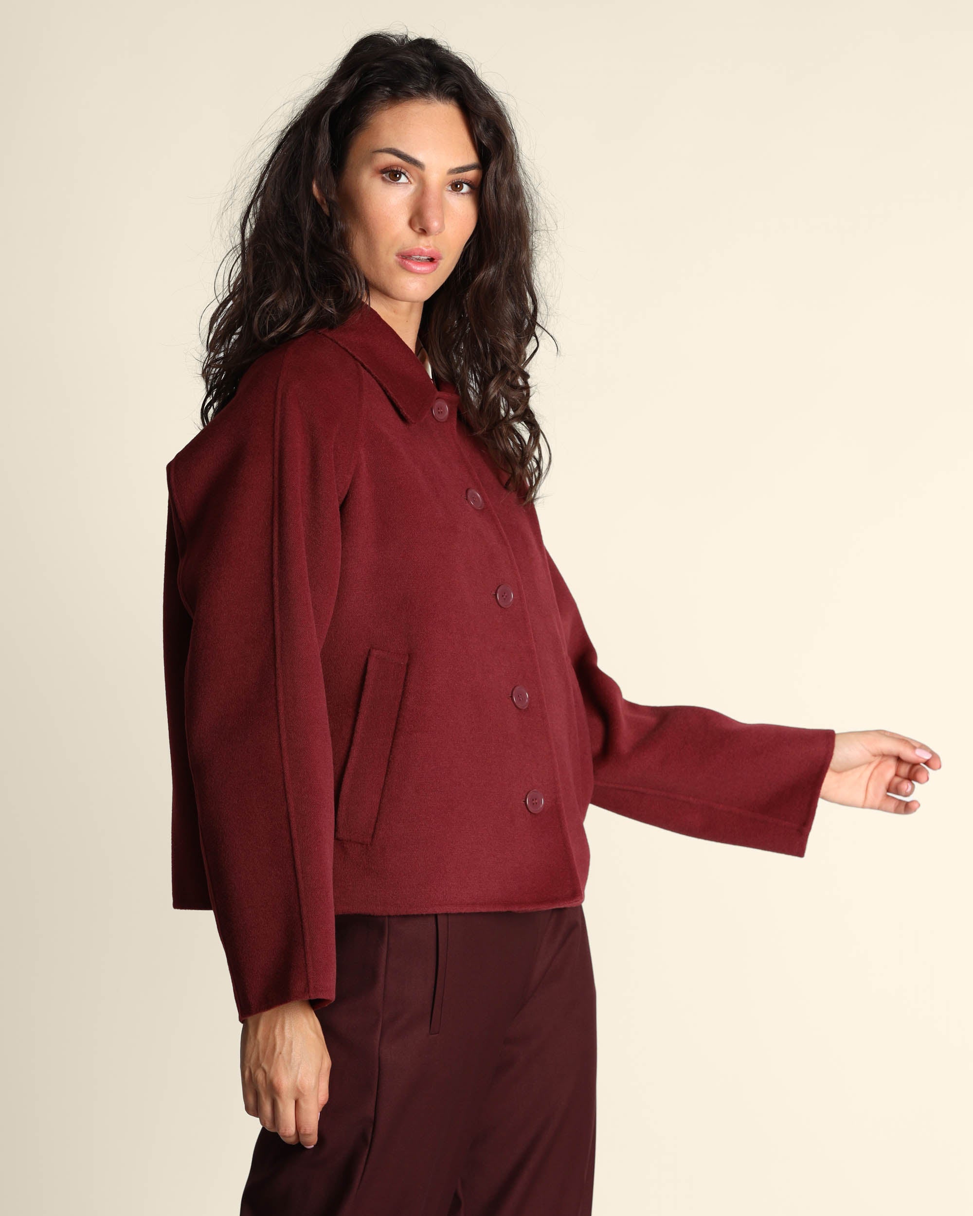 Giaccone in panno double bordeaux, collo a camicia, maniche lunghe raglan, chiusura con bottoni, linea boxy, tasche a filetto, sfoderato, la modella indossa una tg.42, la modella ha le seguenti misure: altezza 178, seno 86,vita 65, fianchi 93, collezione donna Emme by Marella Autunno Inverno 2025