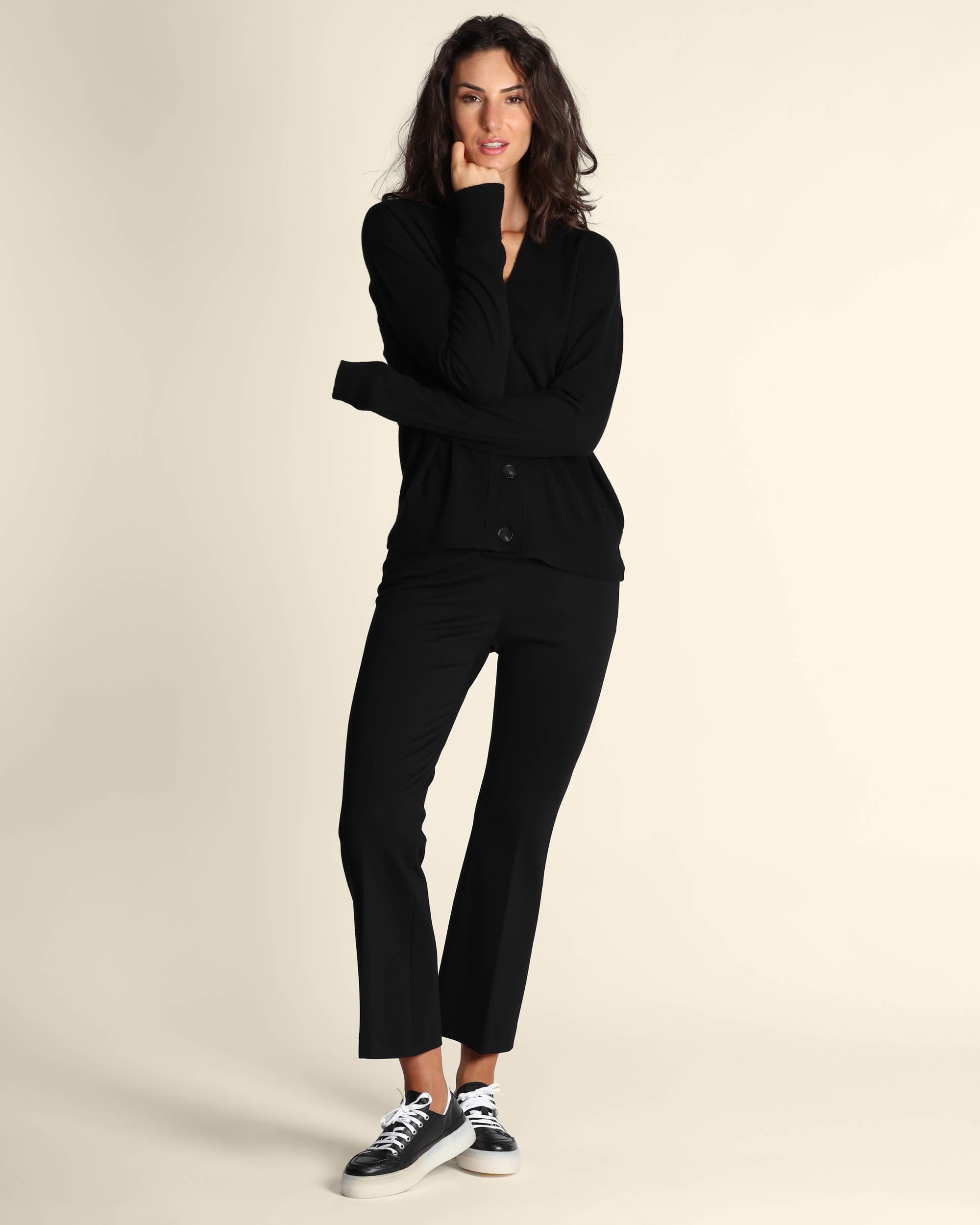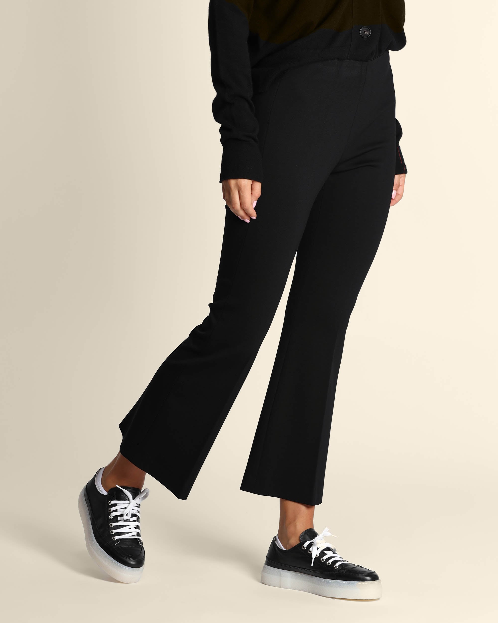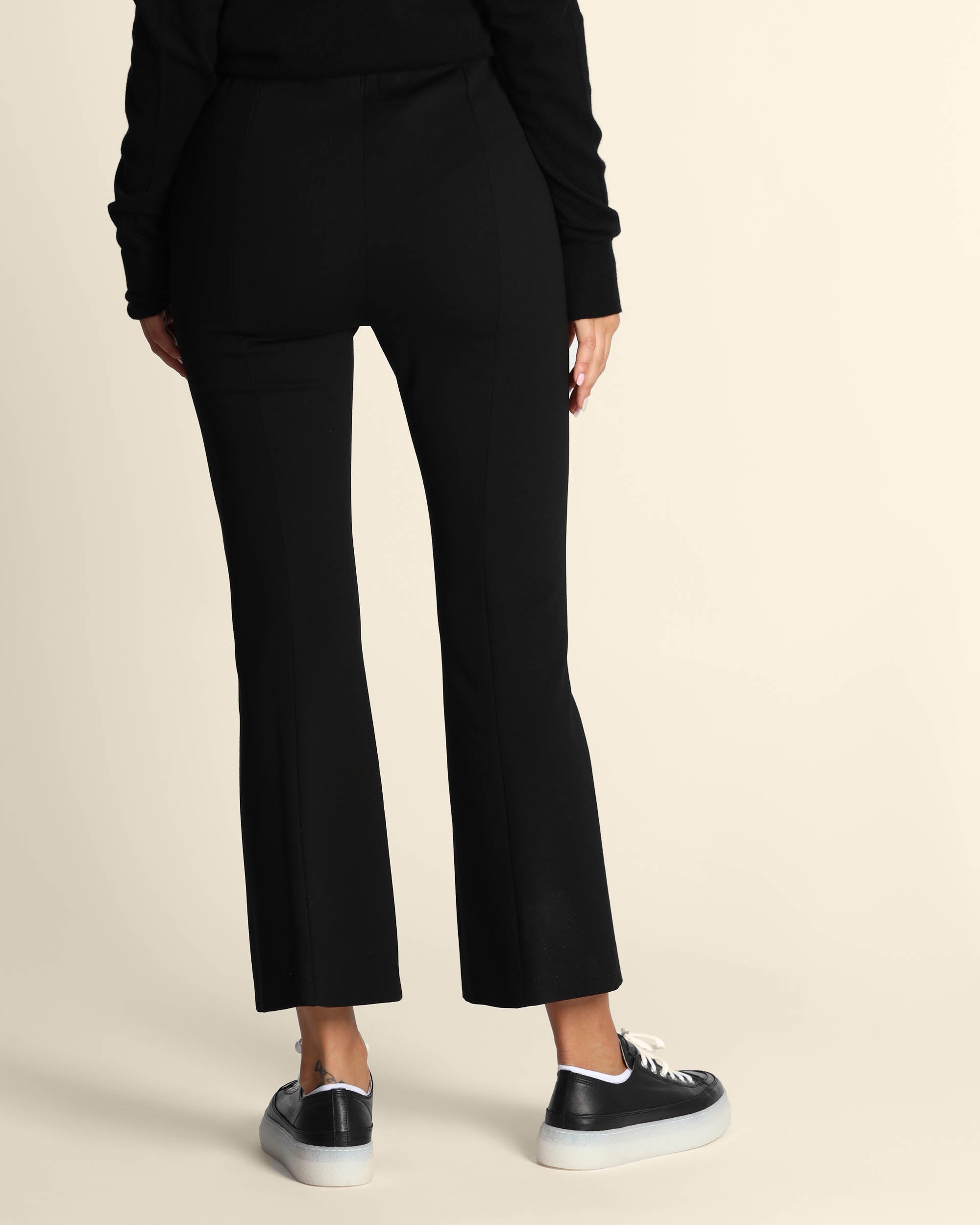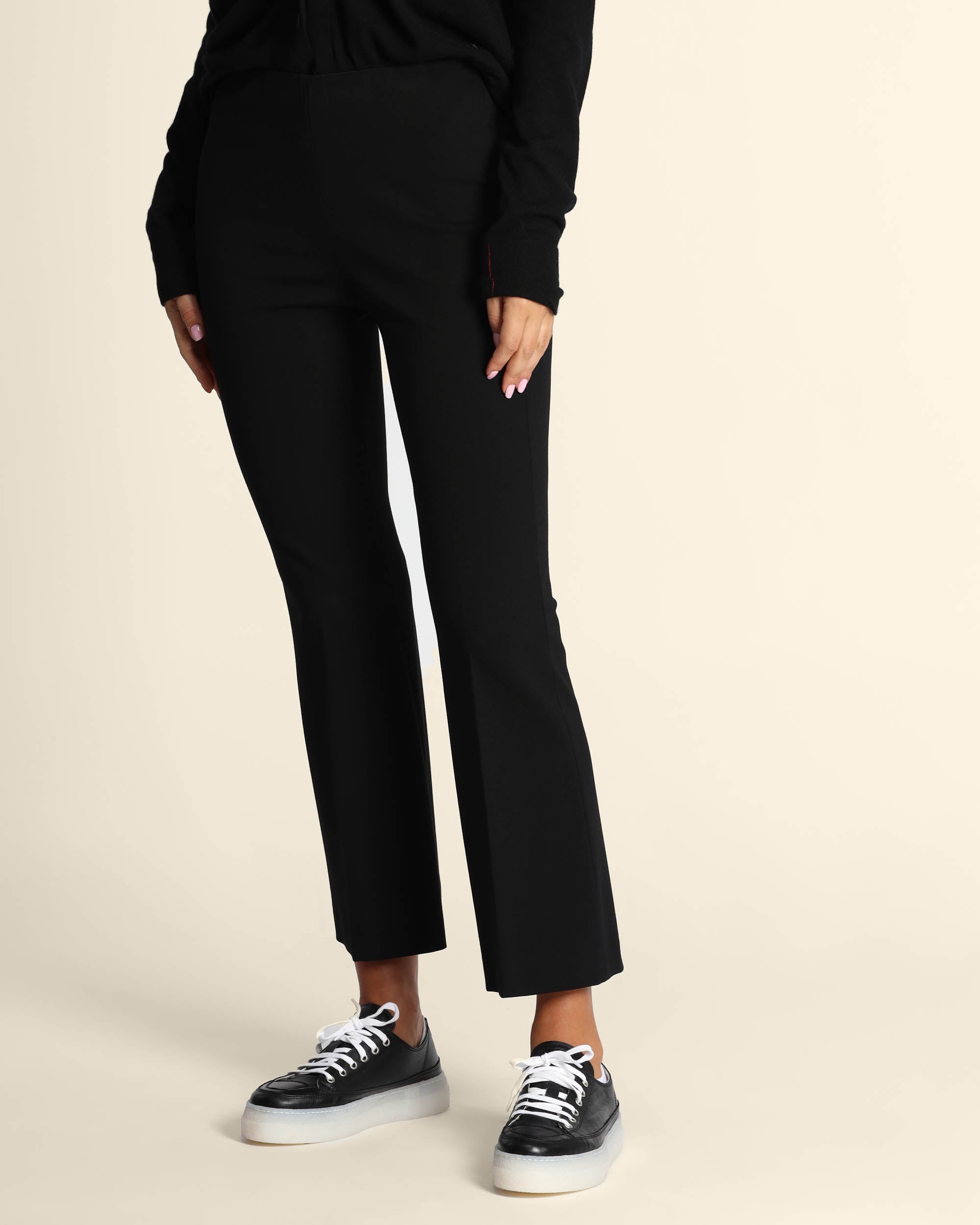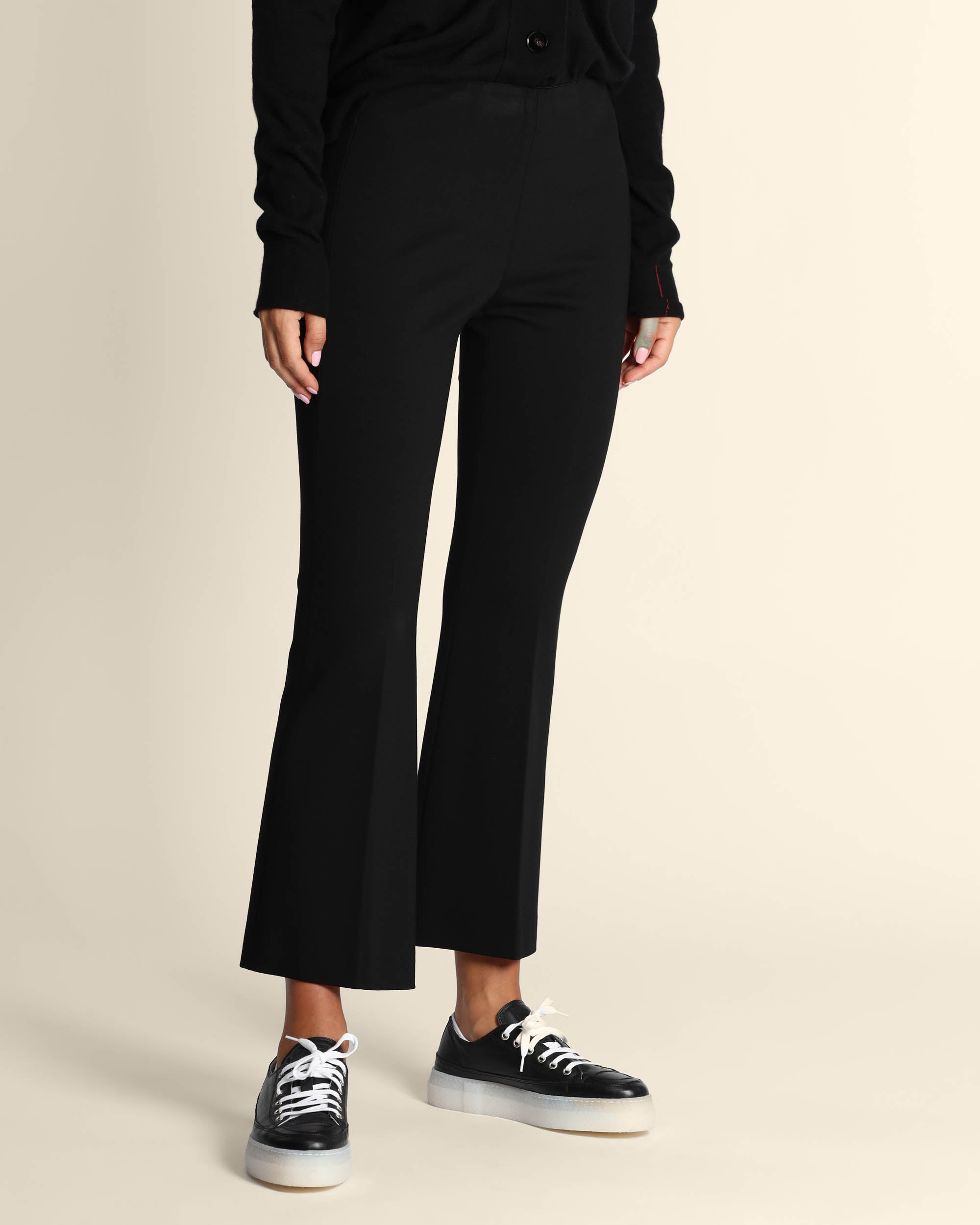 Pantaloni neri in punto Milano di misto viscosa stretch, vita elastica, linea a trombetta, piega stirata, made in Italy, Elisa indossa una tg.42, Elisa ha le seguenti misure: altezza 179, seno 84, vita 63, fianchi 94, collezione donna Liviana Conti Autunno Inverno 2025/26