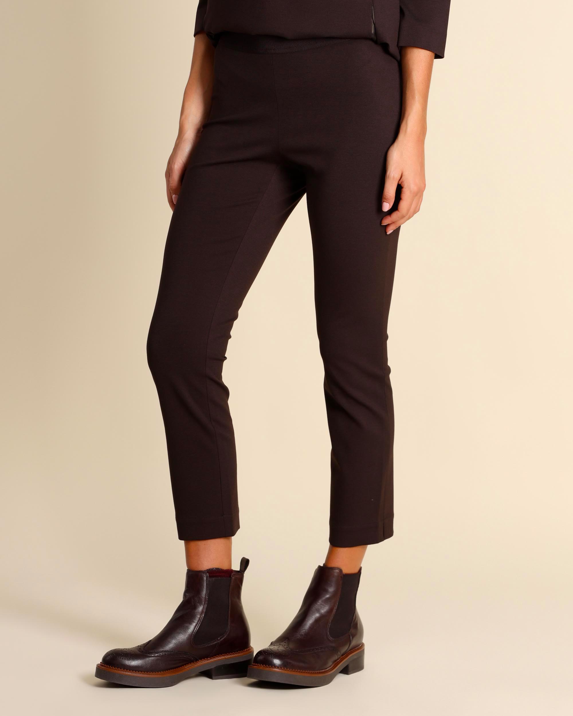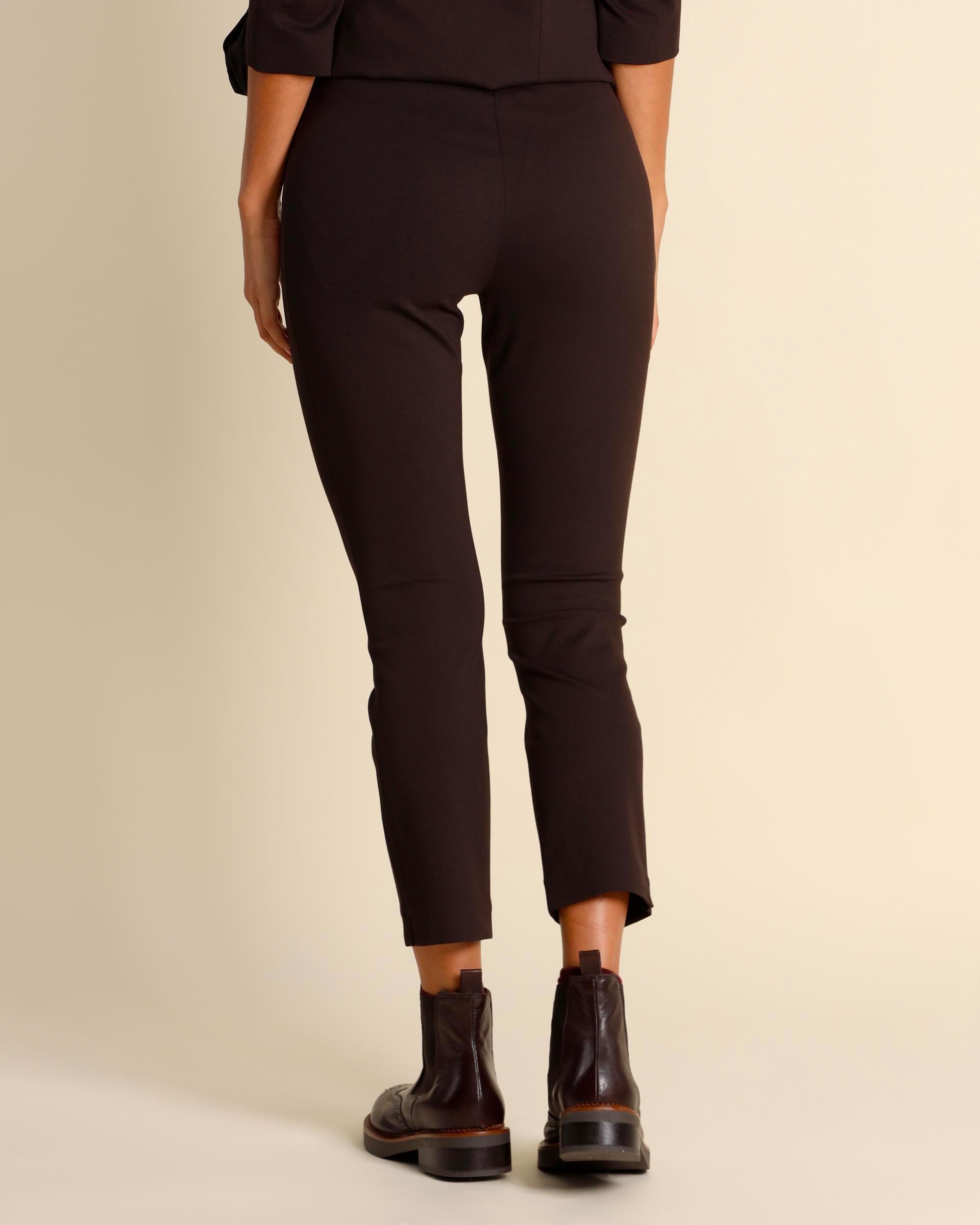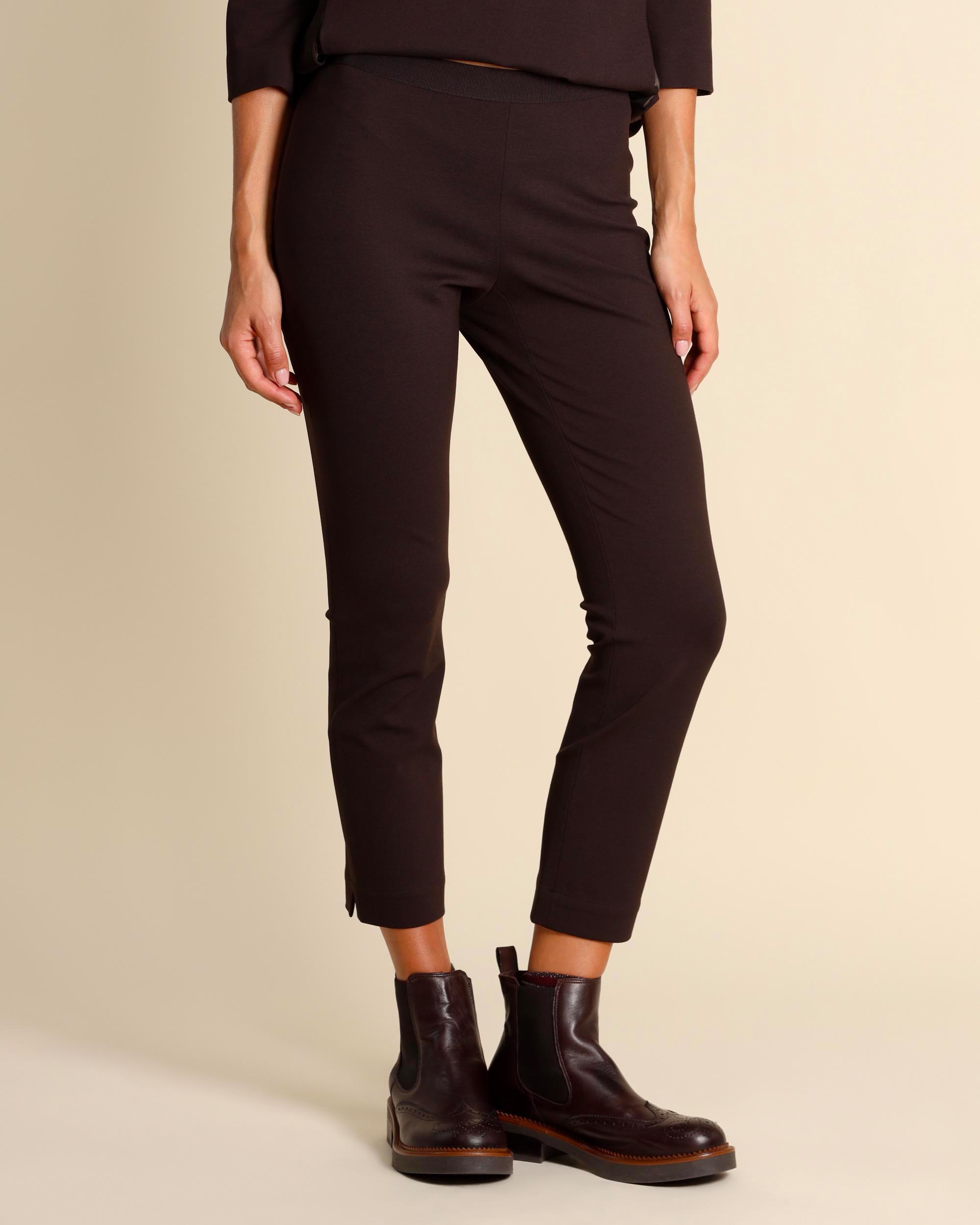 Pantaloni testa moro in punto Milano di misto viscosa stretch, vita con elastico a vista, linea slim, piccoli spacchi laterali sul fondo, made in Italy, la modella indossa una tg.42, la modella ha le seguenti misure: altezza 179, seno 84, vita 63, fianchi 94, collezione donna Liviana Conti Autunno Inverno 2025/26
