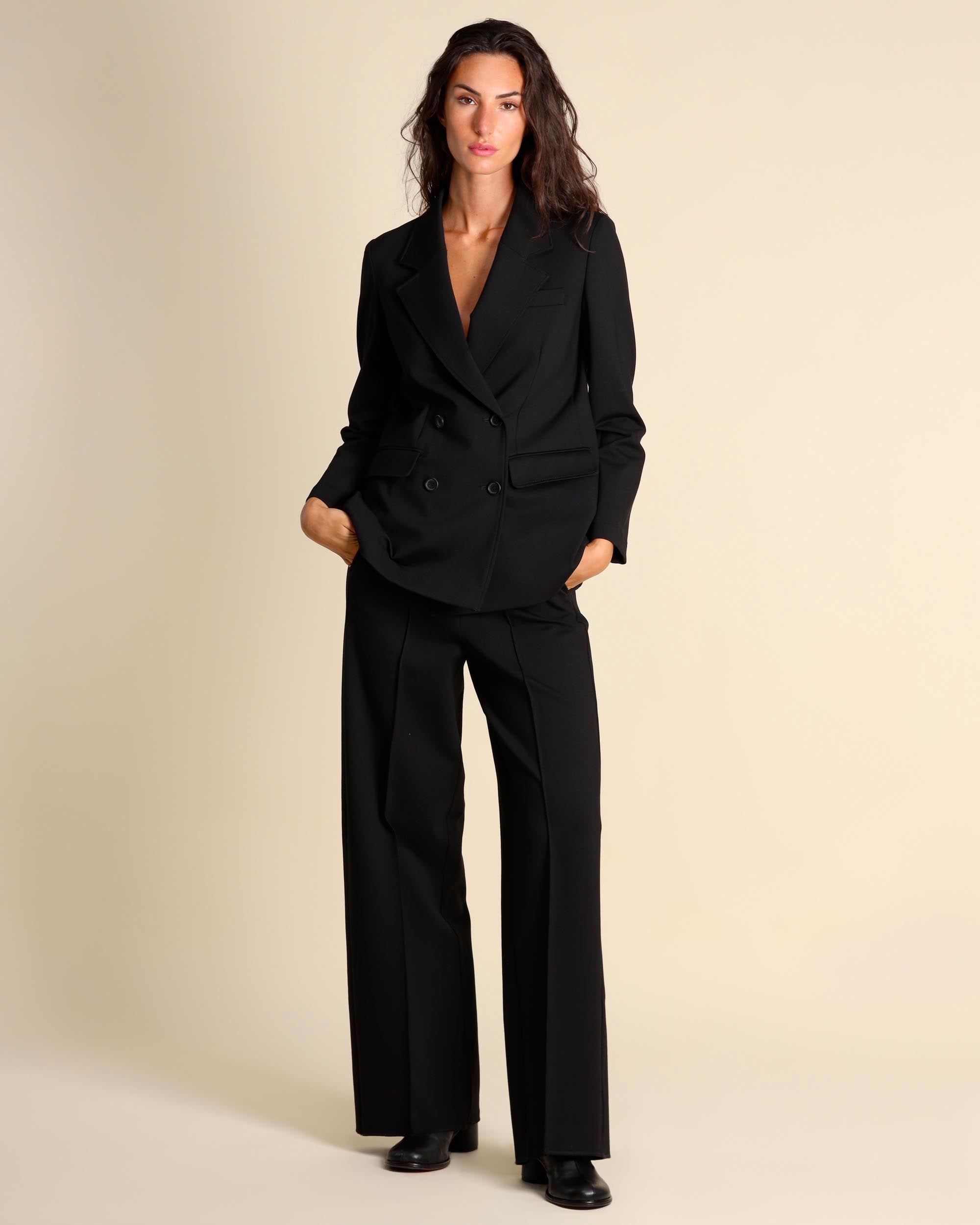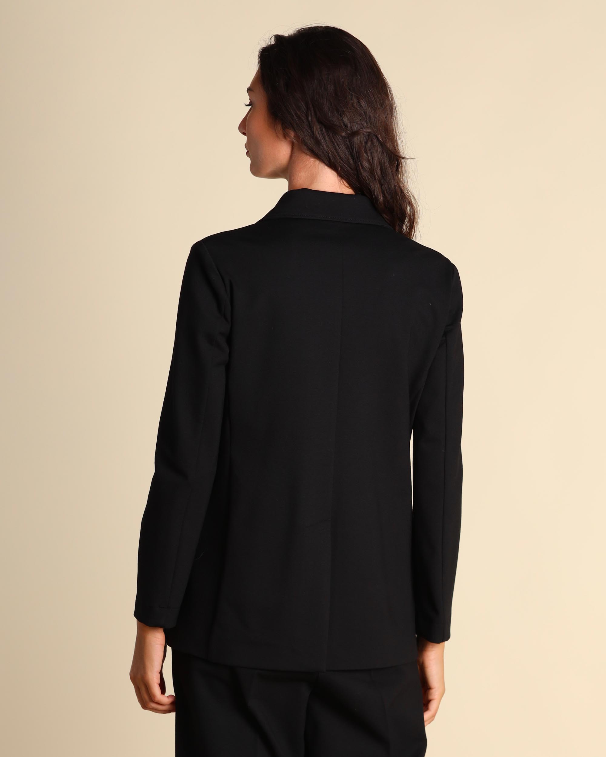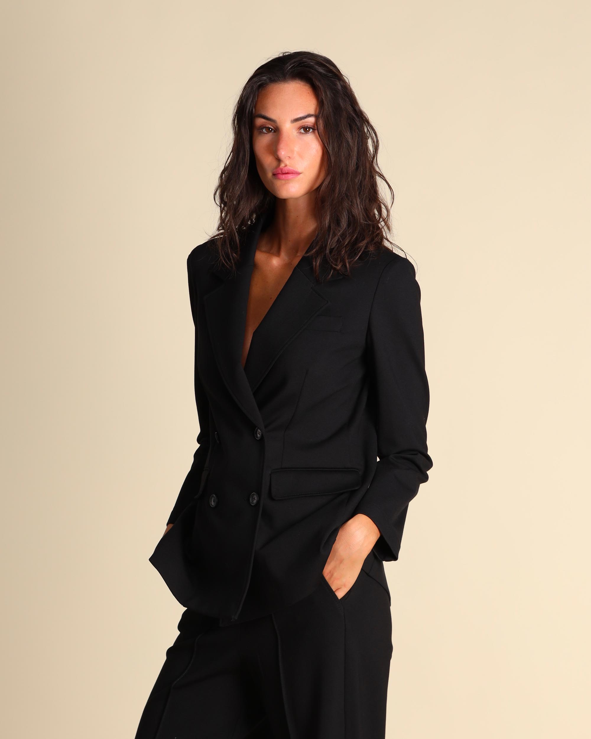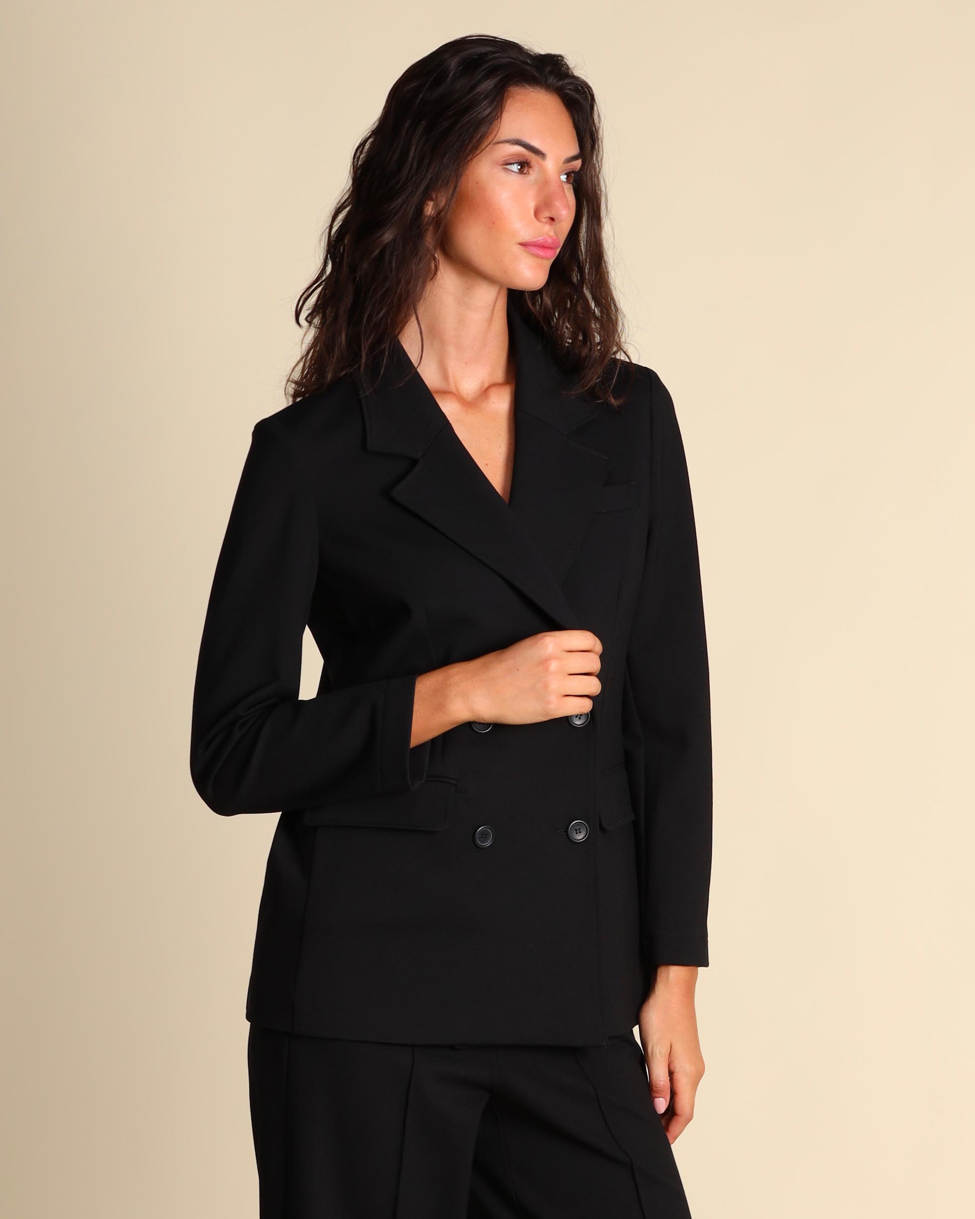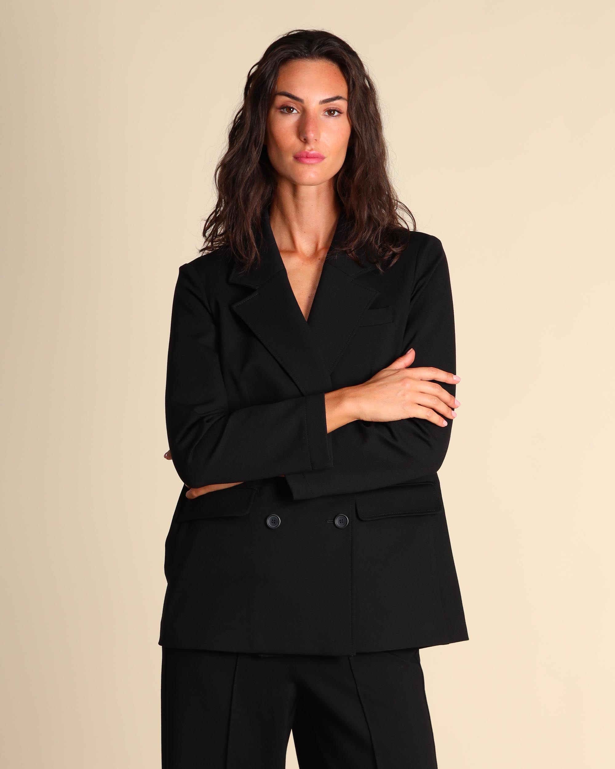 Giacca doppiopetto nera in jersey di misto viscosa stretch a punto Milano, collo a rever, maniche lunghe, chiusura con bottoni, linea dritta, tasche con patta e taschino a filetto, sfoderata, la modella indossa una tg.42, la modella ha le seguenti misure: altezza 178, seno 86,vita 65, fianchi 93, collezione donna Pennyblack Autunno Inverno 2025/26