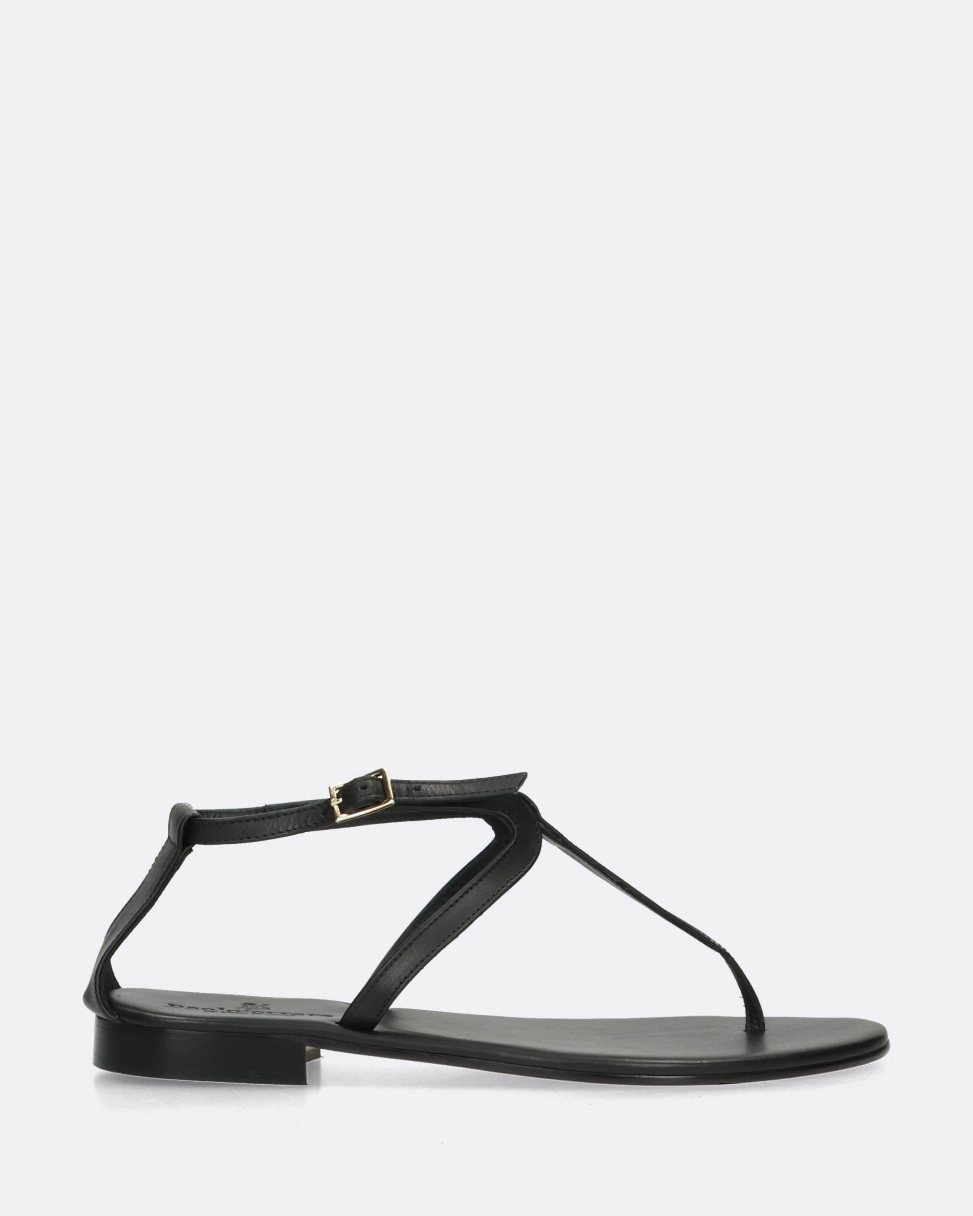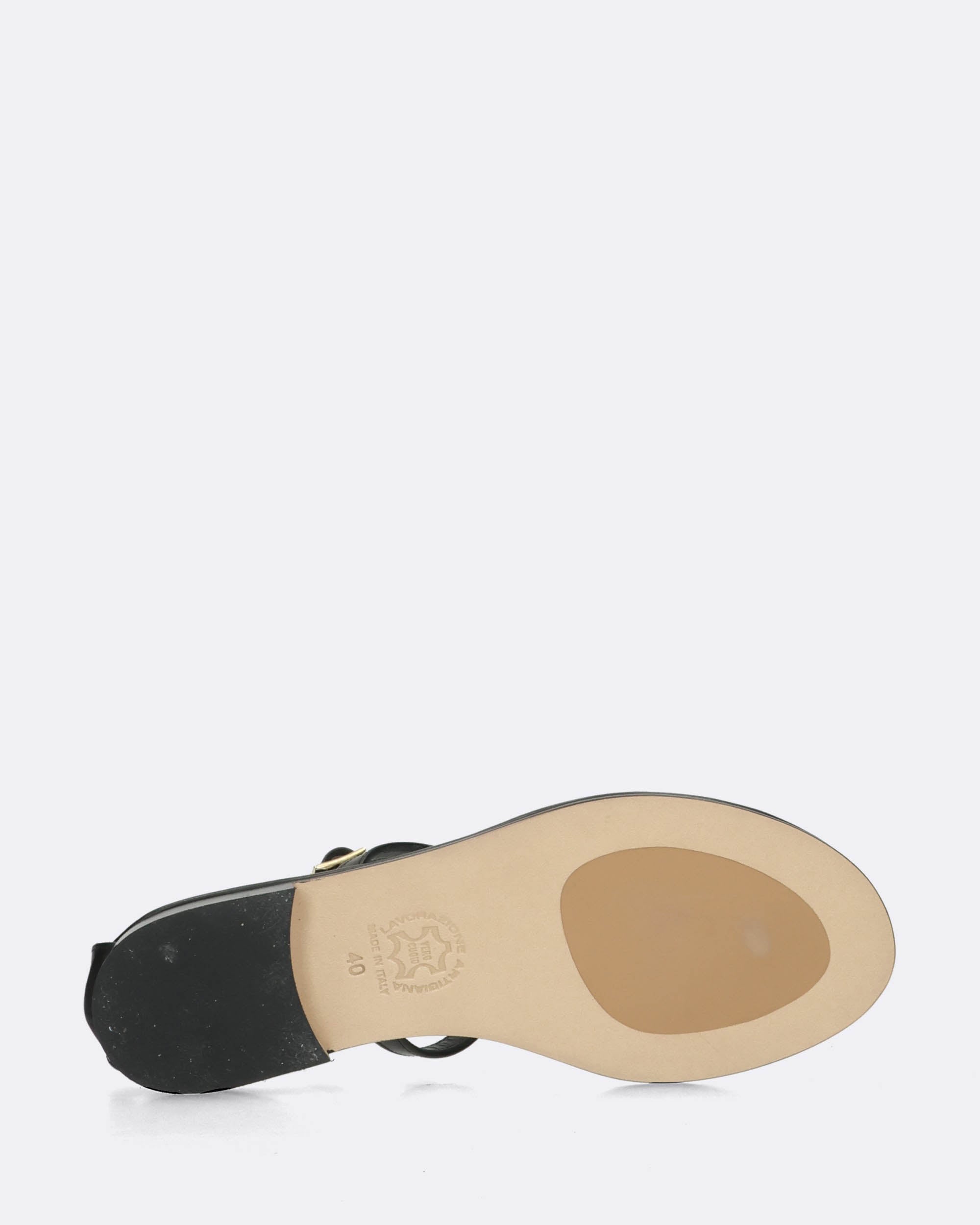 Sandali bassi in pelle nera, tacco 20mm, sottopiede in pelle, suola in cuoio con inserto in gomma, infradito, cinturino regolabile con fibbia, made in Italy, collezione donna Paolo Ferrara Primavera Estate 2025