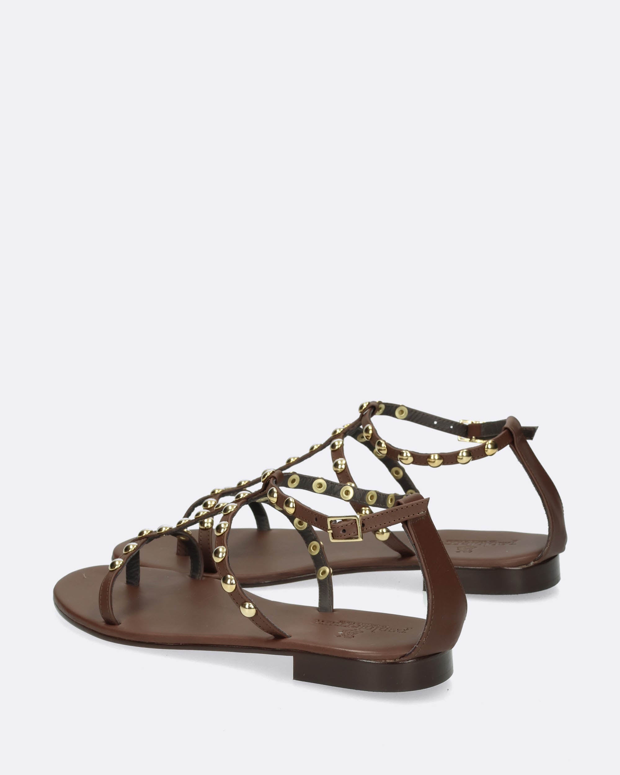 Sandali bassi in pelle testa moro con borchie oro, tacco 20mm, sottopiede in pelle, suola in cuoio con inserto in gomma, infradito, cinturino regolabile con fibbia, made in Italy, collezione donna Paolo Ferrara Primavera Estate 2025