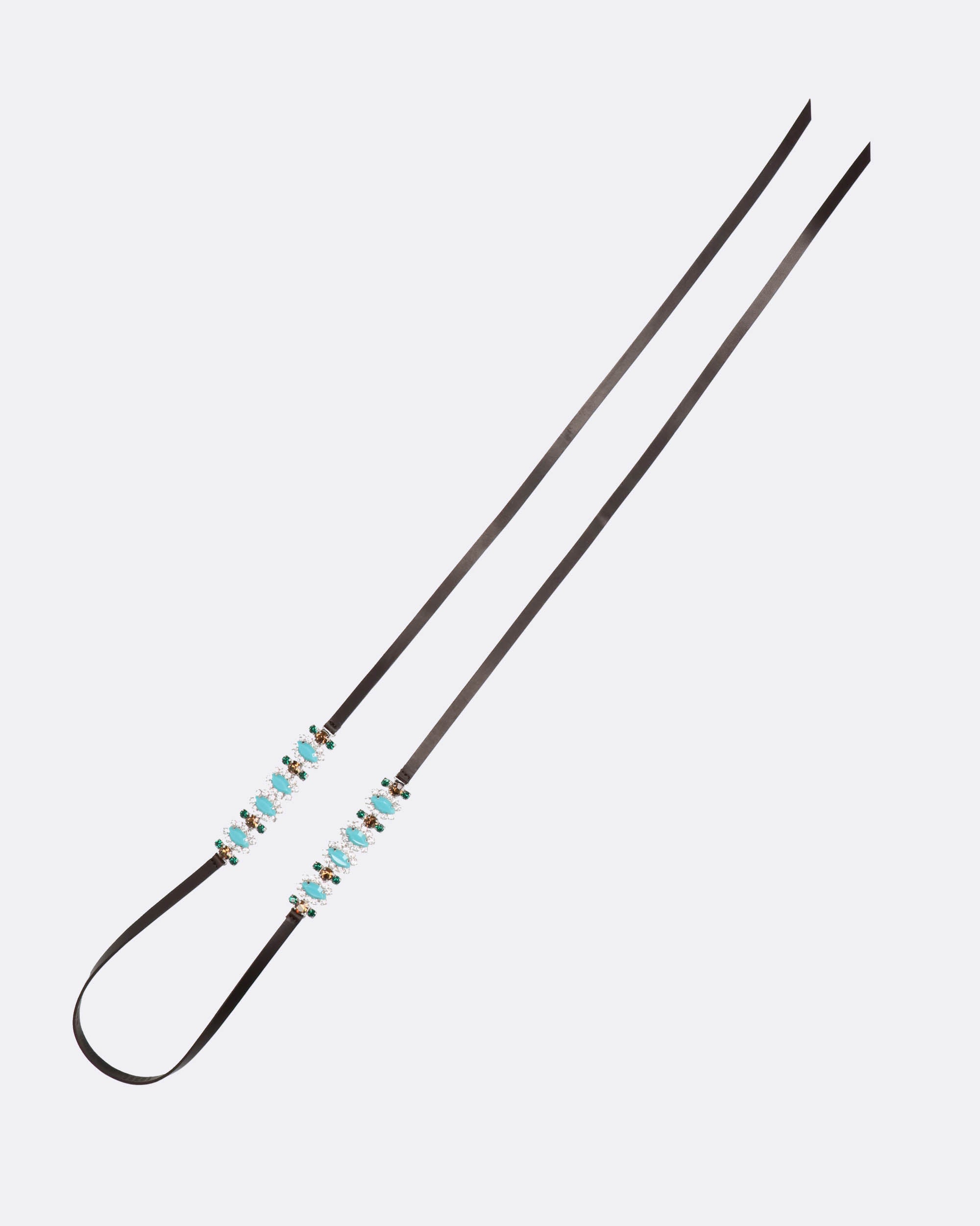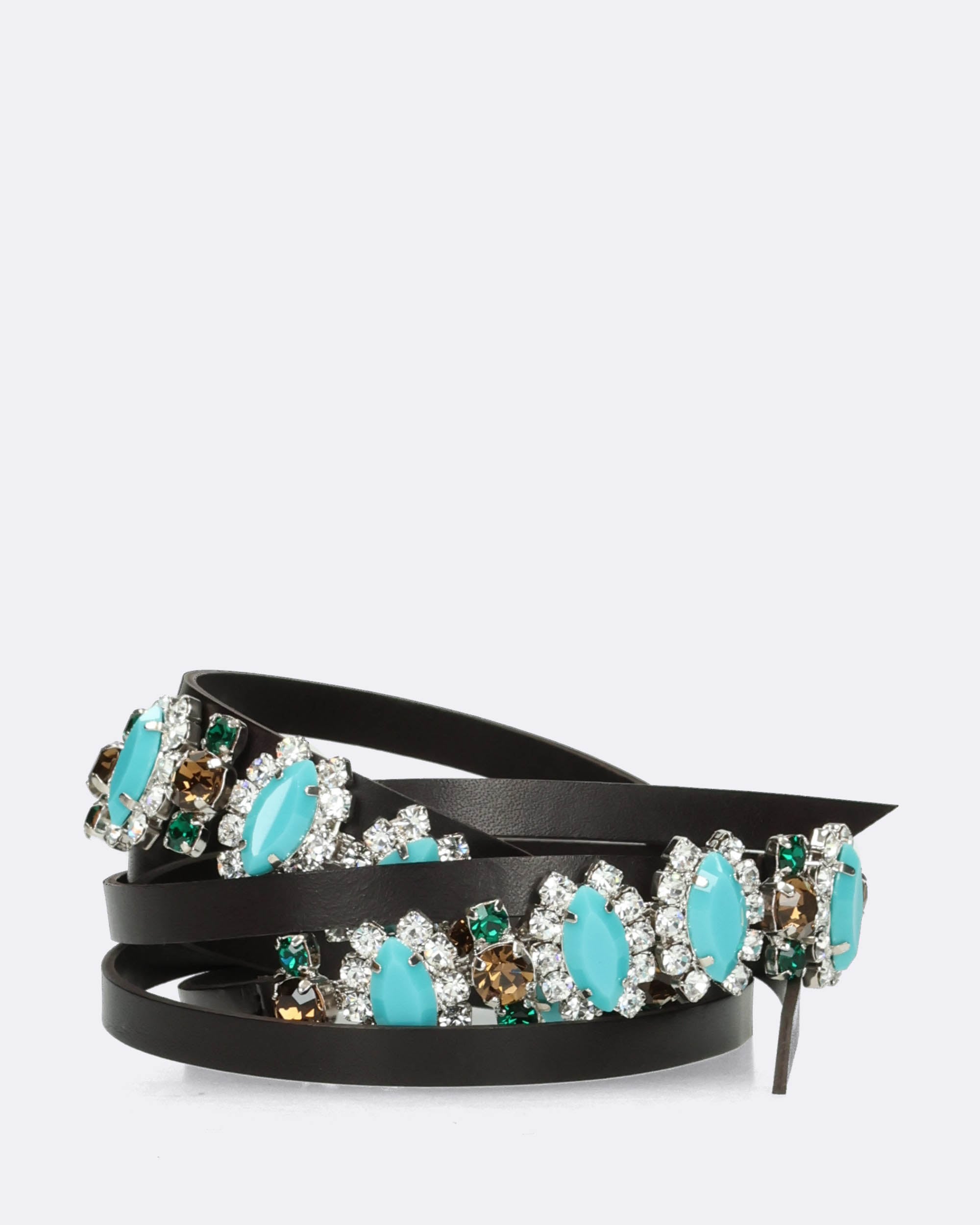 Cintura gioiello in cuoio color testa moro, dettagli finiture argento inglese con turchesi e strass, senza fibbia, da annodare, altezza 0.8 cm, made in Italy, collezione donna Orciani
