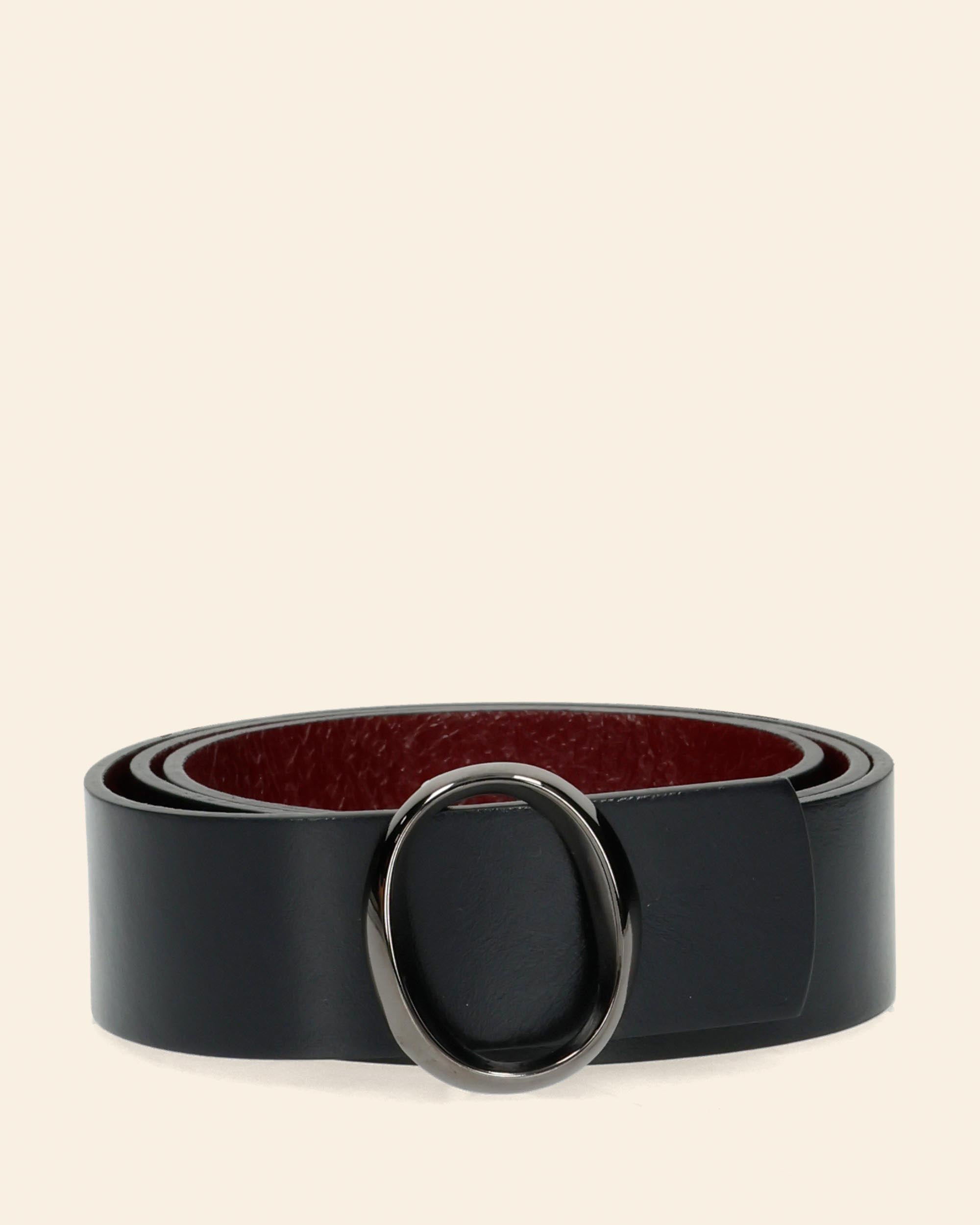 Cintura in pelle finish lucido reversibile nere e Chianti, altezza 3.5 cm, fibbia monogram con finitura canna di fucile lucido, made in Italy, collezione donna Orciani