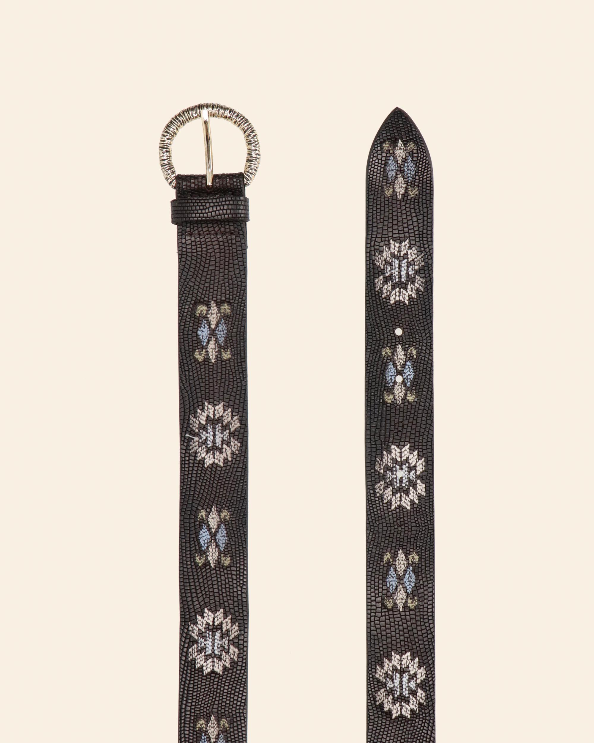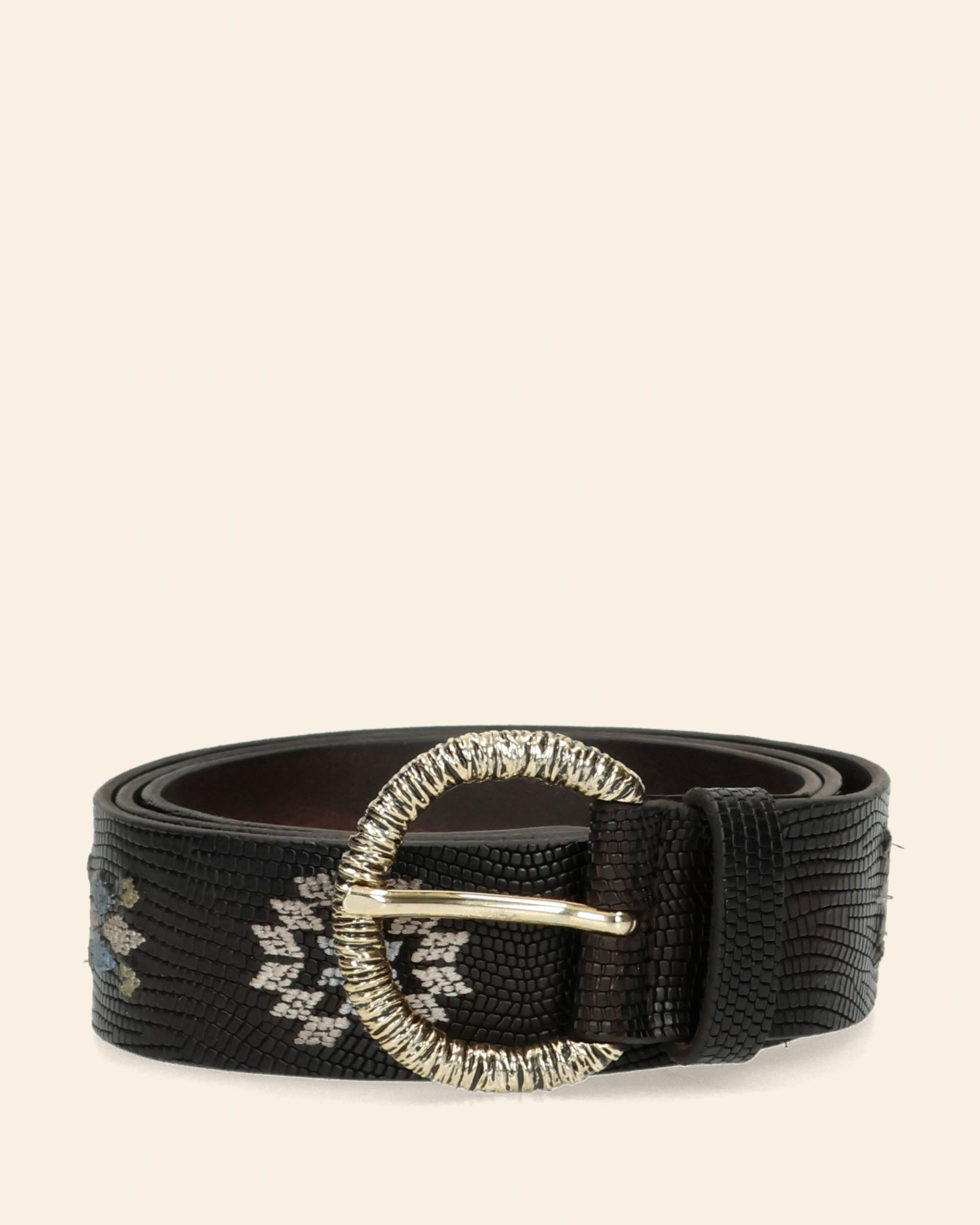 Cintura in cuoio stampato nero con ricami, altezza 3.5 cm, fibbia con finitura oro chiaro annerito, made in Italy, collezione donna Orciani