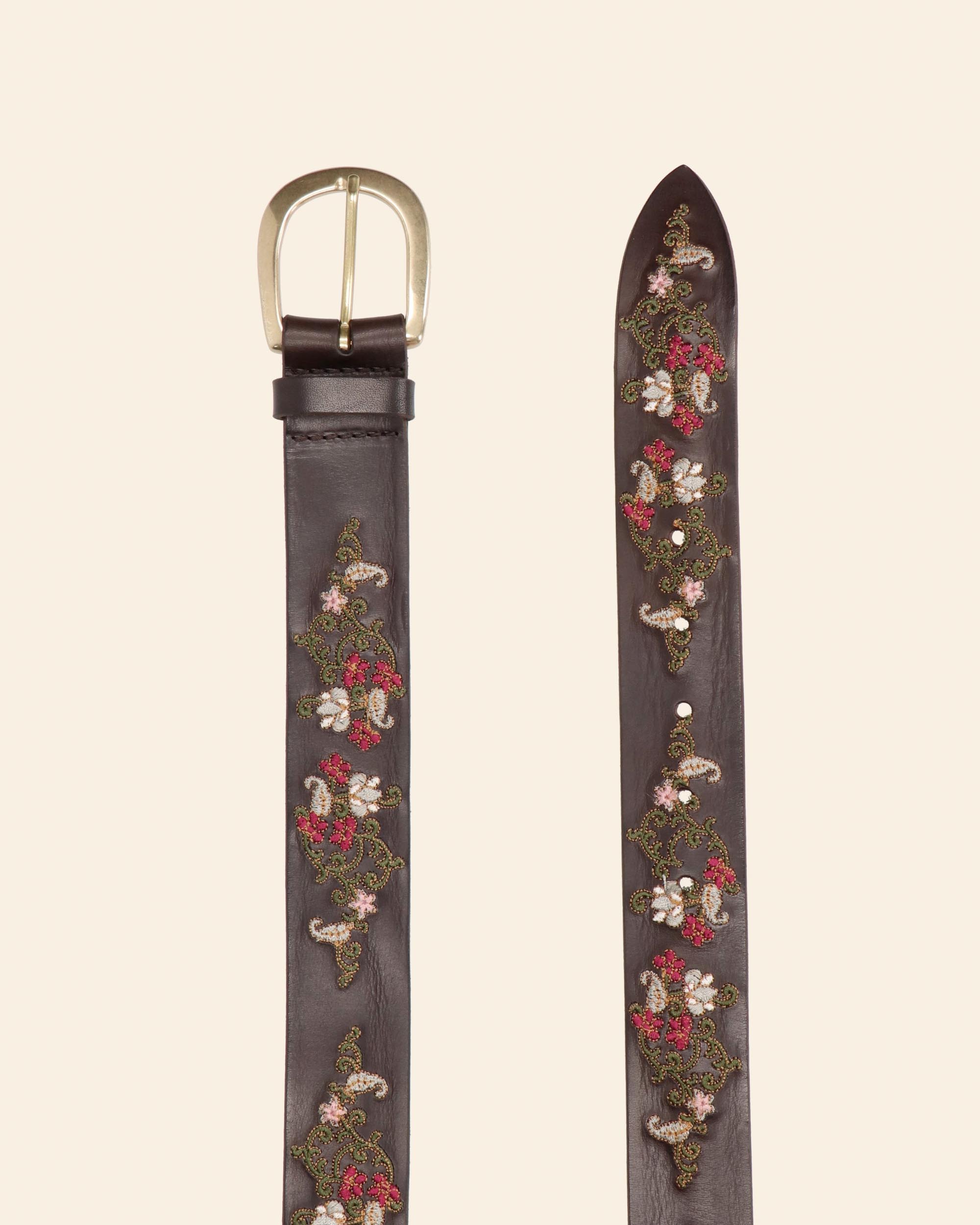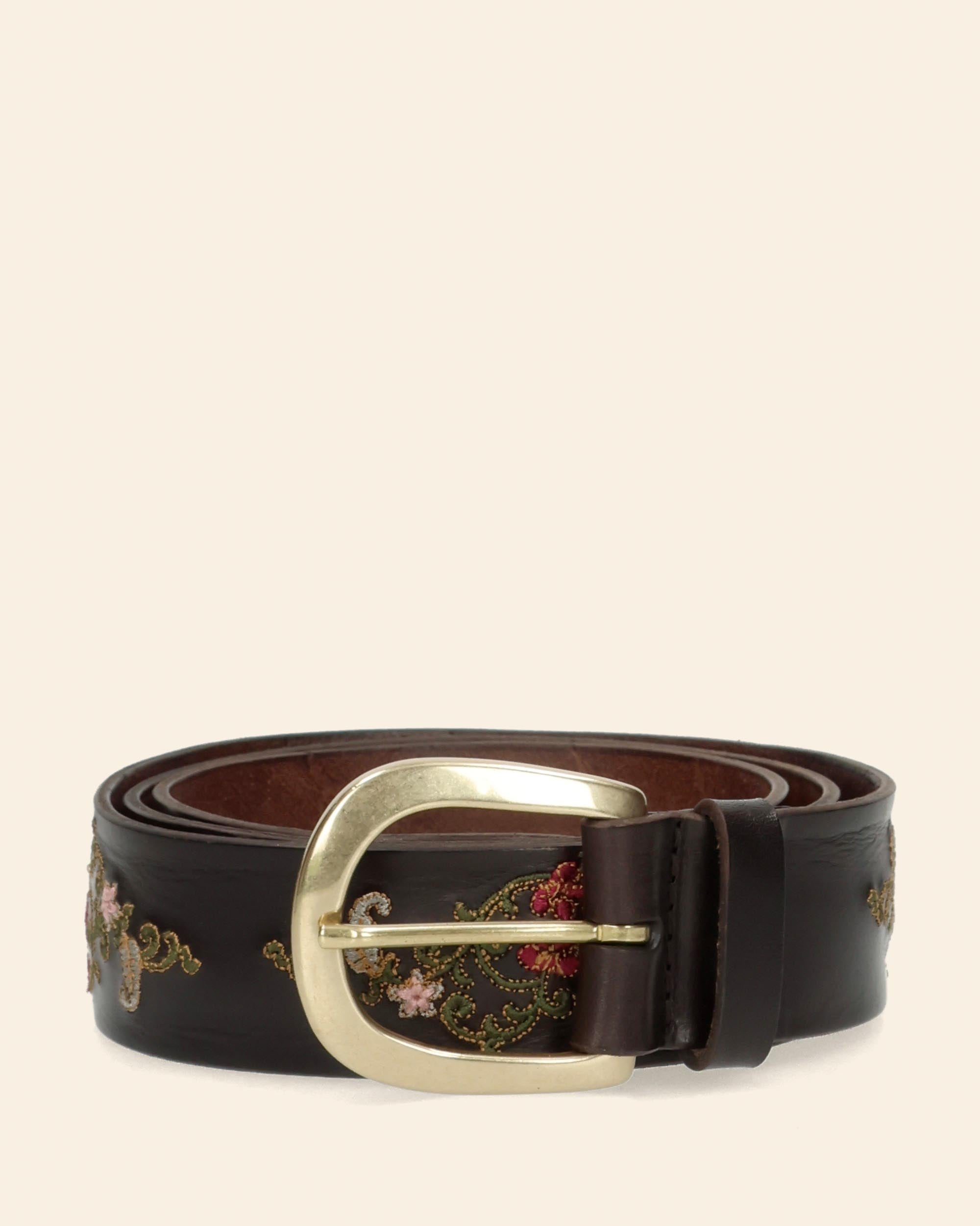 Cintura in cuoio schiacciato spazzolato testa moro con ricami, altezza 3.5 cm, fibbia con finitura ottone lucido, made in Italy, collezione donna Orciani