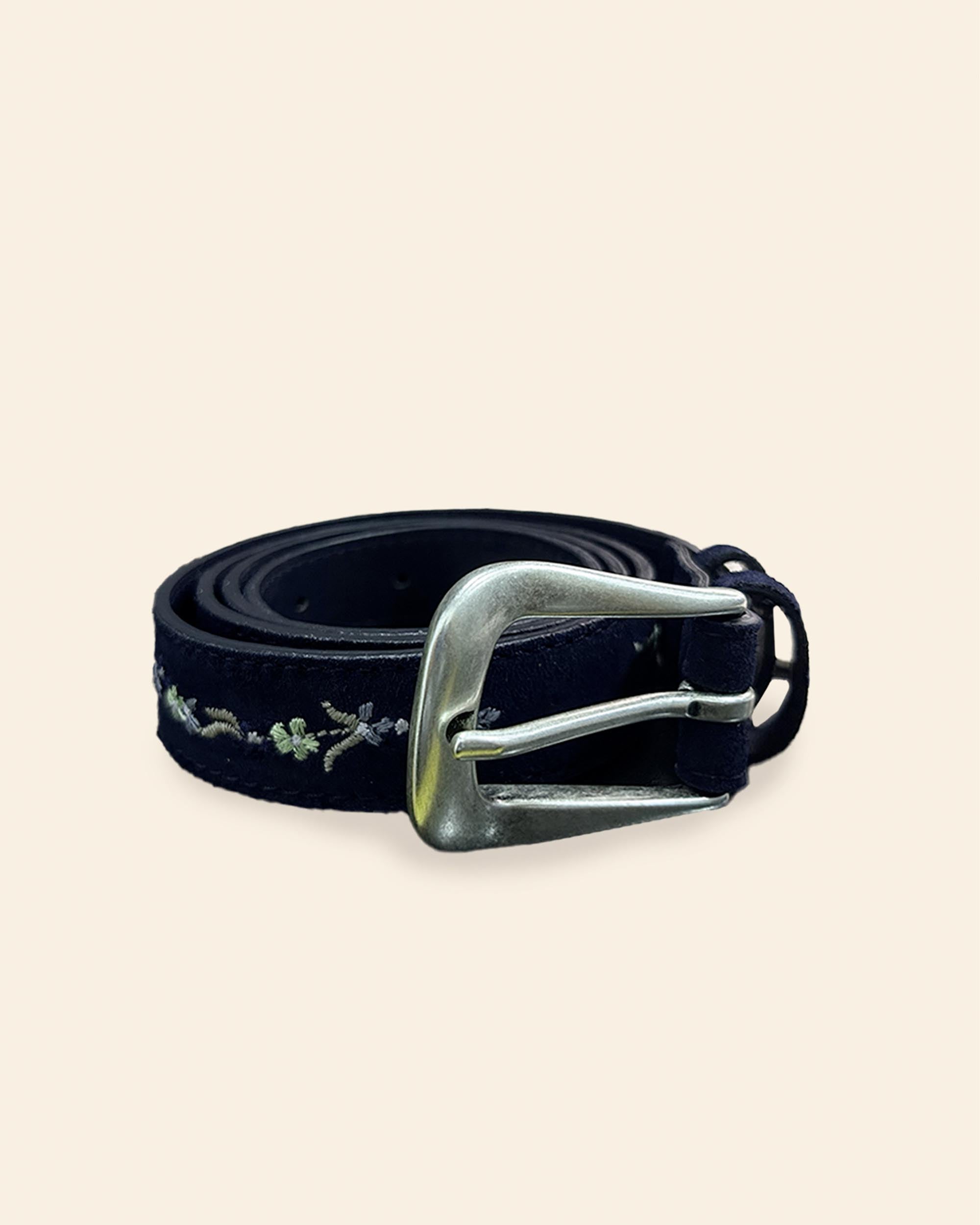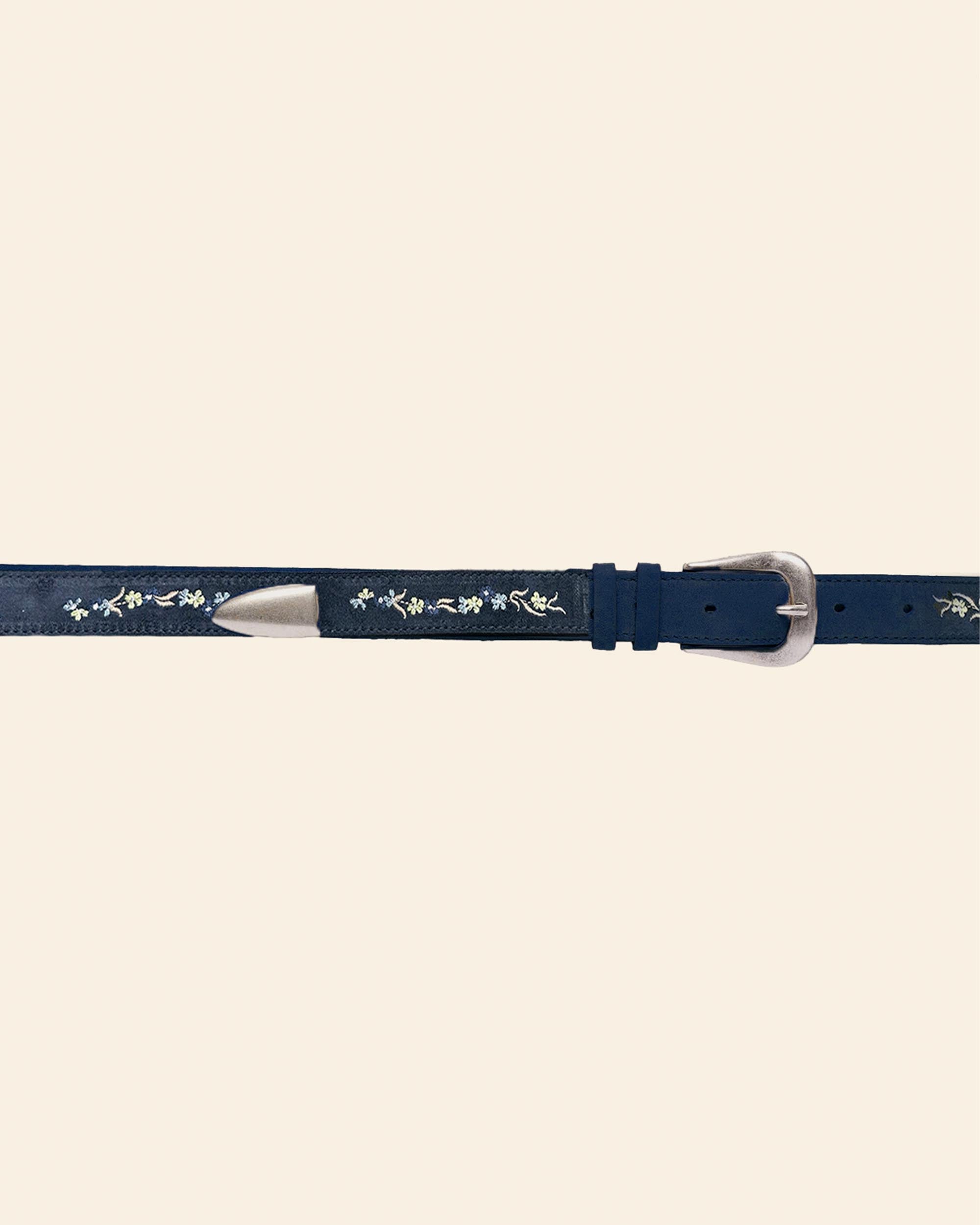 Cintura blu navy in suede con ricami, altezza 2cm, finiture fibbia e puntale argento inglese, made in Italy, collezione donna Orciani