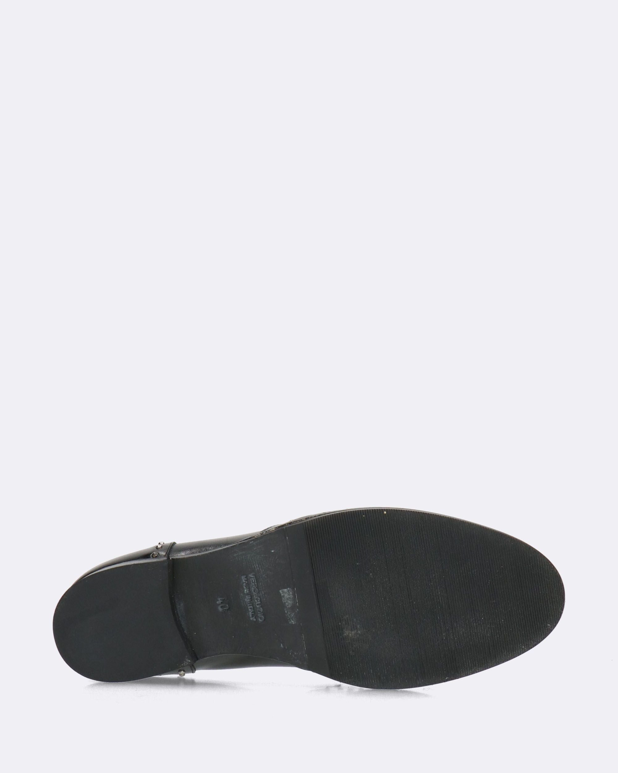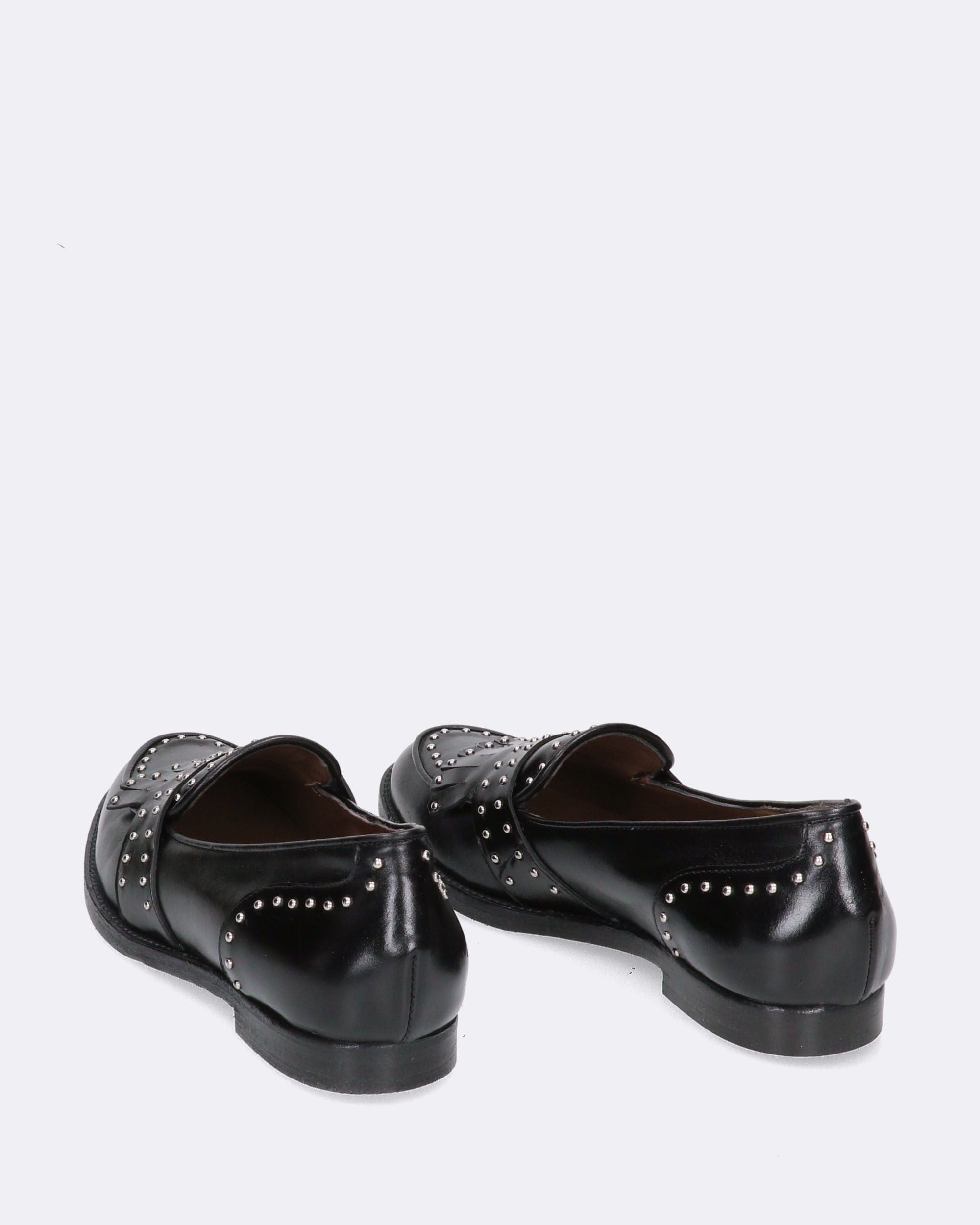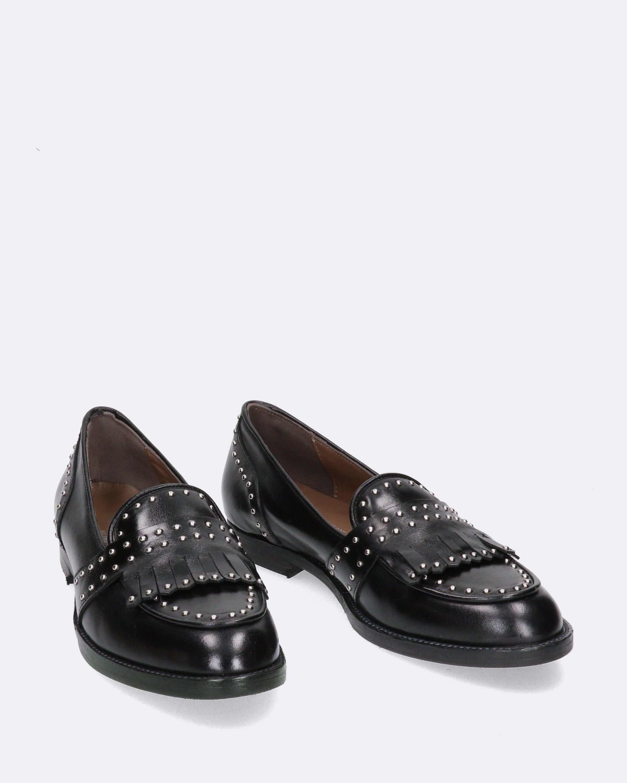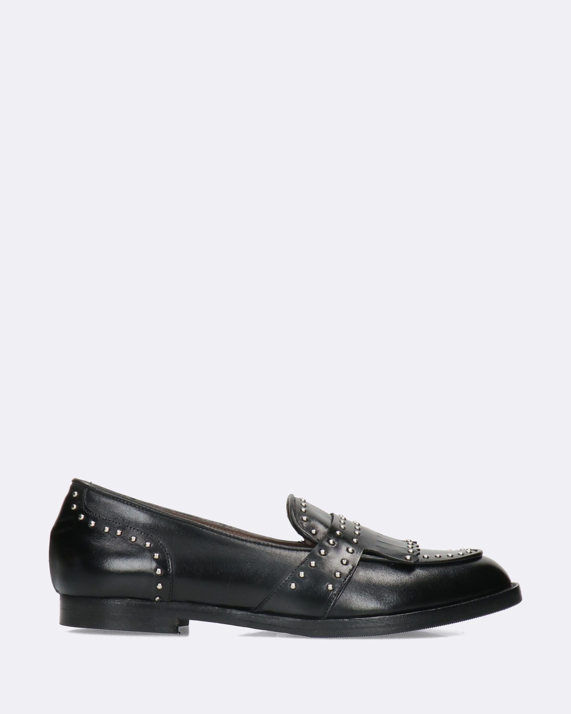 Mocassini in pelle nera con frangia e piccole borchie in naplak con cinturino, suola in cuoio con inserto in gomma, tacco 15mm, sottopiede in pelle, fodera in pelle, made in Italy, collezione donna Duccio del Duca Autunno Inverno 2024/25